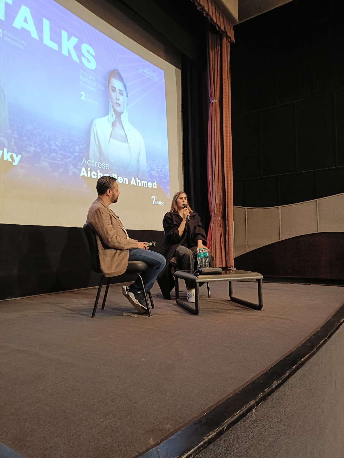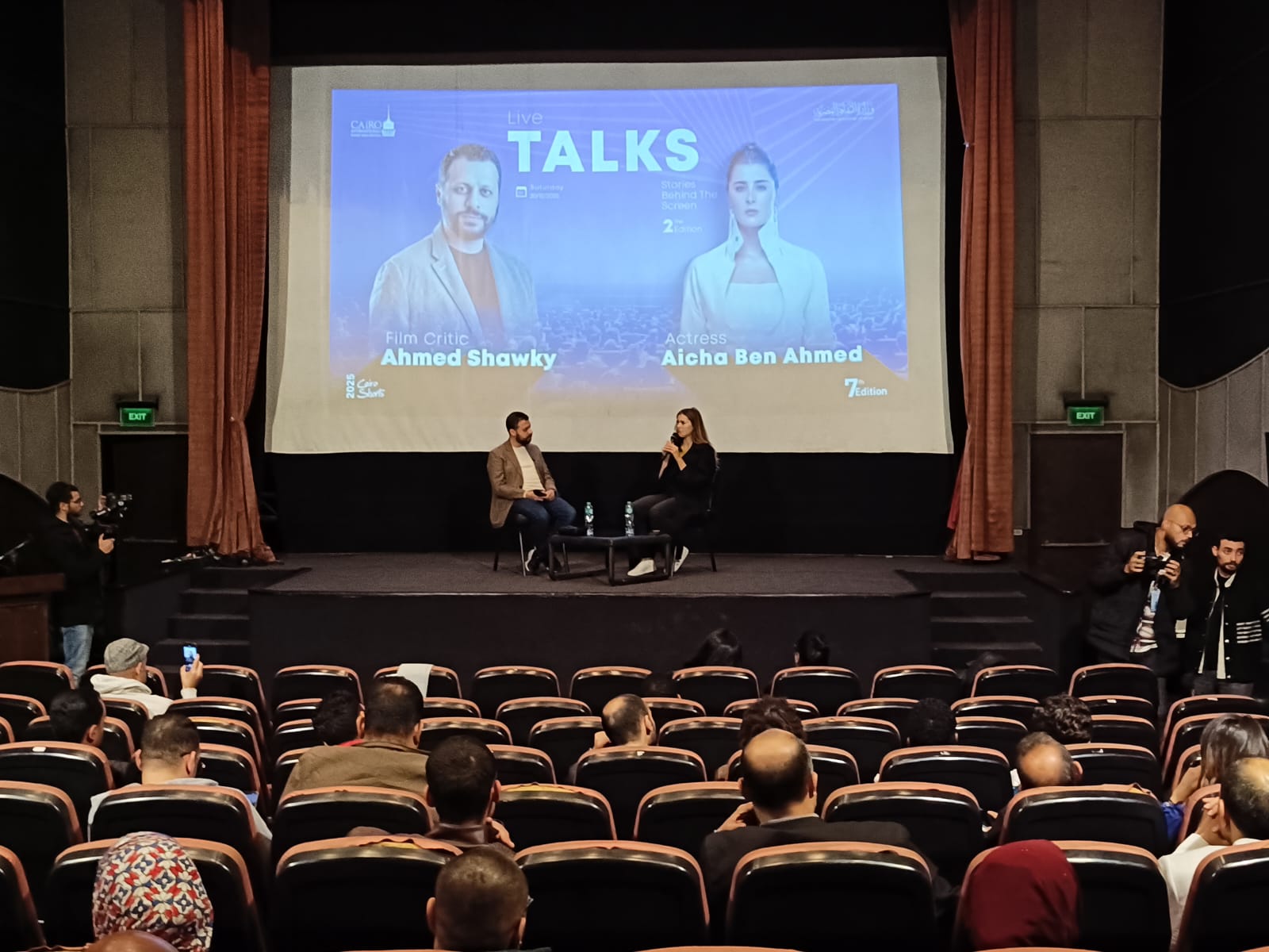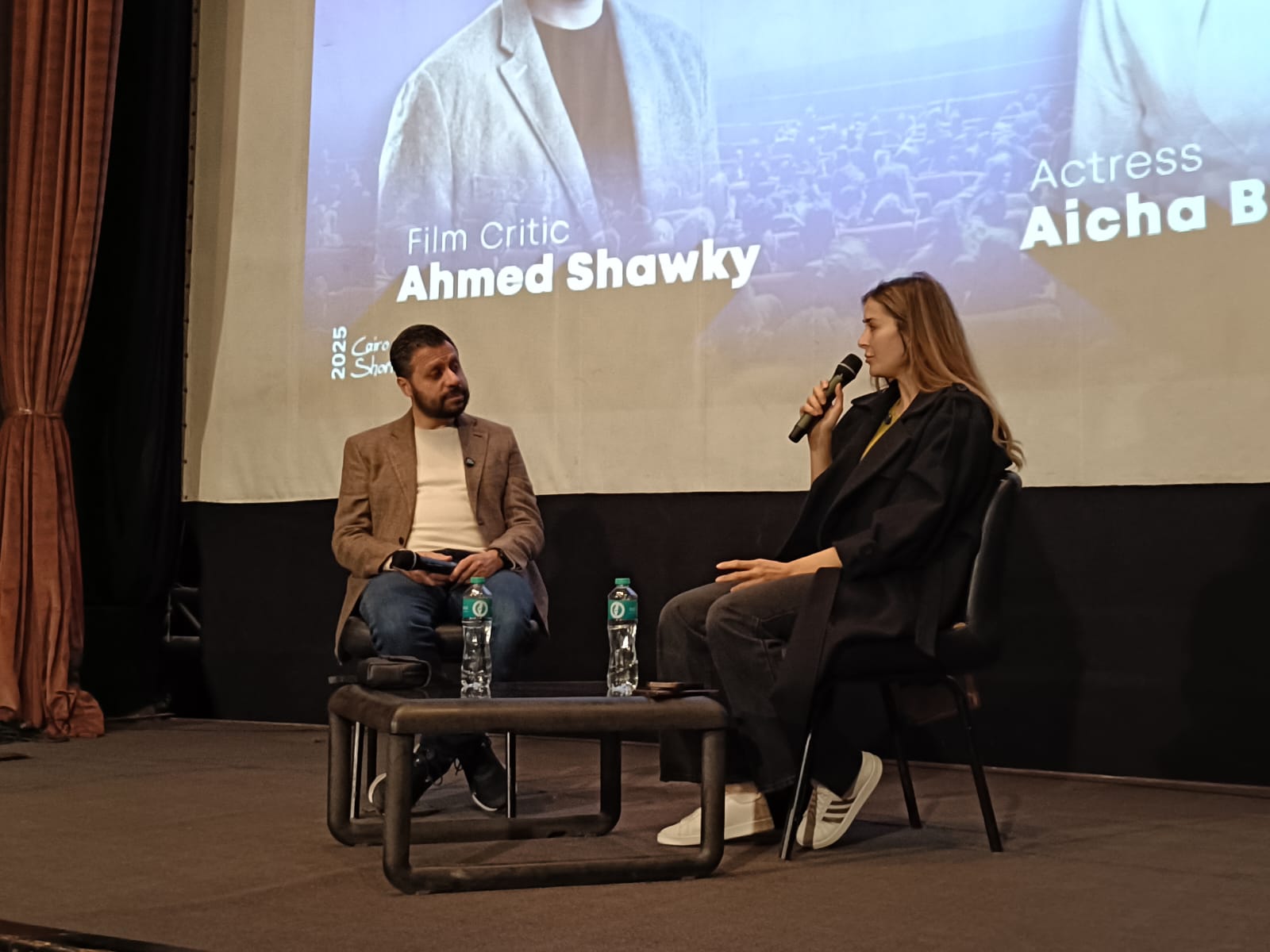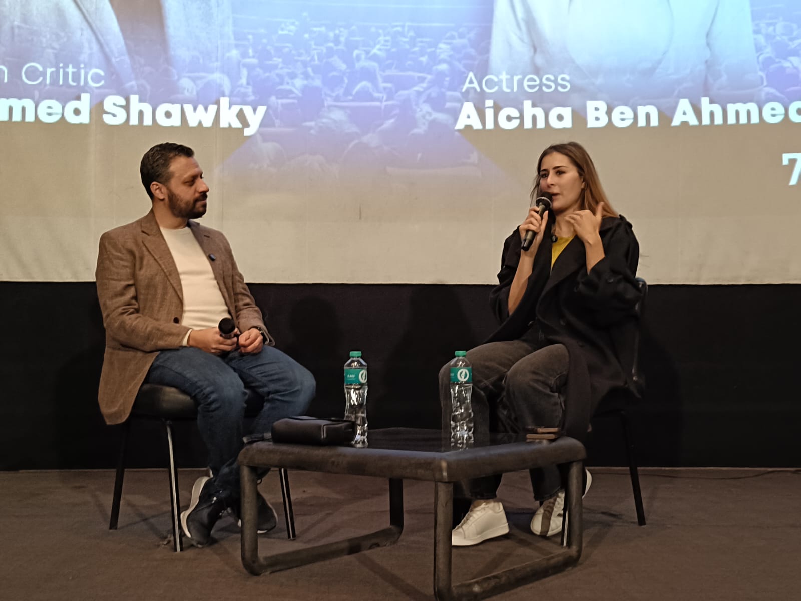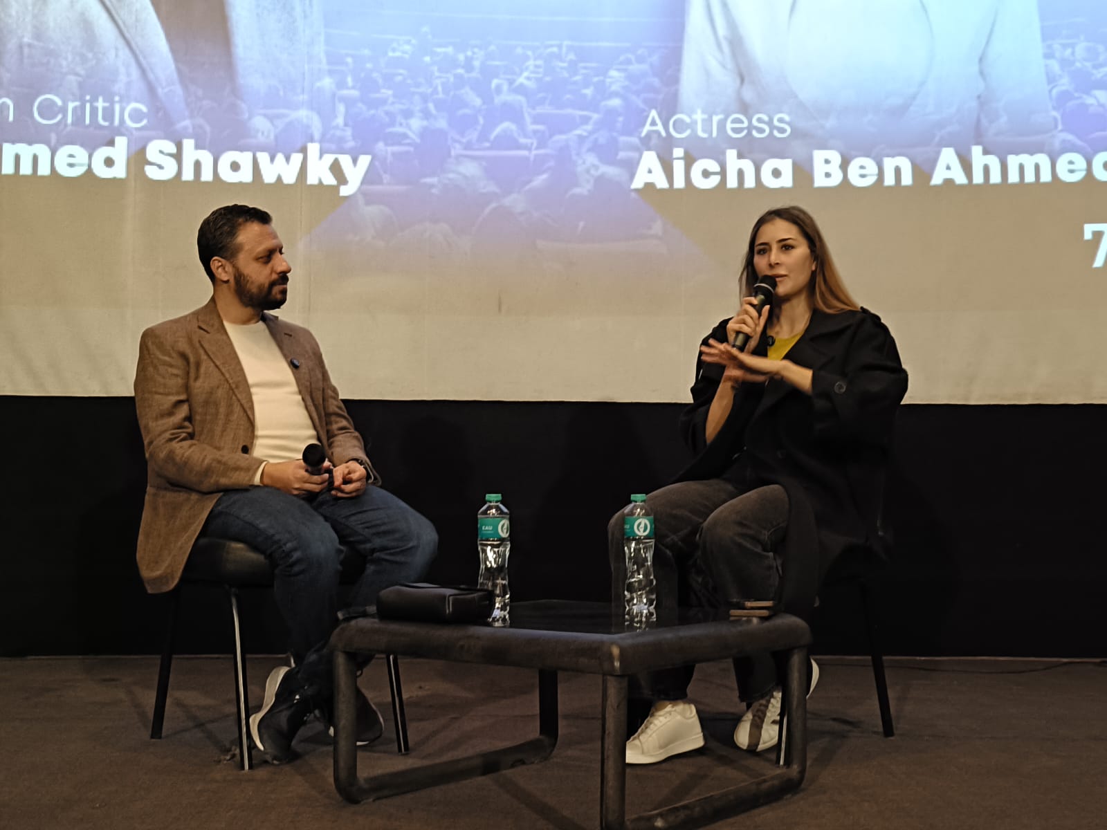 ضمن فعاليات الدورة السابعة من مهرجان القاهرة الدولي للفيلم القصير، استضاف مركز الإبداع الفني بدار الأوبرا المصرية حوارا مفتوحا جمع النجمة التونسية عائشة بن أحمد مع الناقد السينمائي أحمد شوقي، في لقاء إنساني وفني كشفت خلاله عن محطات مهمة في مسيرتها، وتفاصيل شخصية عن رحلتها بين تونس ومصر.