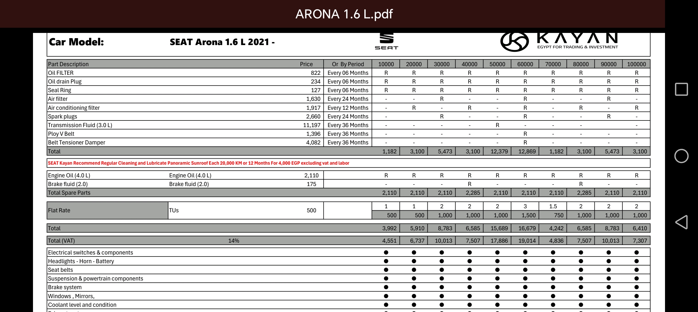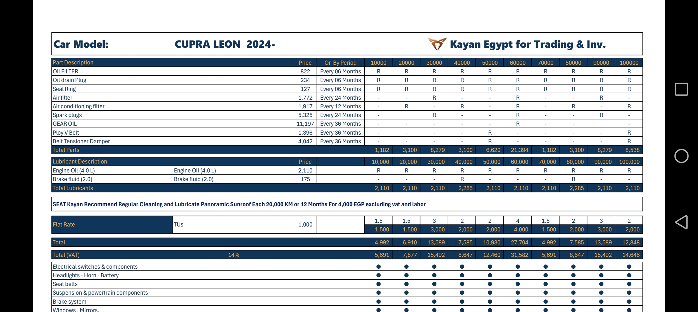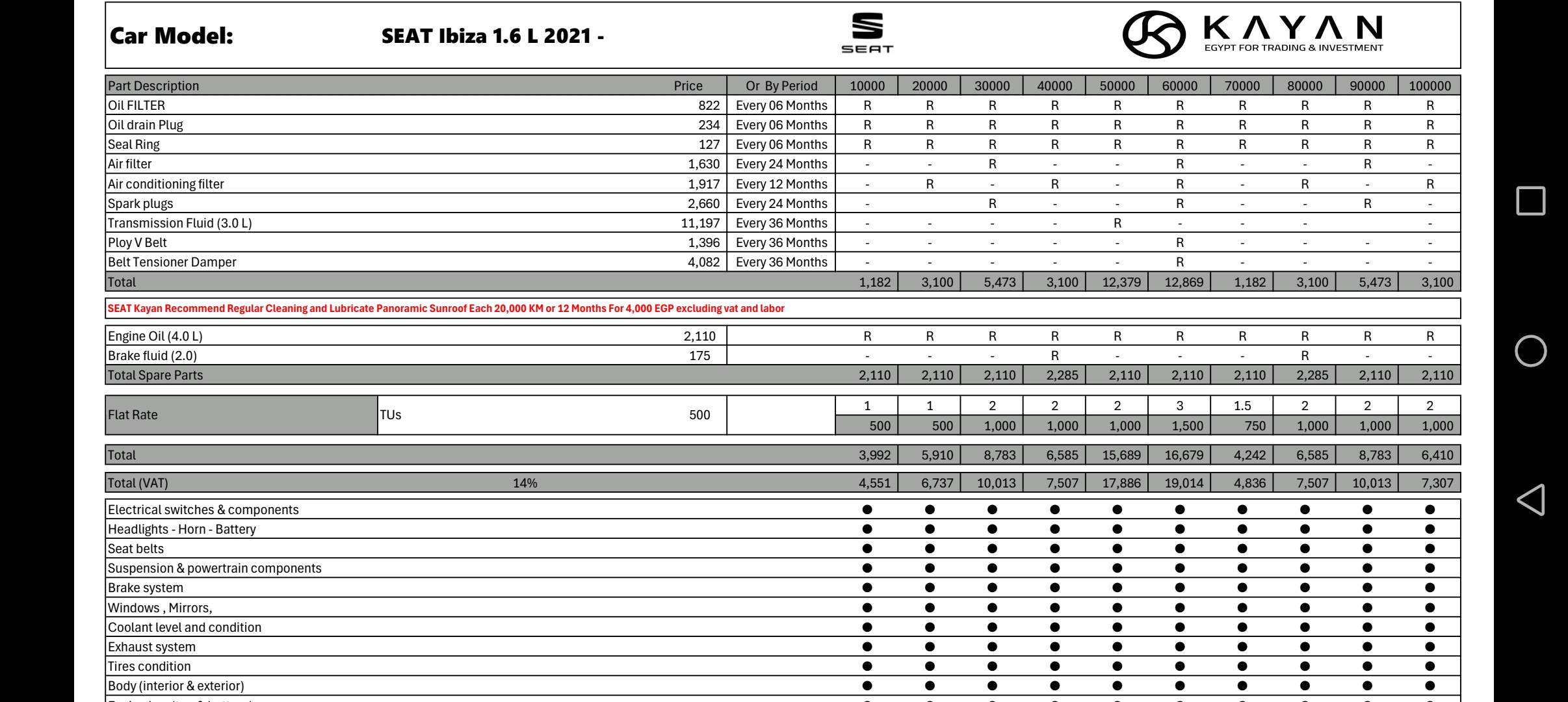تشمل الأسعار المعلنة في الجداول المرفقة قطع الغيار والمواد الاستهلاكية الأساسية لكل صيانة، بما في ذلك فلاتر الزيت، زيت المحرك وسائل الفرامل.