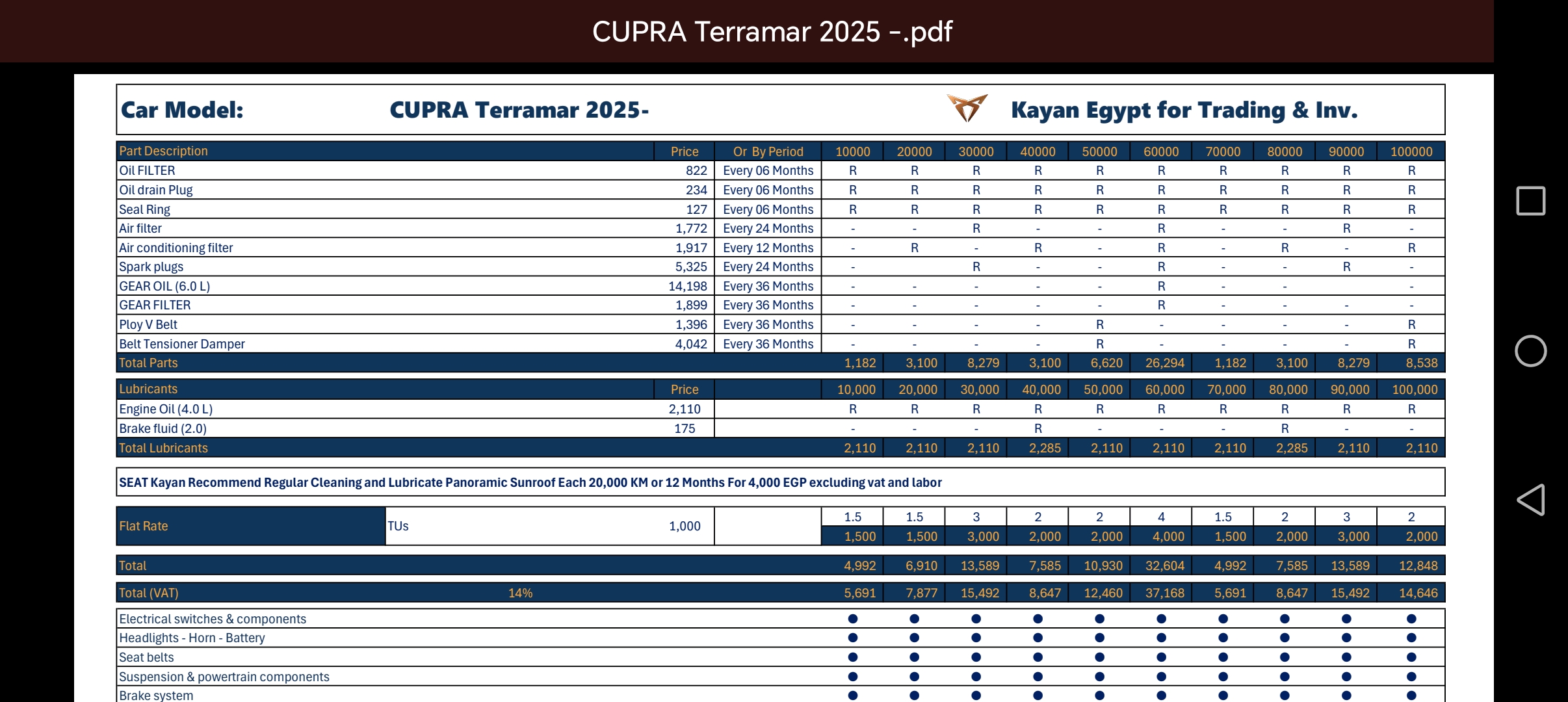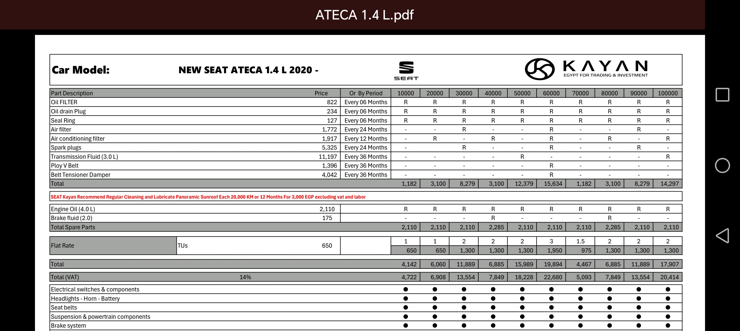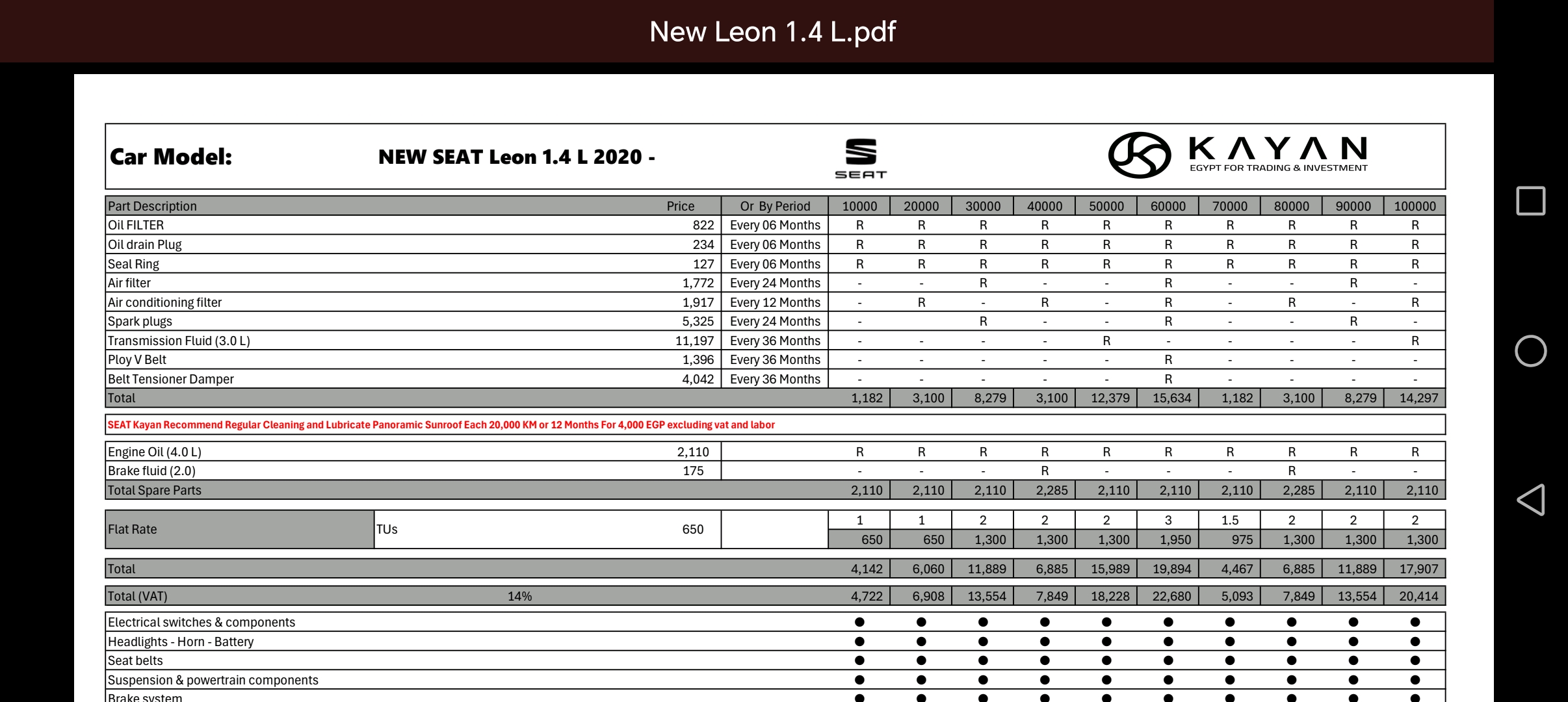 تشمل الأسعار المعلنة في الجداول المرفقة قطع الغيار والمواد الاستهلاكية الأساسية لكل صيانة، بما في ذلك فلاتر الزيت، زيت المحرك وسائل الفرامل.