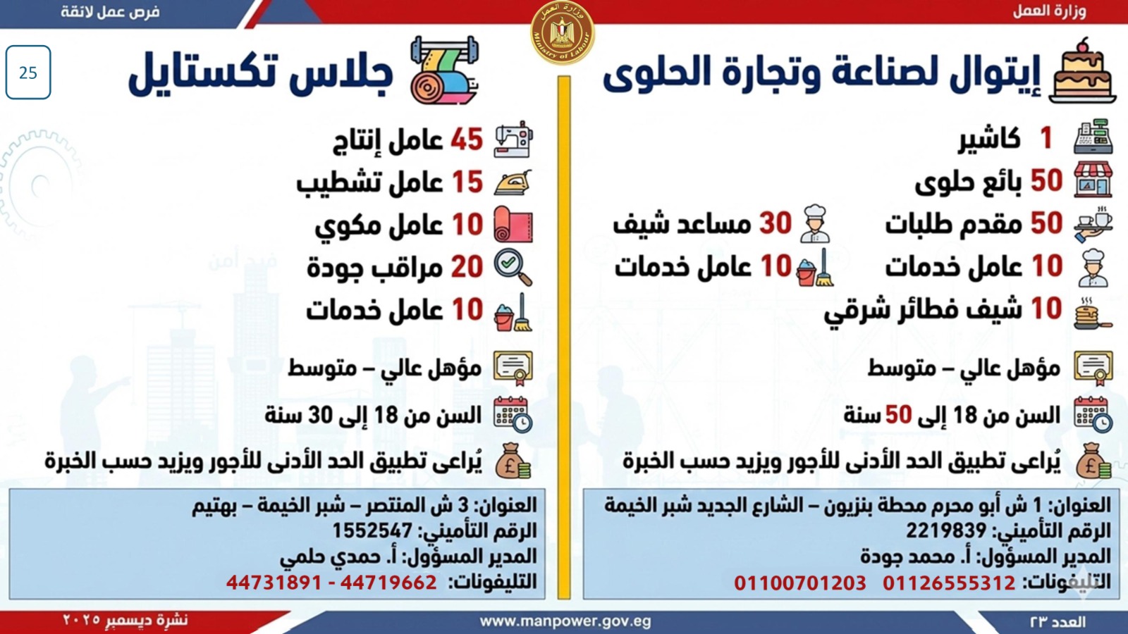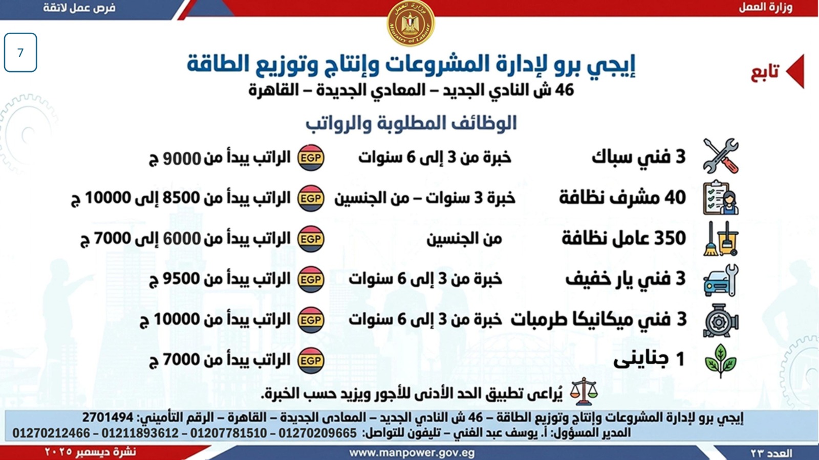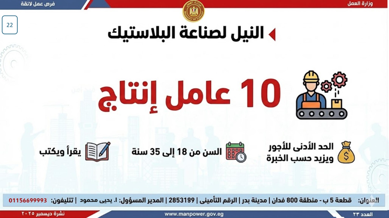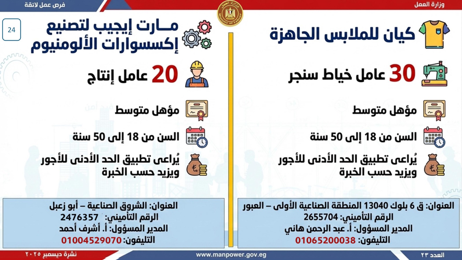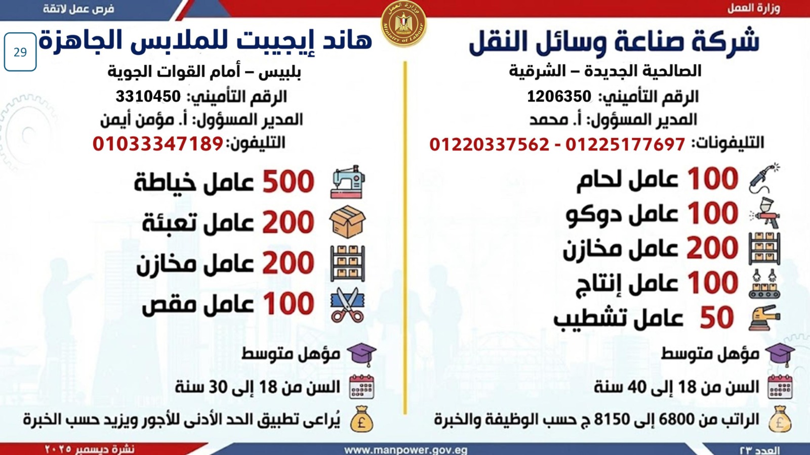 وبيّنت الوزارة أن التقديم على هذه الفرص يتم خلال شهر ديسمبر 2025، من خلال الإدارة العامة للتشغيل بمقر الوزارة القديم بمدينة نصر، أو عبر مديريات العمل بالمحافظات، كما يمكن التقديم مباشرة من خلال بيانات الشركات المرفقة بالنشرة، أو عبر الموقع الرسمي لوزارة العمل على شبكة الإنترنت.. وأضافت أن نشرة التوظيف نصف الشهرية تُصدر بصفة منتظمة كل 15 يومًا من خلال الإدارة العامة للتشغيل، برئاسة هبة أحمد، وإعداد منى شوقي – باحث أول بالإدارة، وتتضمن أحدث فرص العمل المتاحة في المحافظات...وأكدت الوزارة أن النشرة تتضمن عددًا من الوظائف المخصصة لذوي الهمم، تنفيذًا لأحكام القانون رقم 10 لسنة 2018 بشأن حقوق الأشخاص ذوي الإعاقة، والذي يُلزم المنشآت بتخصيص نسبة 5% من إجمالي العاملين بها لهذه الفئة، وذلك في إطار خطة الوزارة لحصر وتدريب وتشغيل ذوي الهمم ودمجهم في سوق العمل، تنفيذًا لتوجيهات فخامة الرئيس عبدالفتاح السيسي، رئيس الجمهورية، بتمكينهم اقتصاديًا ومجتمعيًا، وتوفير فرص عمل لائقة تحقق لهم الدمج الكامل والمستدام…