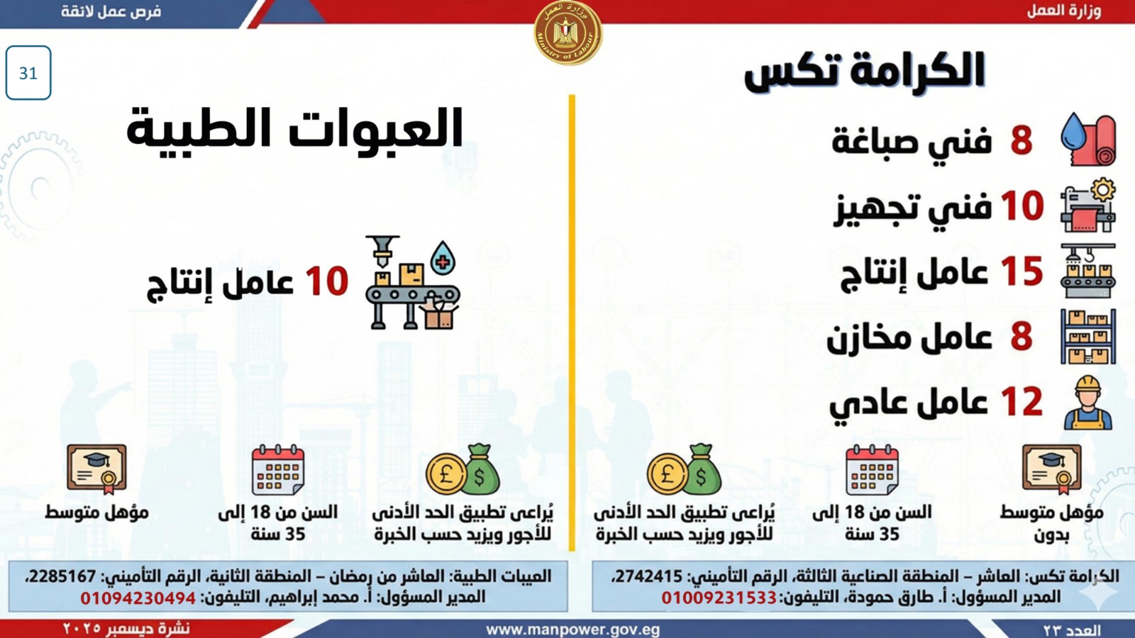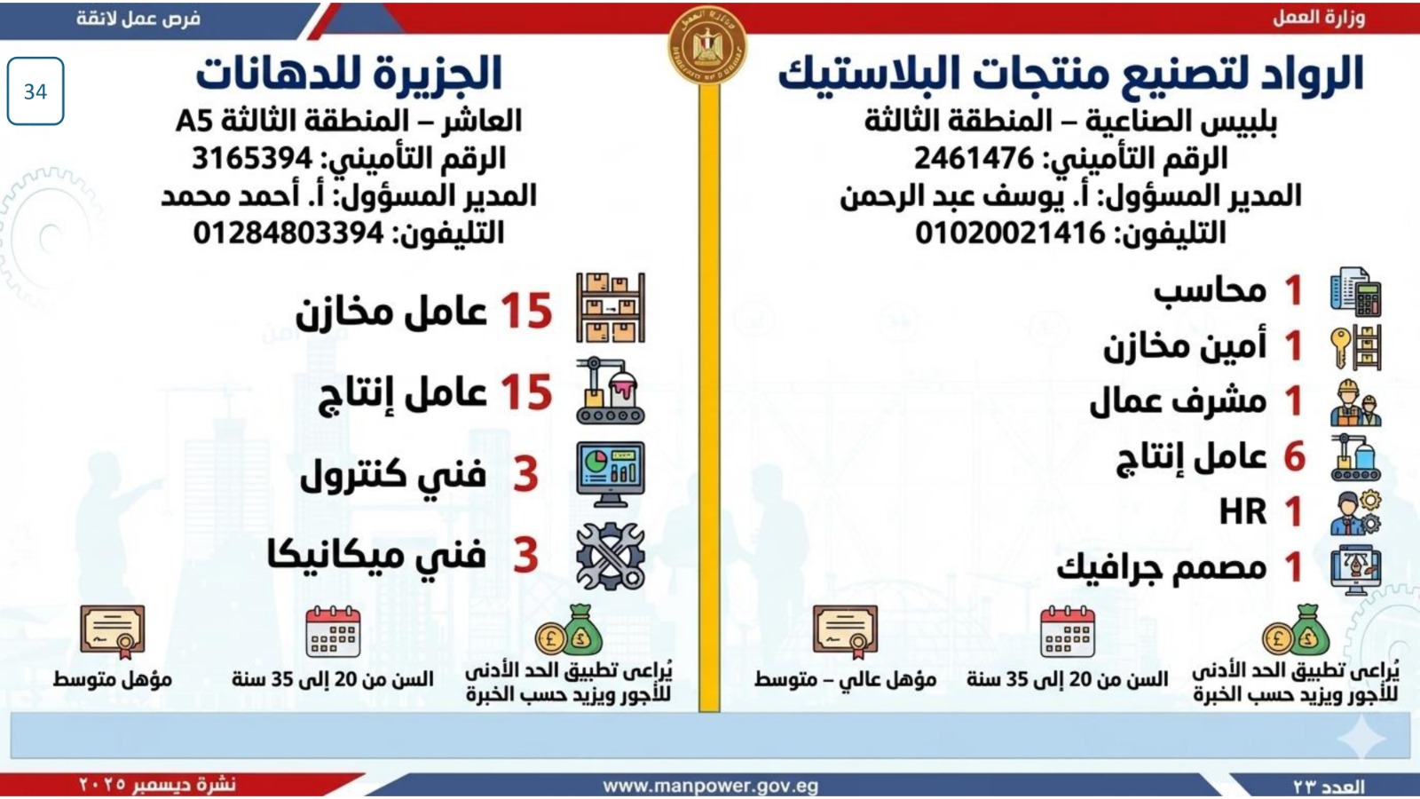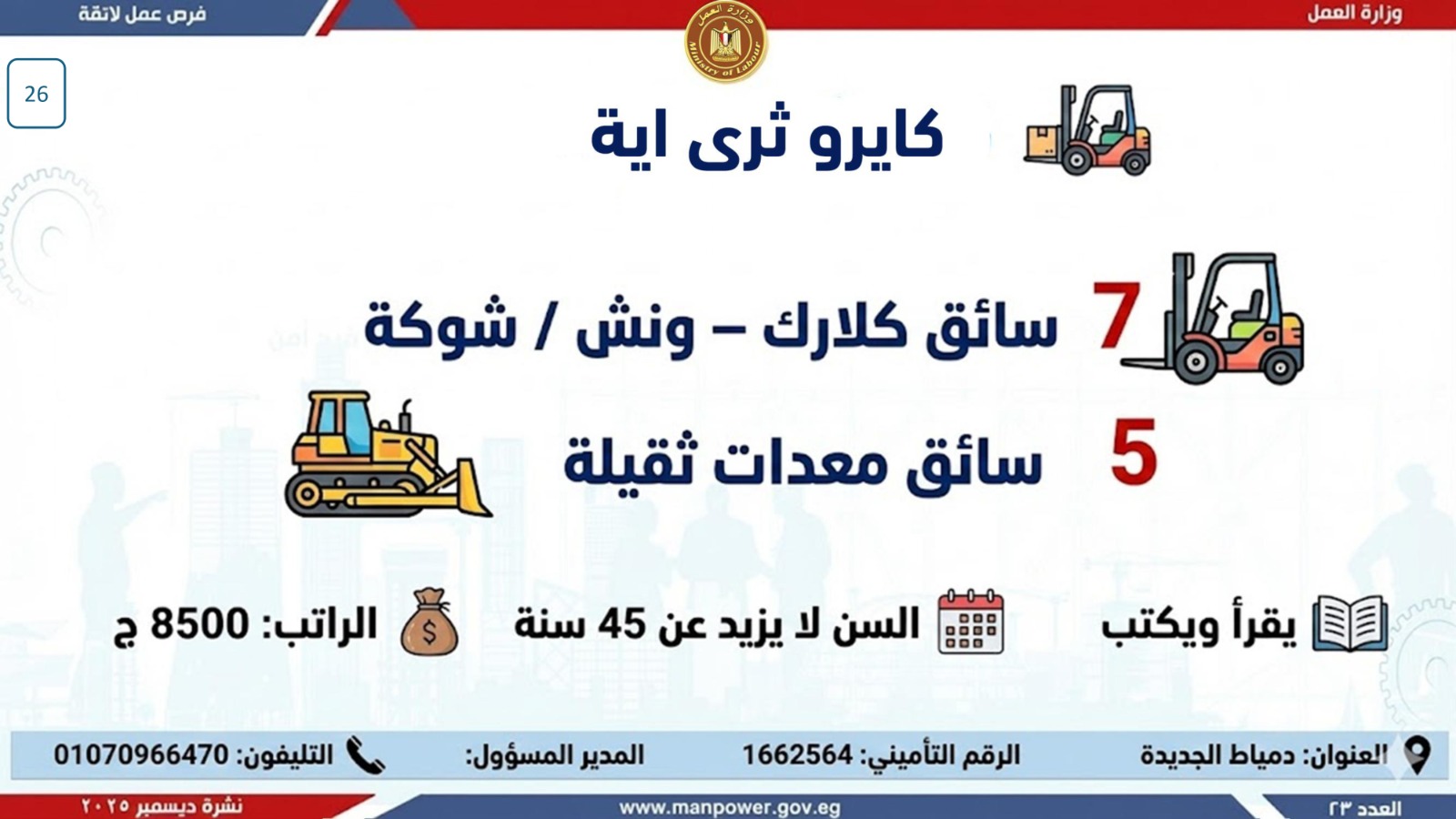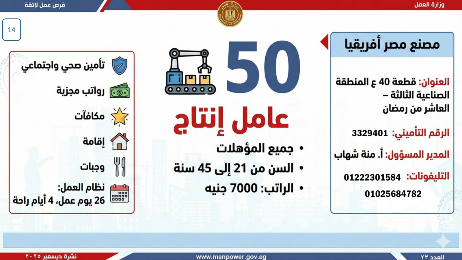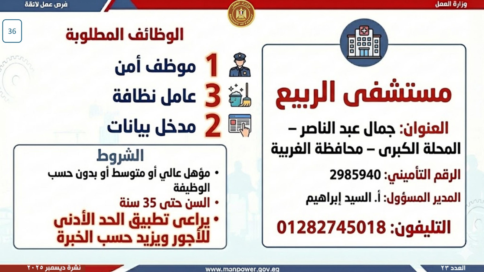وبيّنت الوزارة أن التقديم على هذه الفرص يتم خلال شهر ديسمبر 2025، من خلال الإدارة العامة للتشغيل بمقر الوزارة القديم بمدينة نصر، أو عبر مديريات العمل بالمحافظات، كما يمكن التقديم مباشرة من خلال بيانات الشركات المرفقة بالنشرة، أو عبر الموقع الرسمي لوزارة العمل على شبكة الإنترنت.. وأضافت أن نشرة التوظيف نصف الشهرية تُصدر بصفة منتظمة كل 15 يومًا من خلال الإدارة العامة للتشغيل، برئاسة هبة أحمد، وإعداد منى شوقي – باحث أول بالإدارة، وتتضمن أحدث فرص العمل المتاحة في المحافظات...وأكدت الوزارة أن النشرة تتضمن عددًا من الوظائف المخصصة لذوي الهمم، تنفيذًا لأحكام القانون رقم 10 لسنة 2018 بشأن حقوق الأشخاص ذوي الإعاقة، والذي يُلزم المنشآت بتخصيص نسبة 5% من إجمالي العاملين بها لهذه الفئة، وذلك في إطار خطة الوزارة لحصر وتدريب وتشغيل ذوي الهمم ودمجهم في سوق العمل، تنفيذًا لتوجيهات فخامة الرئيس عبدالفتاح السيسي، رئيس الجمهورية، بتمكينهم اقتصاديًا ومجتمعيًا، وتوفير فرص عمل لائقة تحقق لهم الدمج الكامل والمستدام…