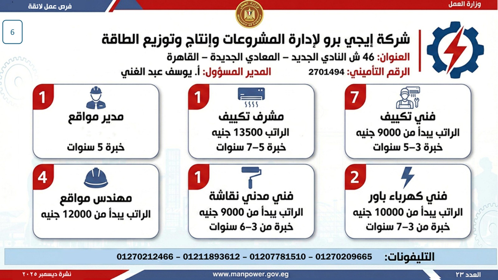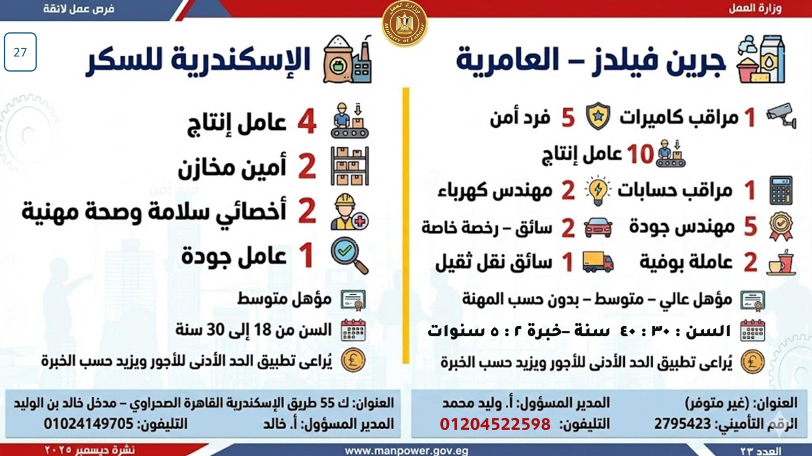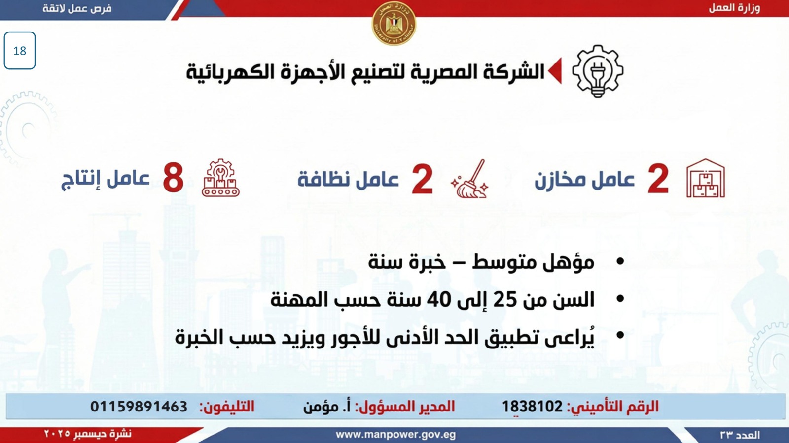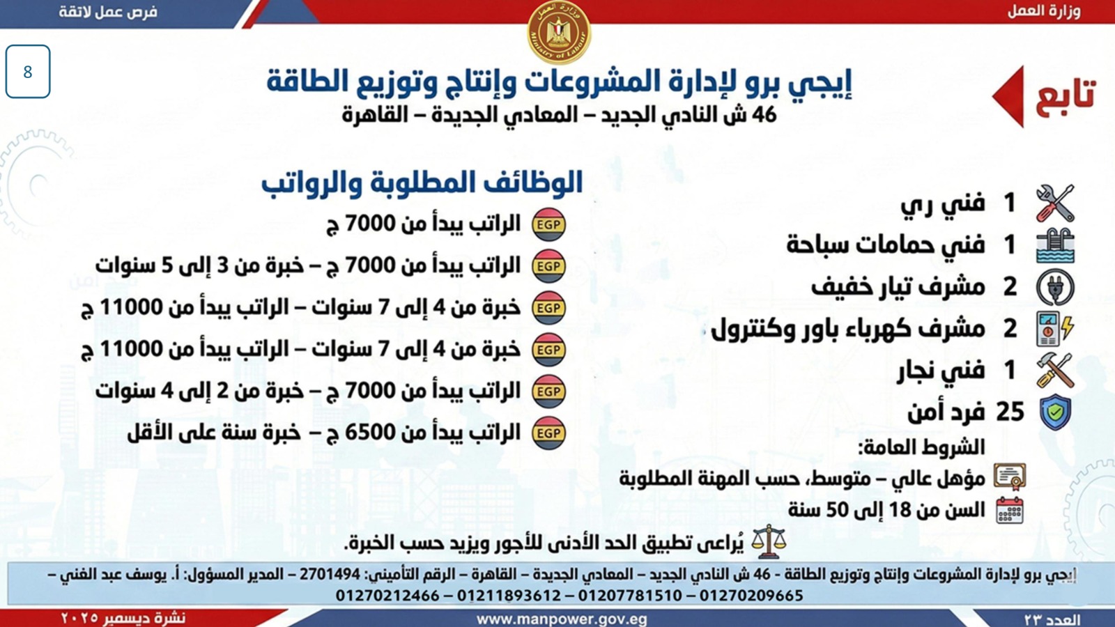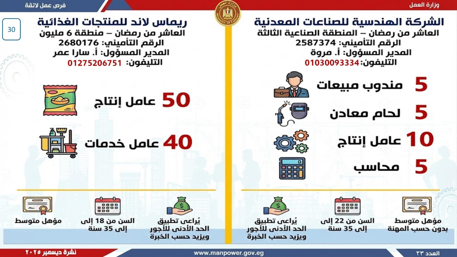 وبيّنت الوزارة أن التقديم على هذه الفرص يتم خلال شهر ديسمبر 2025، من خلال الإدارة العامة للتشغيل بمقر الوزارة القديم بمدينة نصر، أو عبر مديريات العمل بالمحافظات، كما يمكن التقديم مباشرة من خلال بيانات الشركات المرفقة بالنشرة، أو عبر الموقع الرسمي لوزارة العمل على شبكة الإنترنت.. وأضافت أن نشرة التوظيف نصف الشهرية تُصدر بصفة منتظمة كل 15 يومًا من خلال الإدارة العامة للتشغيل، برئاسة هبة أحمد، وإعداد منى شوقي – باحث أول بالإدارة، وتتضمن أحدث فرص العمل المتاحة في المحافظات...وأكدت الوزارة أن النشرة تتضمن عددًا من الوظائف المخصصة لذوي الهمم، تنفيذًا لأحكام القانون رقم 10 لسنة 2018 بشأن حقوق الأشخاص ذوي الإعاقة، والذي يُلزم المنشآت بتخصيص نسبة 5% من إجمالي العاملين بها لهذه الفئة، وذلك في إطار خطة الوزارة لحصر وتدريب وتشغيل ذوي الهمم ودمجهم في سوق العمل، تنفيذًا لتوجيهات فخامة الرئيس عبدالفتاح السيسي، رئيس الجمهورية، بتمكينهم اقتصاديًا ومجتمعيًا، وتوفير فرص عمل لائقة تحقق لهم الدمج الكامل والمستدام…