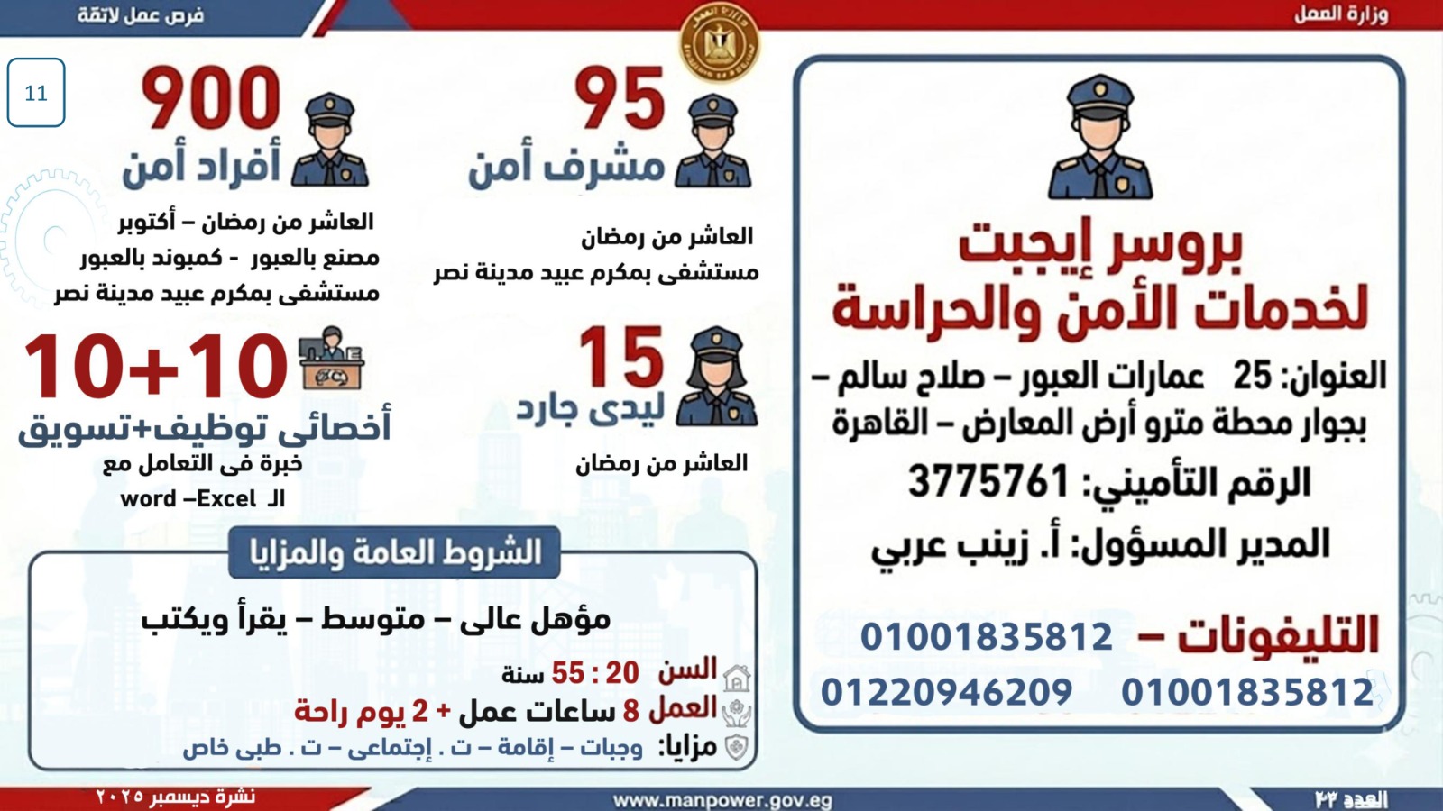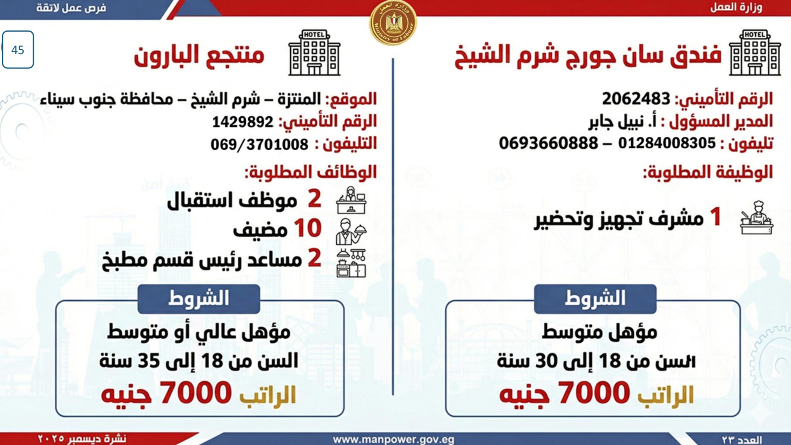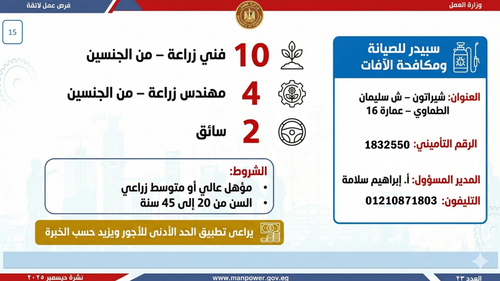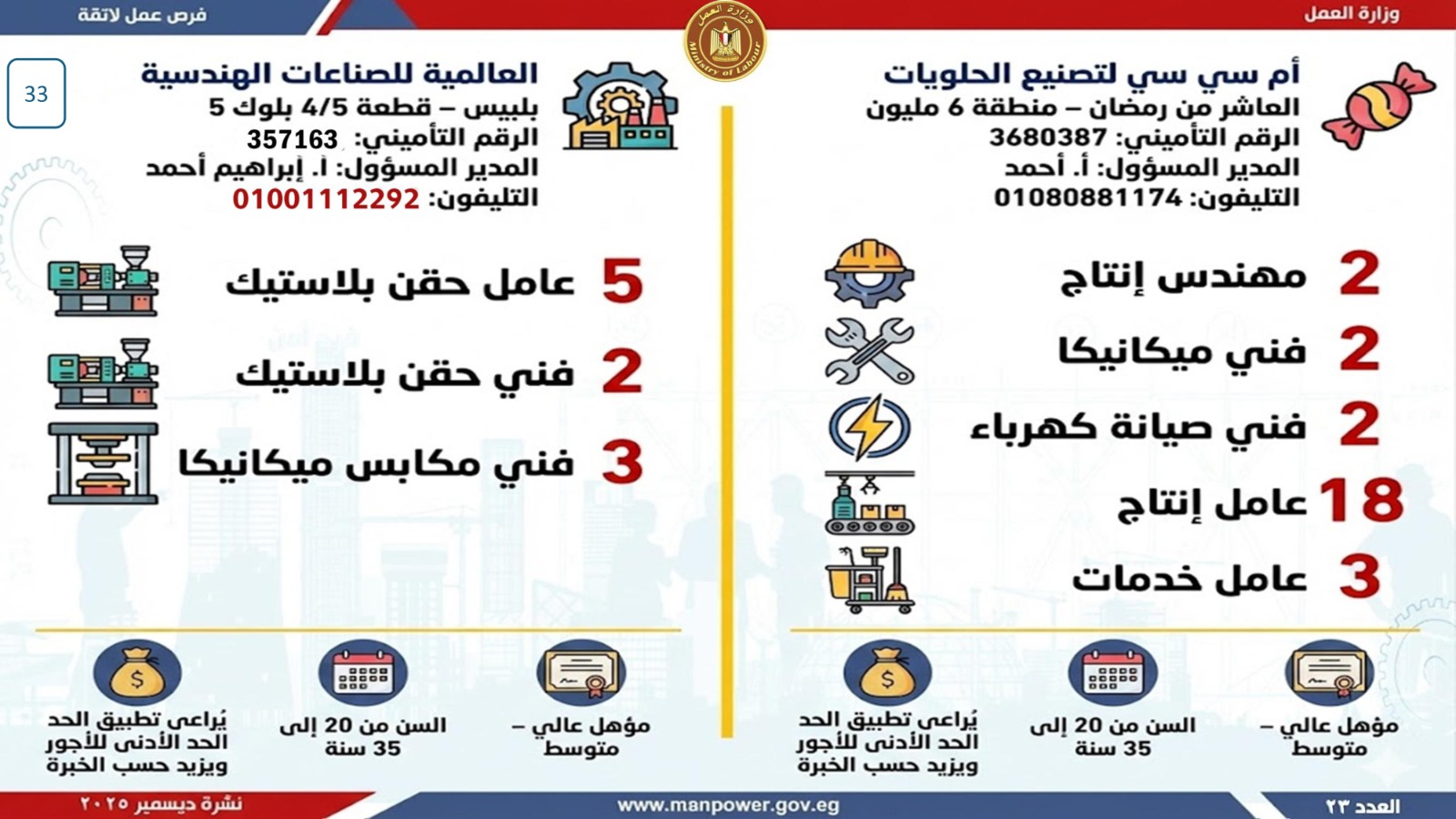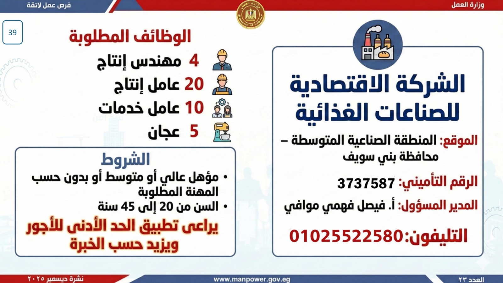وبيّنت الوزارة أن التقديم على هذه الفرص يتم خلال شهر ديسمبر 2025، من خلال الإدارة العامة للتشغيل بمقر الوزارة القديم بمدينة نصر، أو عبر مديريات العمل بالمحافظات، كما يمكن التقديم مباشرة من خلال بيانات الشركات المرفقة بالنشرة، أو عبر الموقع الرسمي لوزارة العمل على شبكة الإنترنت.. وأضافت أن نشرة التوظيف نصف الشهرية تُصدر بصفة منتظمة كل 15 يومًا من خلال الإدارة العامة للتشغيل، برئاسة هبة أحمد، وإعداد منى شوقي – باحث أول بالإدارة، وتتضمن أحدث فرص العمل المتاحة في المحافظات...وأكدت الوزارة أن النشرة تتضمن عددًا من الوظائف المخصصة لذوي الهمم، تنفيذًا لأحكام القانون رقم 10 لسنة 2018 بشأن حقوق الأشخاص ذوي الإعاقة، والذي يُلزم المنشآت بتخصيص نسبة 5% من إجمالي العاملين بها لهذه الفئة، وذلك في إطار خطة الوزارة لحصر وتدريب وتشغيل ذوي الهمم ودمجهم في سوق العمل، تنفيذًا لتوجيهات فخامة الرئيس عبدالفتاح السيسي، رئيس الجمهورية، بتمكينهم اقتصاديًا ومجتمعيًا، وتوفير فرص عمل لائقة تحقق لهم الدمج الكامل والمستدام…