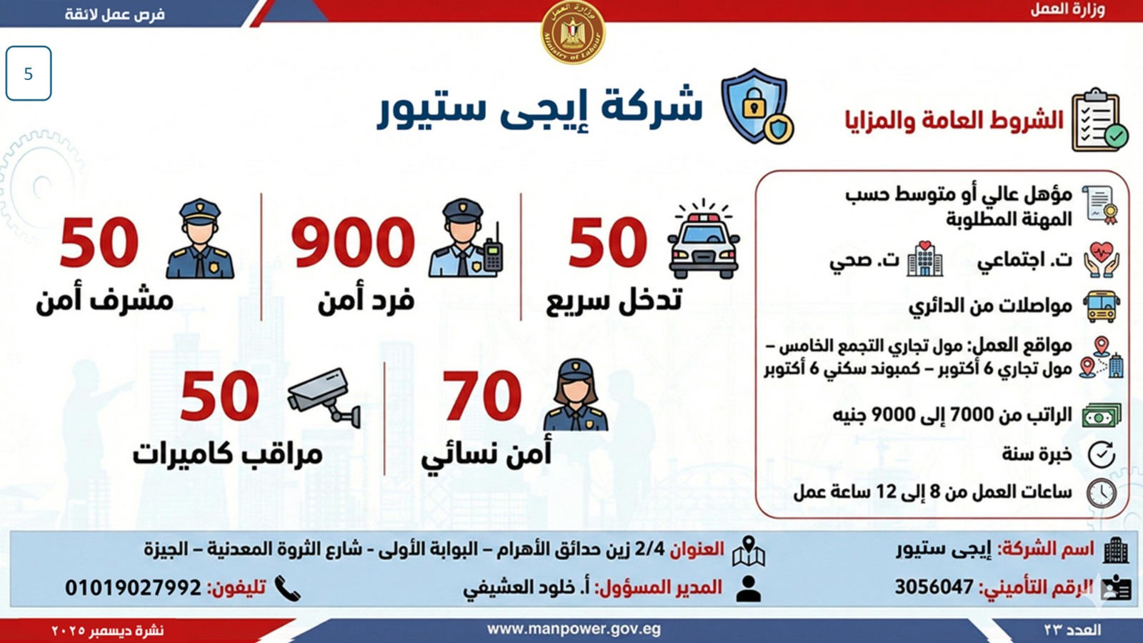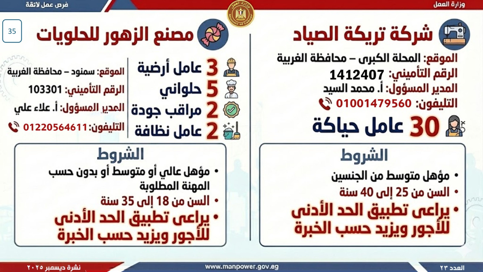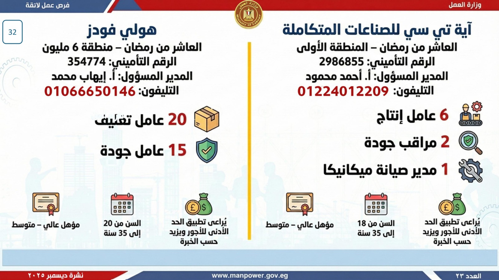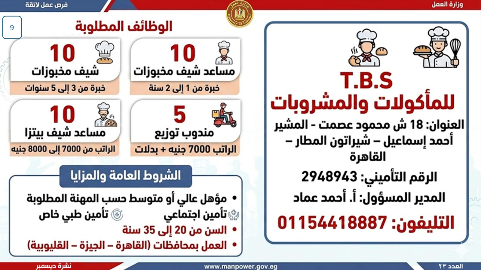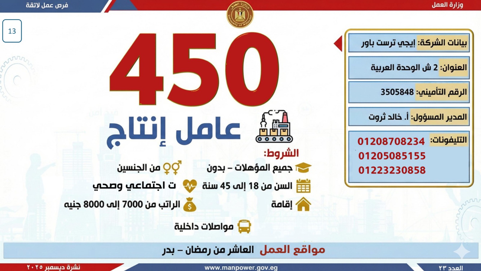 وبيّنت الوزارة أن التقديم على هذه الفرص يتم خلال شهر ديسمبر 2025، من خلال الإدارة العامة للتشغيل بمقر الوزارة القديم بمدينة نصر، أو عبر مديريات العمل بالمحافظات، كما يمكن التقديم مباشرة من خلال بيانات الشركات المرفقة بالنشرة، أو عبر الموقع الرسمي لوزارة العمل على شبكة الإنترنت.. وأضافت أن نشرة التوظيف نصف الشهرية تُصدر بصفة منتظمة كل 15 يومًا من خلال الإدارة العامة للتشغيل، برئاسة هبة أحمد، وإعداد منى شوقي – باحث أول بالإدارة، وتتضمن أحدث فرص العمل المتاحة في المحافظات...وأكدت الوزارة أن النشرة تتضمن عددًا من الوظائف المخصصة لذوي الهمم، تنفيذًا لأحكام القانون رقم 10 لسنة 2018 بشأن حقوق الأشخاص ذوي الإعاقة، والذي يُلزم المنشآت بتخصيص نسبة 5% من إجمالي العاملين بها لهذه الفئة، وذلك في إطار خطة الوزارة لحصر وتدريب وتشغيل ذوي الهمم ودمجهم في سوق العمل، تنفيذًا لتوجيهات فخامة الرئيس عبدالفتاح السيسي، رئيس الجمهورية، بتمكينهم اقتصاديًا ومجتمعيًا، وتوفير فرص عمل لائقة تحقق لهم الدمج الكامل والمستدام…