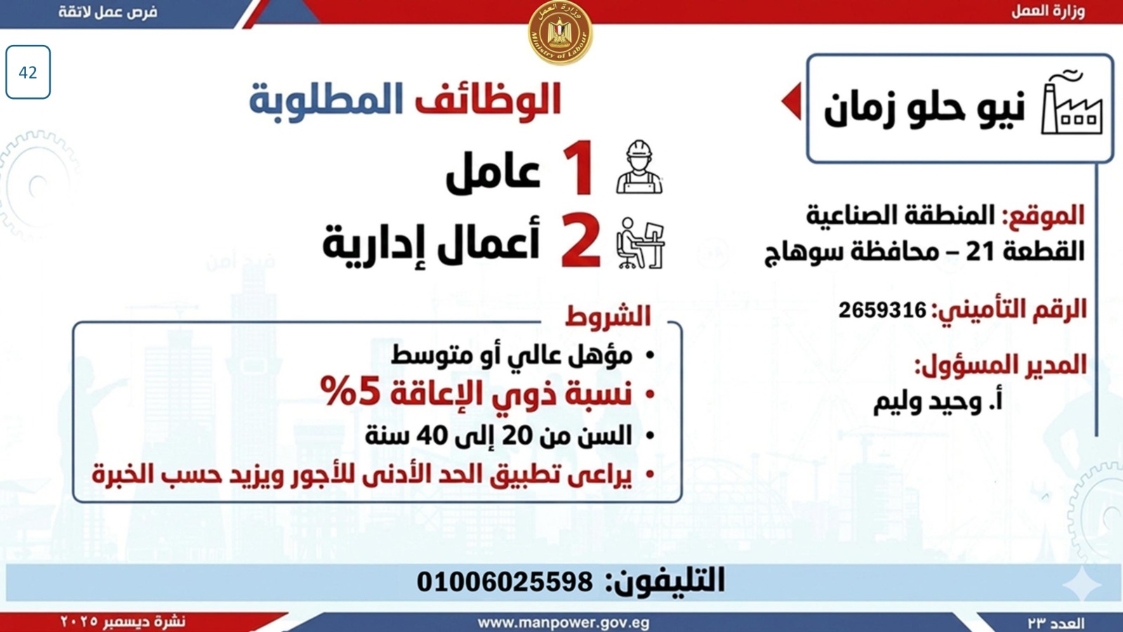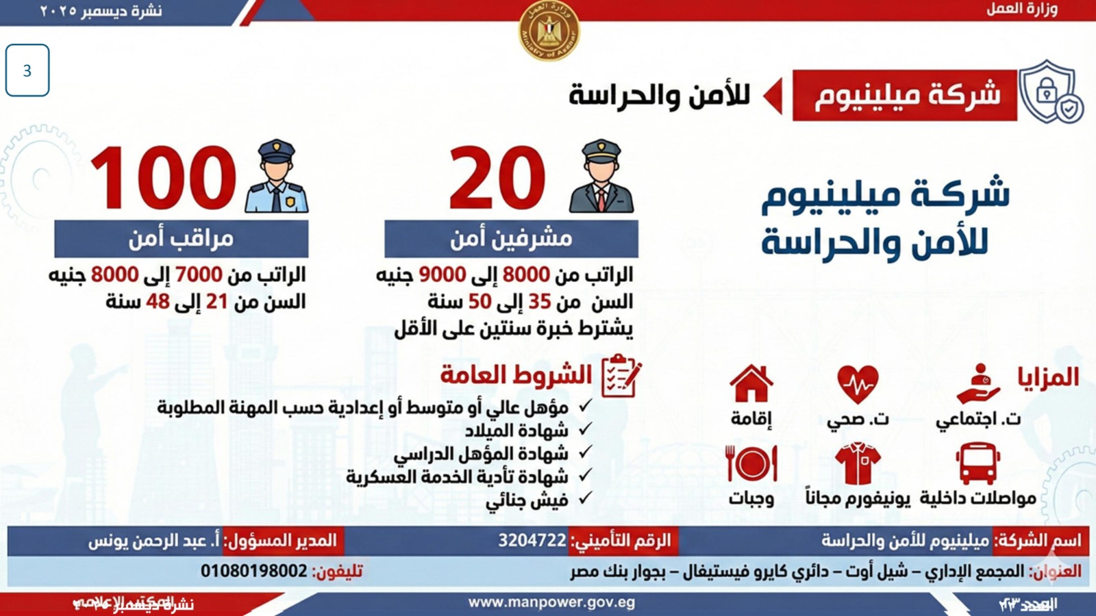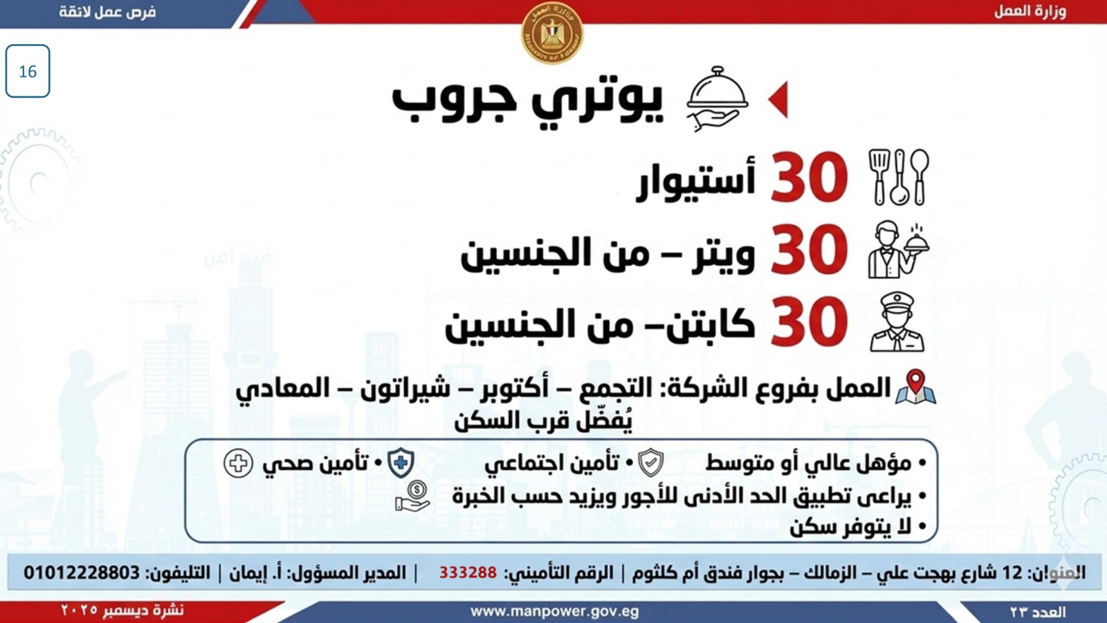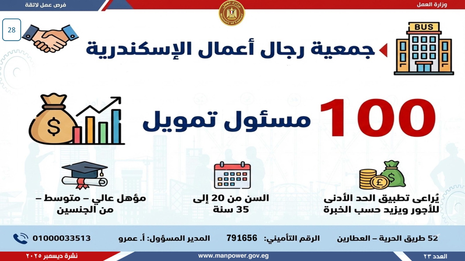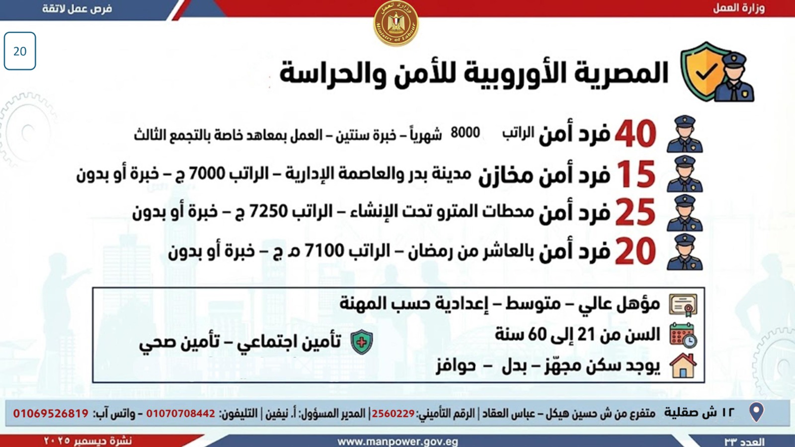 وبيّنت الوزارة أن التقديم على هذه الفرص يتم خلال شهر ديسمبر 2025، من خلال الإدارة العامة للتشغيل بمقر الوزارة القديم بمدينة نصر، أو عبر مديريات العمل بالمحافظات، كما يمكن التقديم مباشرة من خلال بيانات الشركات المرفقة بالنشرة، أو عبر الموقع الرسمي لوزارة العمل على شبكة الإنترنت.. وأضافت أن نشرة التوظيف نصف الشهرية تُصدر بصفة منتظمة كل 15 يومًا من خلال الإدارة العامة للتشغيل، برئاسة هبة أحمد، وإعداد منى شوقي – باحث أول بالإدارة، وتتضمن أحدث فرص العمل المتاحة في المحافظات...وأكدت الوزارة أن النشرة تتضمن عددًا من الوظائف المخصصة لذوي الهمم، تنفيذًا لأحكام القانون رقم 10 لسنة 2018 بشأن حقوق الأشخاص ذوي الإعاقة، والذي يُلزم المنشآت بتخصيص نسبة 5% من إجمالي العاملين بها لهذه الفئة، وذلك في إطار خطة الوزارة لحصر وتدريب وتشغيل ذوي الهمم ودمجهم في سوق العمل، تنفيذًا لتوجيهات فخامة الرئيس عبدالفتاح السيسي، رئيس الجمهورية، بتمكينهم اقتصاديًا ومجتمعيًا، وتوفير فرص عمل لائقة تحقق لهم الدمج الكامل والمستدام…
