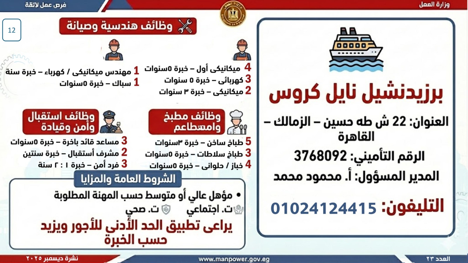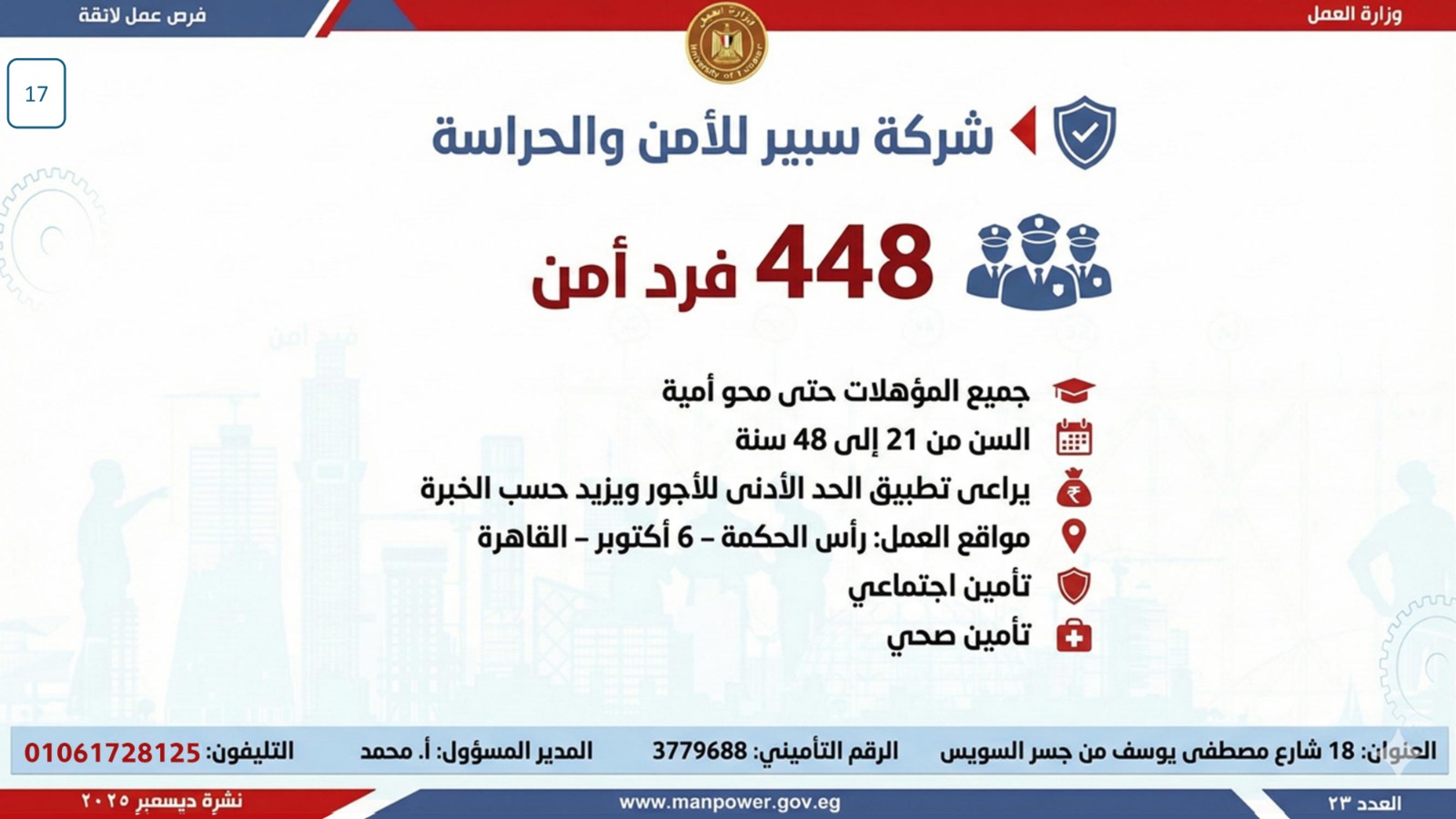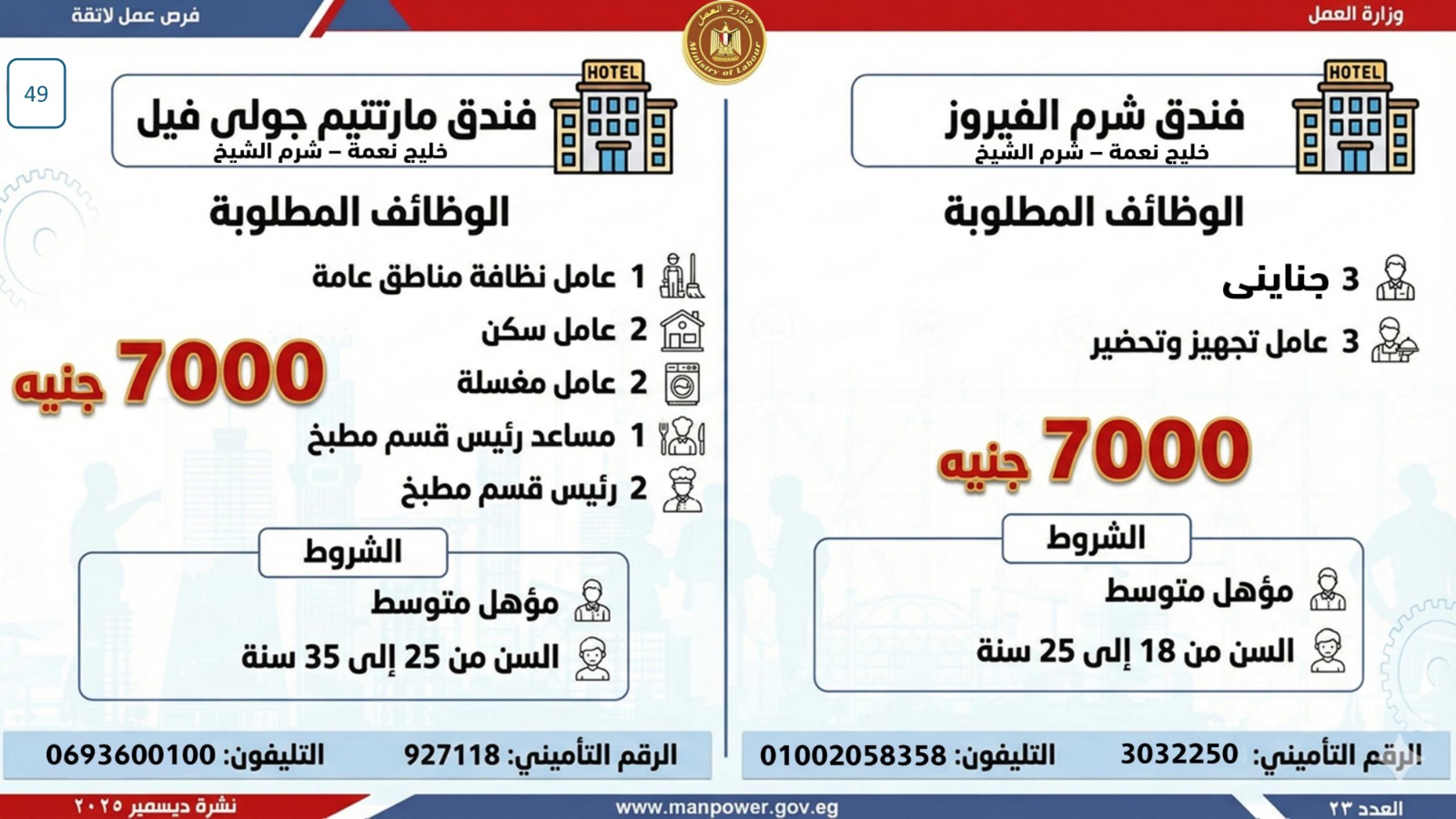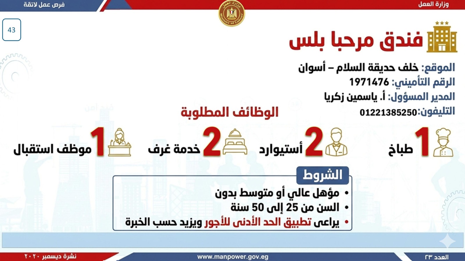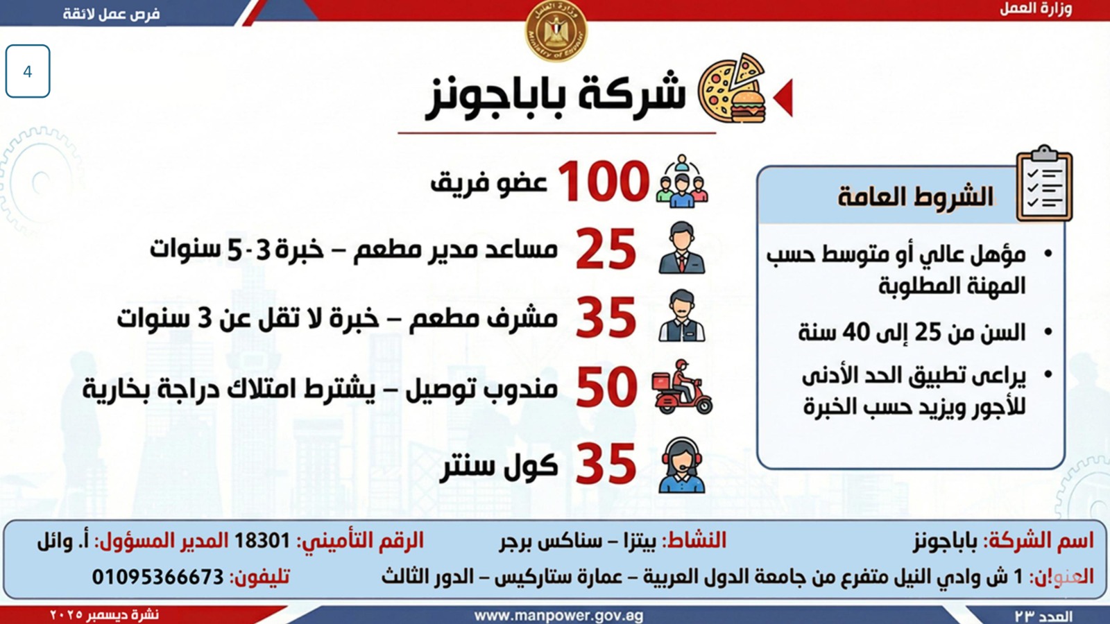وبيّنت الوزارة أن التقديم على هذه الفرص يتم خلال شهر ديسمبر 2025، من خلال الإدارة العامة للتشغيل بمقر الوزارة القديم بمدينة نصر، أو عبر مديريات العمل بالمحافظات، كما يمكن التقديم مباشرة من خلال بيانات الشركات المرفقة بالنشرة، أو عبر الموقع الرسمي لوزارة العمل على شبكة الإنترنت.. وأضافت أن نشرة التوظيف نصف الشهرية تُصدر بصفة منتظمة كل 15 يومًا من خلال الإدارة العامة للتشغيل، برئاسة هبة أحمد، وإعداد منى شوقي – باحث أول بالإدارة، وتتضمن أحدث فرص العمل المتاحة في المحافظات...وأكدت الوزارة أن النشرة تتضمن عددًا من الوظائف المخصصة لذوي الهمم، تنفيذًا لأحكام القانون رقم 10 لسنة 2018 بشأن حقوق الأشخاص ذوي الإعاقة، والذي يُلزم المنشآت بتخصيص نسبة 5% من إجمالي العاملين بها لهذه الفئة، وذلك في إطار خطة الوزارة لحصر وتدريب وتشغيل ذوي الهمم ودمجهم في سوق العمل، تنفيذًا لتوجيهات فخامة الرئيس عبدالفتاح السيسي، رئيس الجمهورية، بتمكينهم اقتصاديًا ومجتمعيًا، وتوفير فرص عمل لائقة تحقق لهم الدمج الكامل والمستدام…