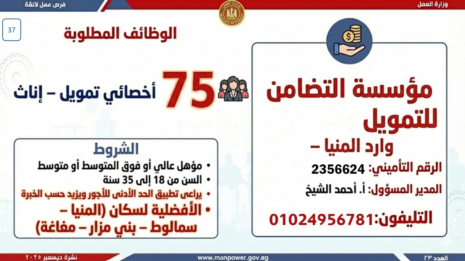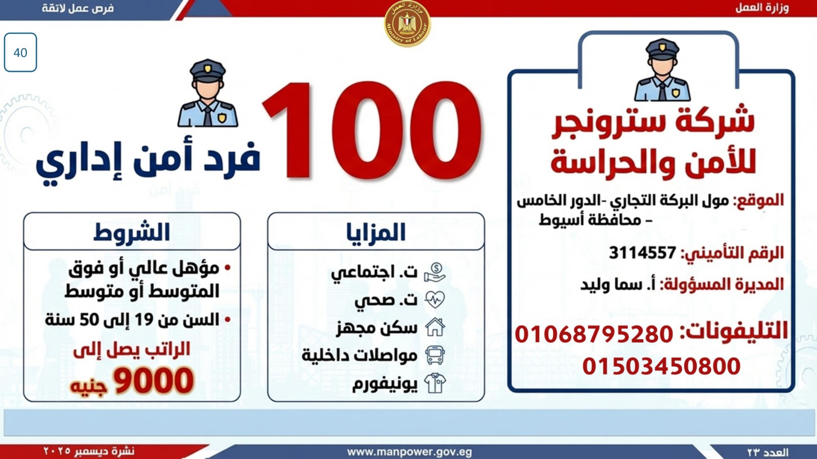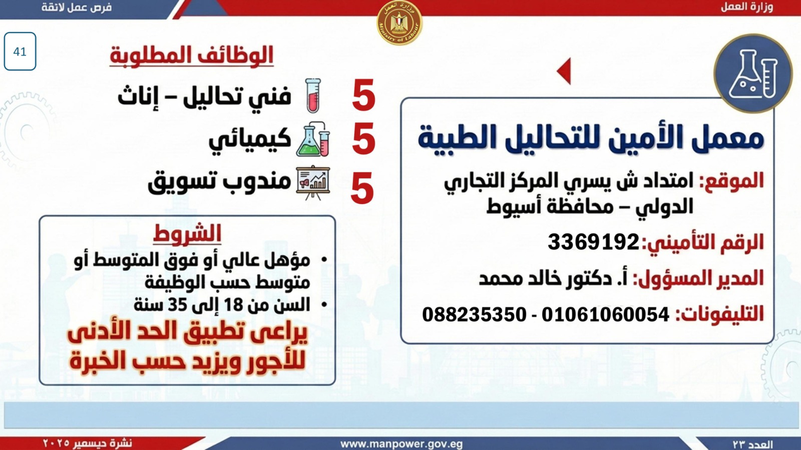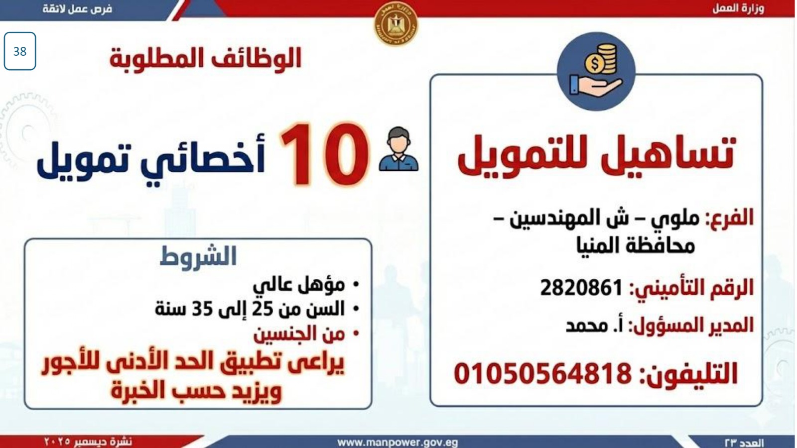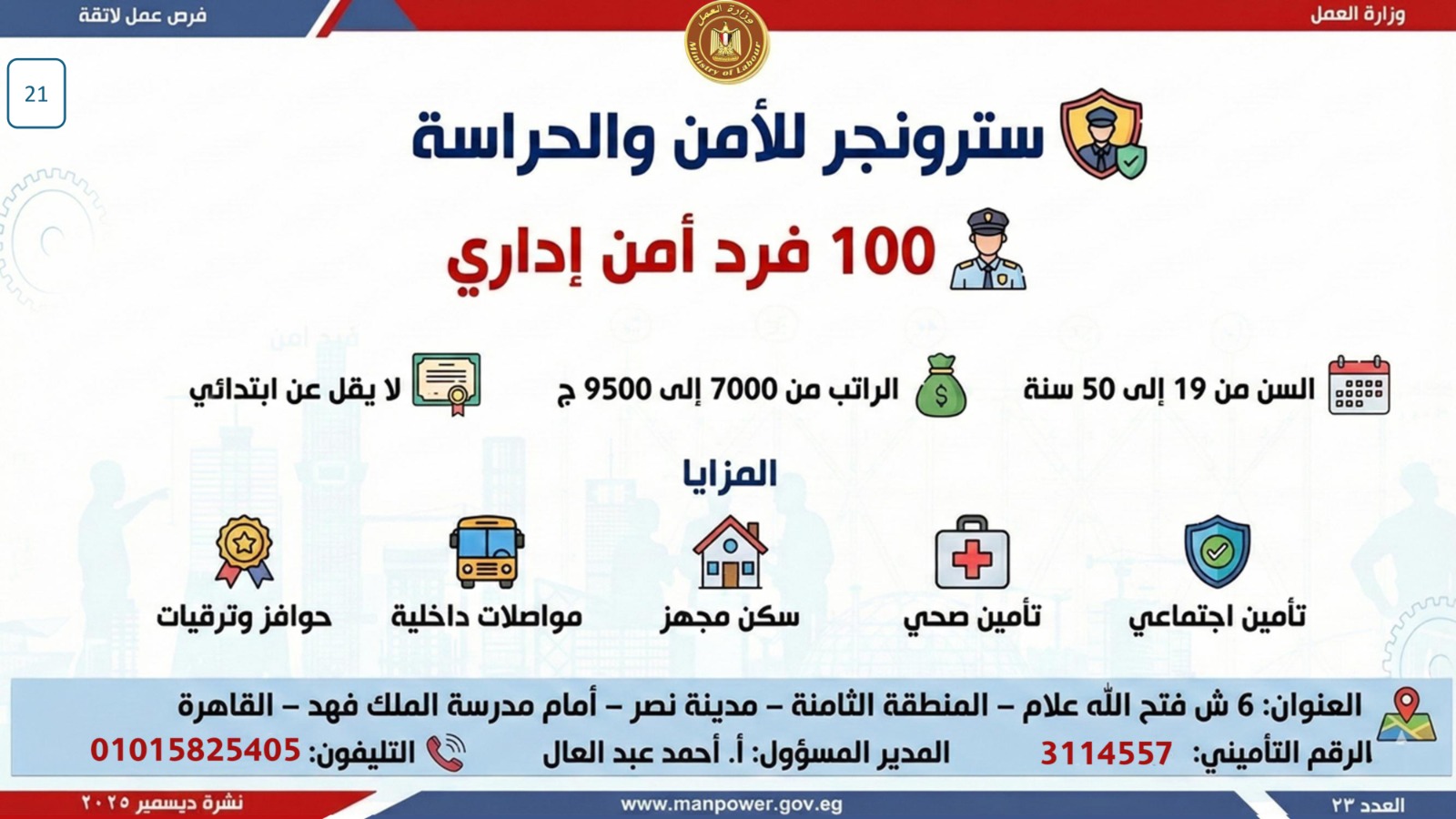 وبيّنت الوزارة أن التقديم على هذه الفرص يتم خلال شهر ديسمبر 2025، من خلال الإدارة العامة للتشغيل بمقر الوزارة القديم بمدينة نصر، أو عبر مديريات العمل بالمحافظات، كما يمكن التقديم مباشرة من خلال بيانات الشركات المرفقة بالنشرة، أو عبر الموقع الرسمي لوزارة العمل على شبكة الإنترنت.. وأضافت أن نشرة التوظيف نصف الشهرية تُصدر بصفة منتظمة كل 15 يومًا من خلال الإدارة العامة للتشغيل، برئاسة هبة أحمد، وإعداد منى شوقي – باحث أول بالإدارة، وتتضمن أحدث فرص العمل المتاحة في المحافظات...وأكدت الوزارة أن النشرة تتضمن عددًا من الوظائف المخصصة لذوي الهمم، تنفيذًا لأحكام القانون رقم 10 لسنة 2018 بشأن حقوق الأشخاص ذوي الإعاقة، والذي يُلزم المنشآت بتخصيص نسبة 5% من إجمالي العاملين بها لهذه الفئة، وذلك في إطار خطة الوزارة لحصر وتدريب وتشغيل ذوي الهمم ودمجهم في سوق العمل، تنفيذًا لتوجيهات فخامة الرئيس عبدالفتاح السيسي، رئيس الجمهورية، بتمكينهم اقتصاديًا ومجتمعيًا، وتوفير فرص عمل لائقة تحقق لهم الدمج الكامل والمستدام…