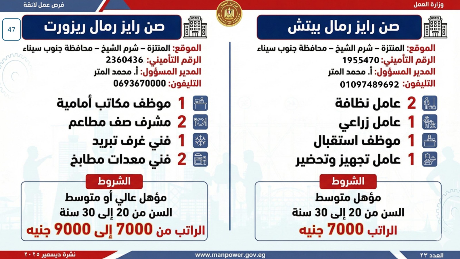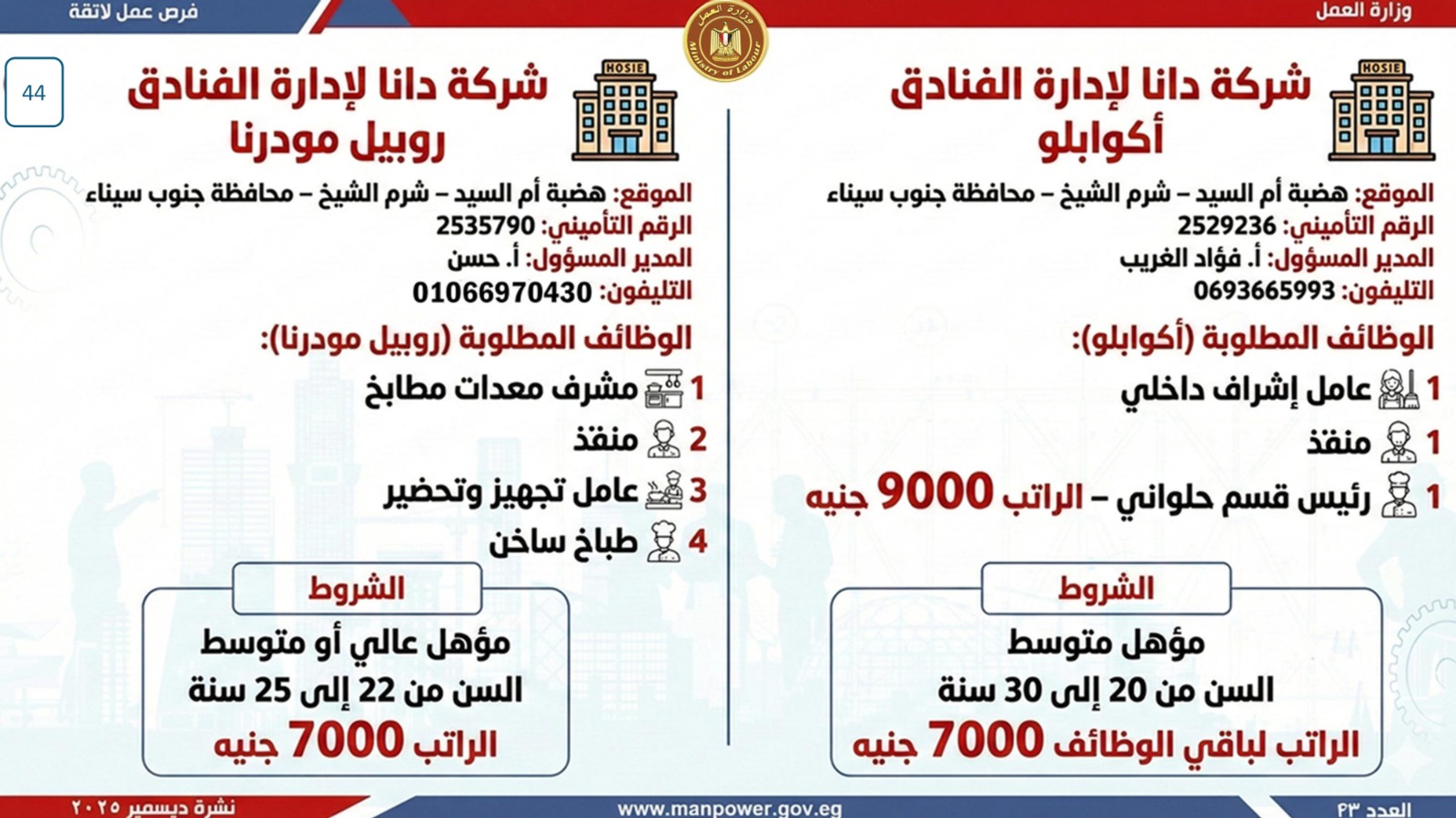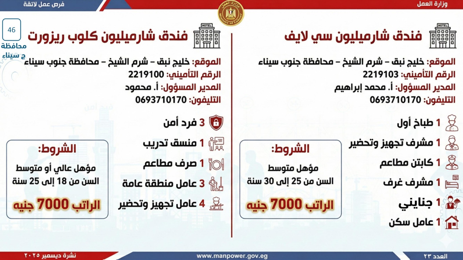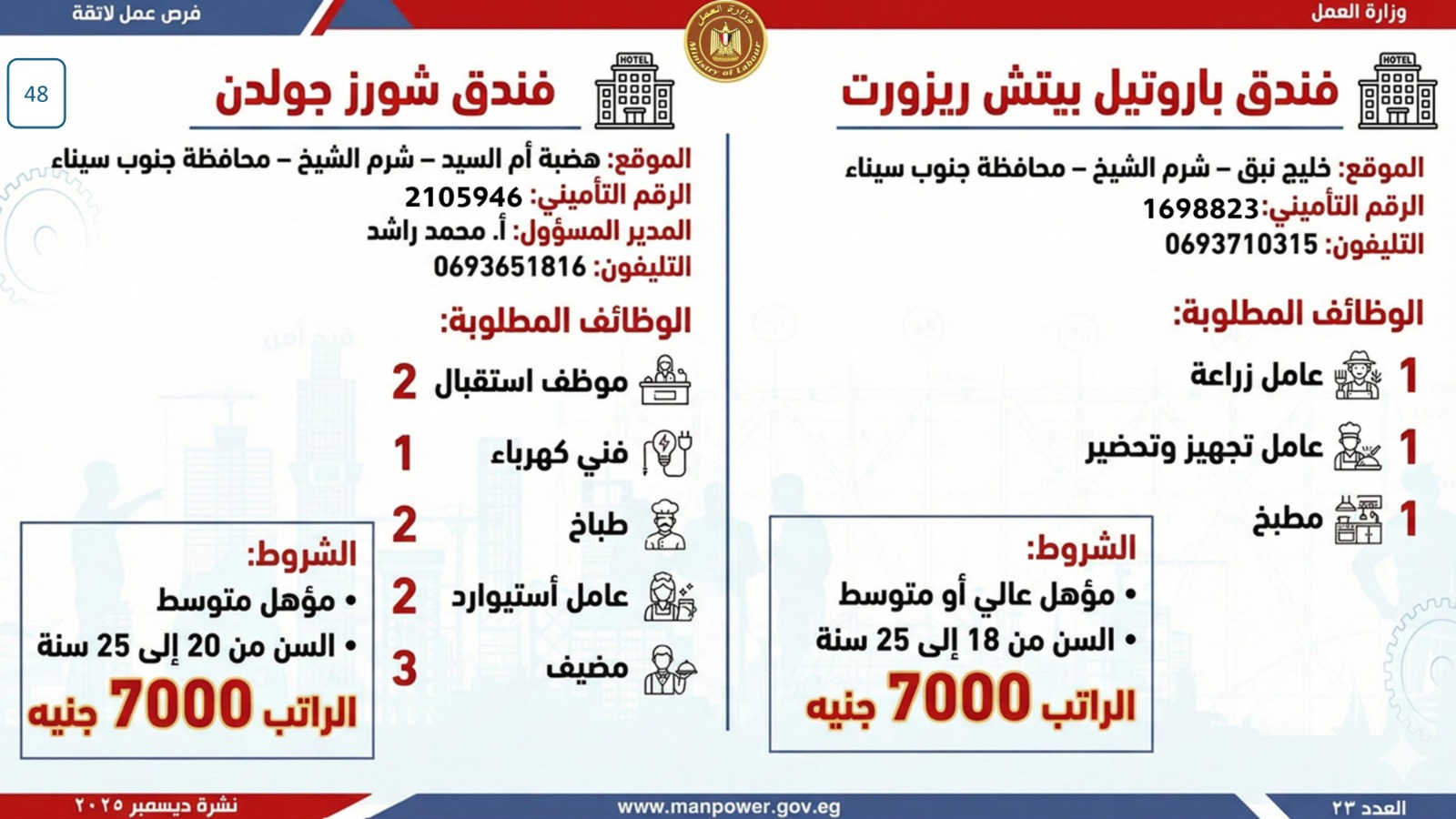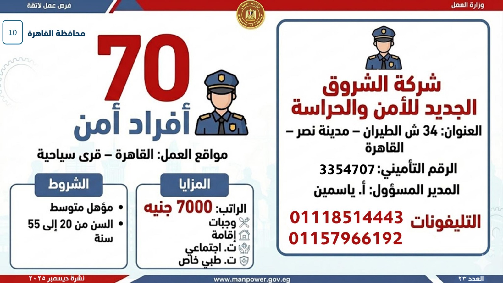 وتشمل النشرة الحالية فرص عمل متاحة في محافظات: القاهرة، الجيزة، القليوبية، الإسكندرية، الغربية، الشرقية، دمياط، المنيا، أسيوط، بني سويف، سوهاج، أسوان، جنوب سيناء...وتتنوع فرص العمل المطروحة لتشمل مجموعة واسعة من التخصصات، من بينها: أخصائيو تسويق، وأخصائيو موارد بشرية، ومهندسو اتصالات وكهرباء، ومشرفو ميكانيكا وتحكم كهربائي، ومديرو صيانة، ومحاسبون، ومشرفو مواقع وتنجيد، و (ليدي جارد – إناث)، ومشرفو إنتاج، وشيفات، وأخصائيو مشتريات، وبائعون، ومقدمو طلبات، وأمناء مخازن، ومندوبو مبيعات، ومراقبو جودة، وفنيون بمختلف التخصصات، وسائقون برخص أولى وثانية وثالثة، وأفراد أمن، إضافة إلى فرص في قطاع الفندقة والمطاعم، إلى جانب عمال إنتاج ونظافة وتخصصات أخرى…