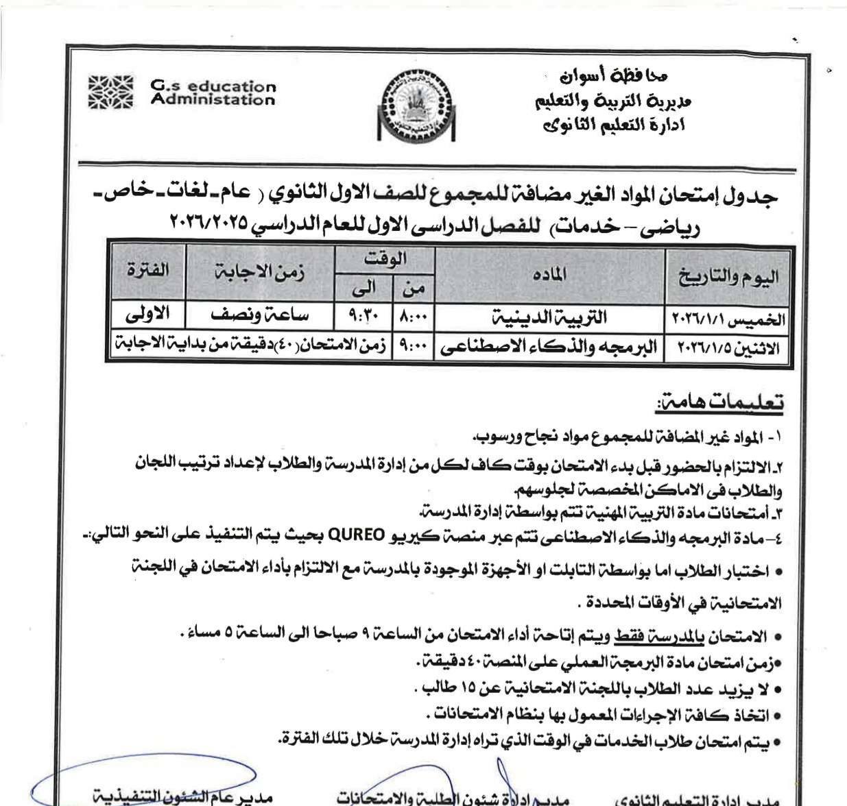 ويتضمن جدول إمتحانات الفصل الدراسي الأول للصف الأول الثانوى العام ( عام – لغات – خاص – رياضى – خدمات ) أداء مادة التربية الدينية يوم 1 يناير ، والأثنين 5 يناير مادة البرمجة والذكاء الإصطناعى .
