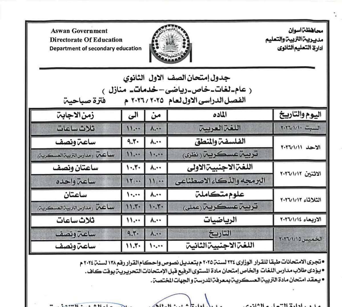 أعلنت مديرية التربية والتعليم بأسوان عن جدول إمتحانات الفصل الدراسي الأول للصف الأول والثانى الثانوى العام ( عام – لغات – خاص – رياضى – خدمات – منازل ) المقرر لها السبت 10 يناير ، وتستمر حتى الخميس 15 يناير 2025.