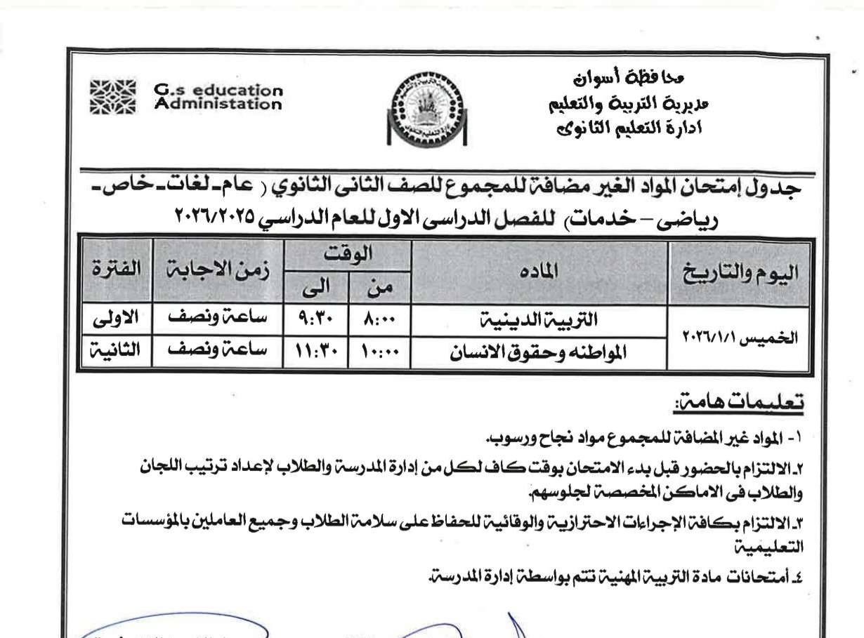ويسبق ذلك قيام طلاب الصف الثانى الثانوى بأداء إمتحانات مادتى التربية الدينية والمواطنة وحقوق الإنسان يوم 1 يناير .