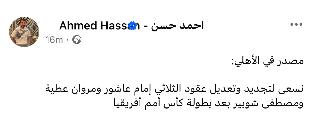 وكتب أحمد حسن عبر حسابه الشخصي بموقع فيسبوك: “مصدر في الأهلي: نسعى لتجديد وتعديل عقود الثلاثي إمام عاشور ومروان عطية ومصطفى شوبير بعد بطولة كأس أمم أفريقيا”.