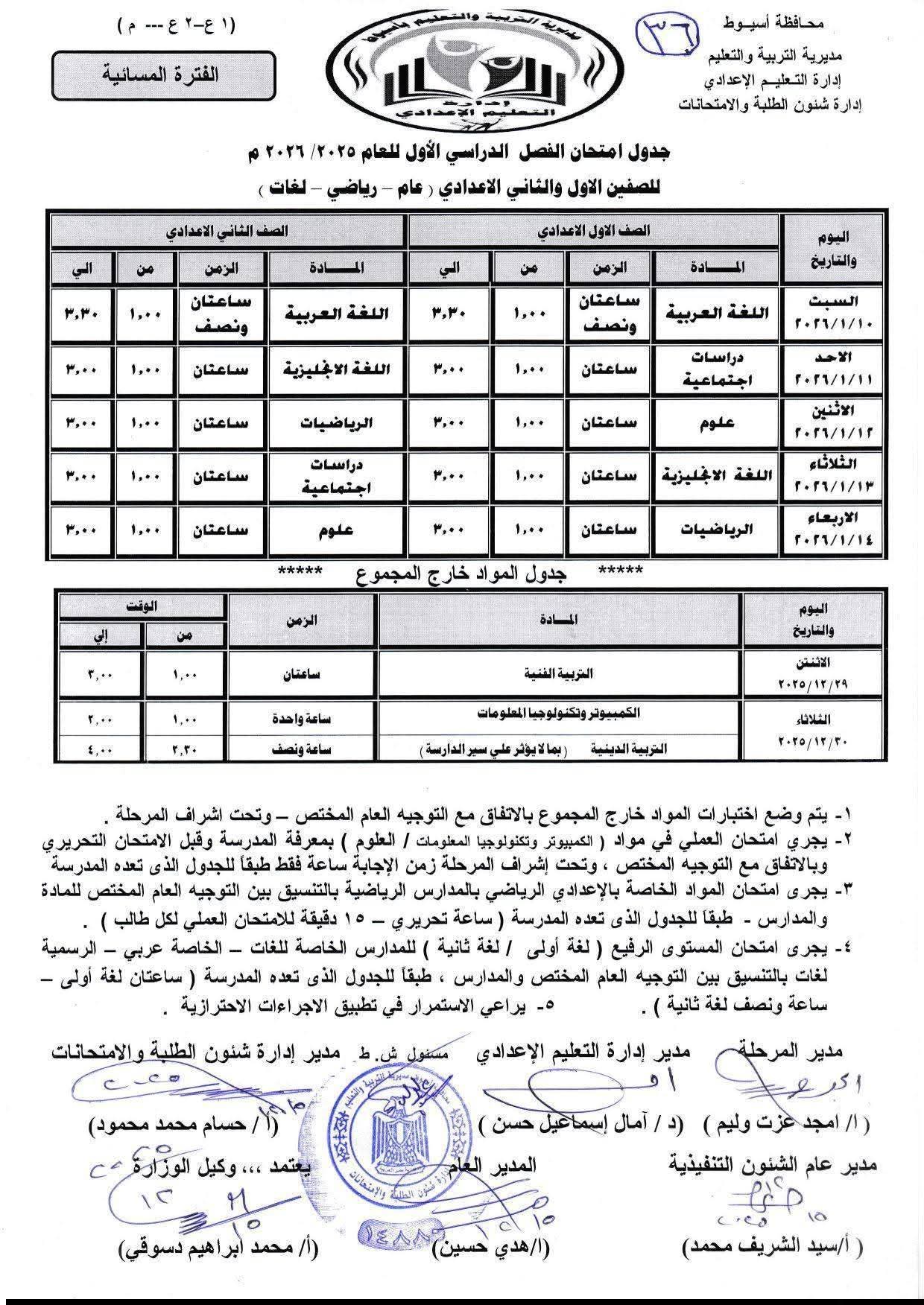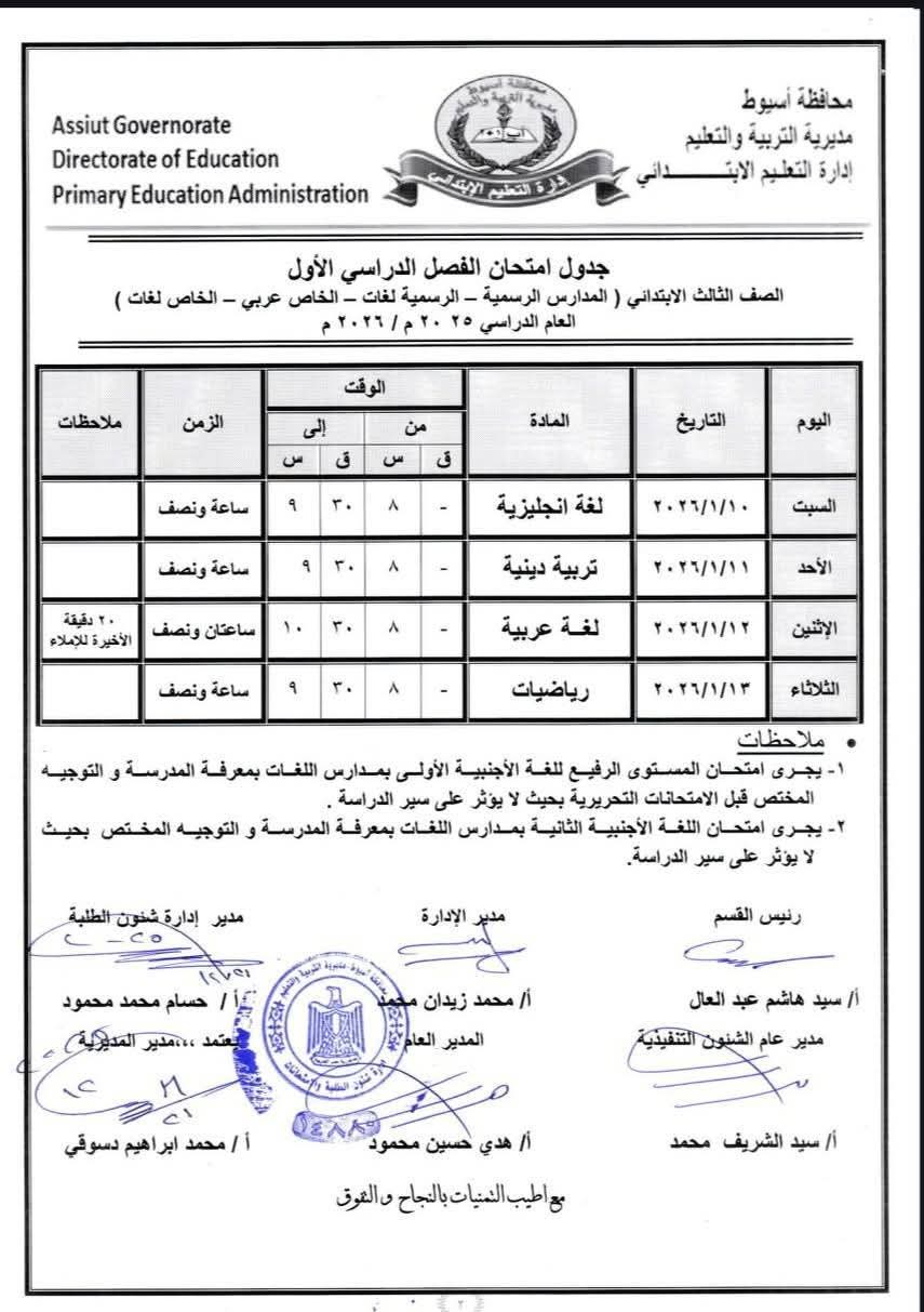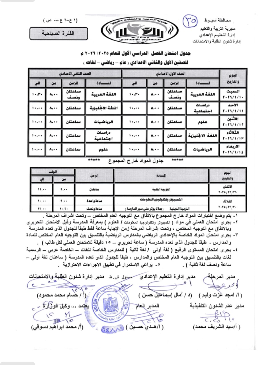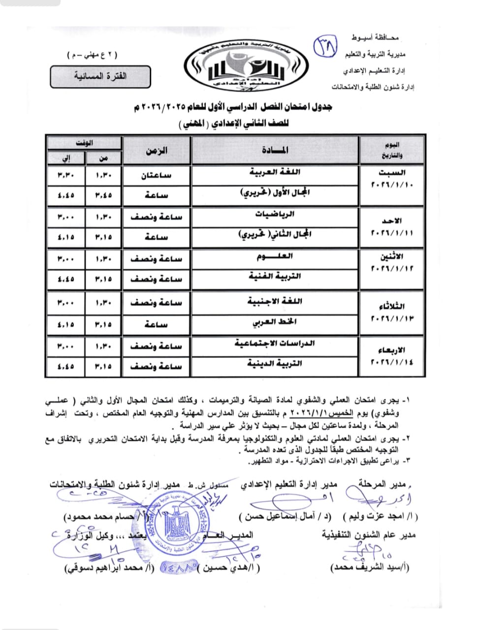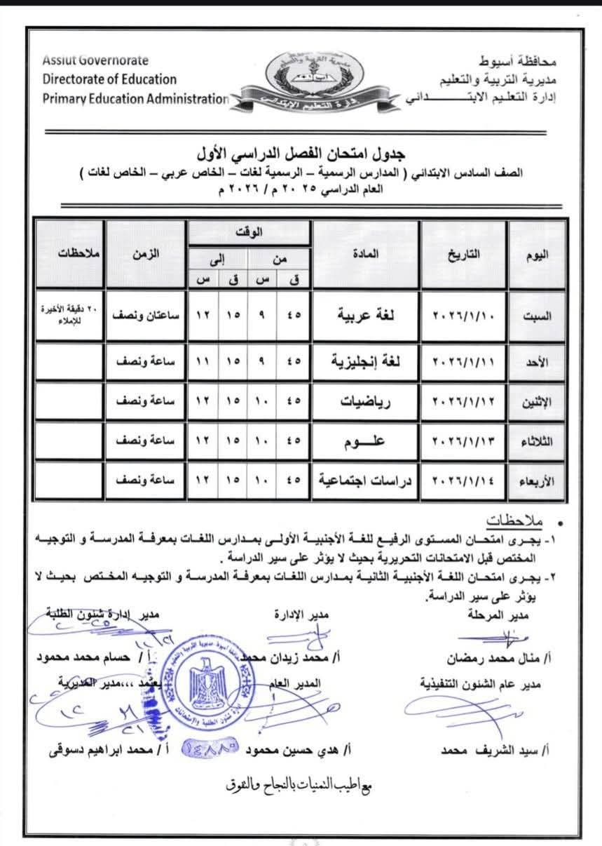 اعتمد محمد ابراهيم دسوقى وكيل وزارة التربية والتعليم بأسيوط اليوم "الأحد" جداول امتحانات الفصل الدراسى الأول للعام الدراسى ( 2025-2026) للصفوف الدراسية بمختلف مراحل التعليم ( الابتدائية - الإعدادية - الثانوية ) بالإضافة إلى التعليم الفنى بمختلف مراحله ومدارس التربية الخاصة والتعليم المهنى ومدارس المجتمع ونظام الجدارات.