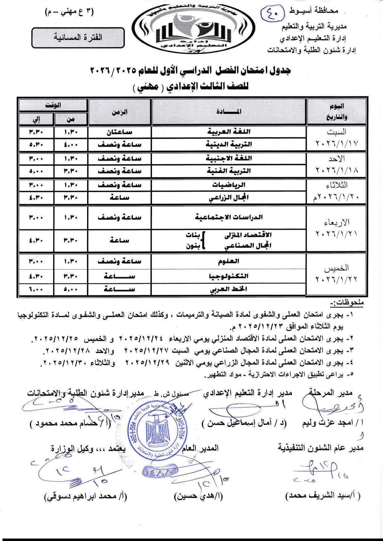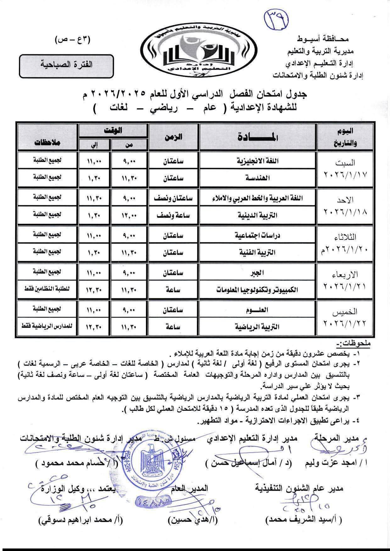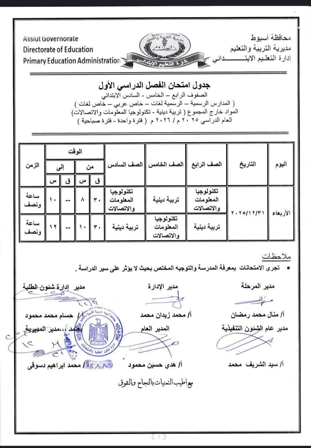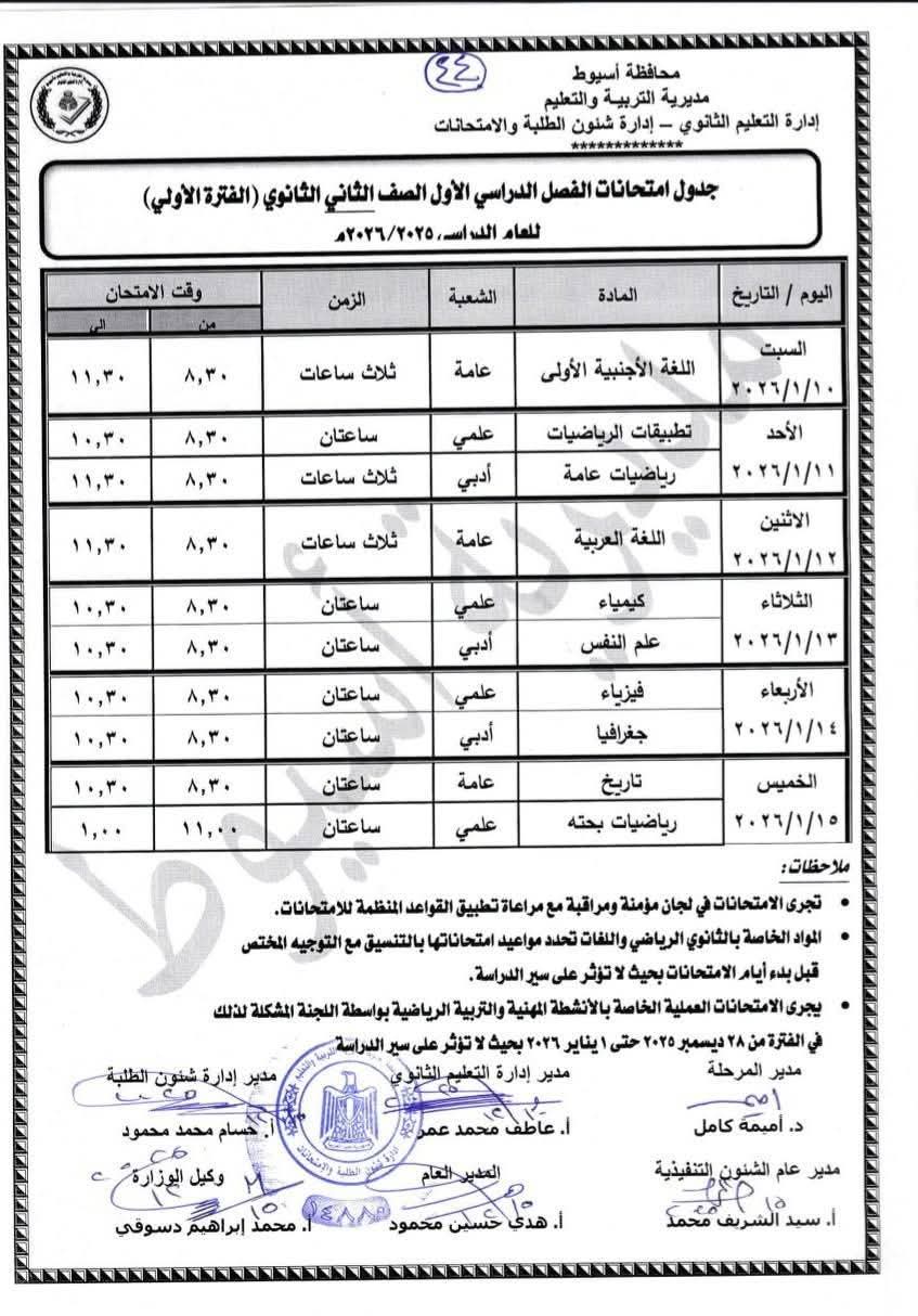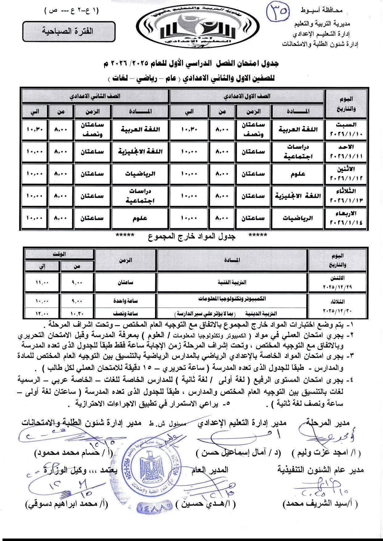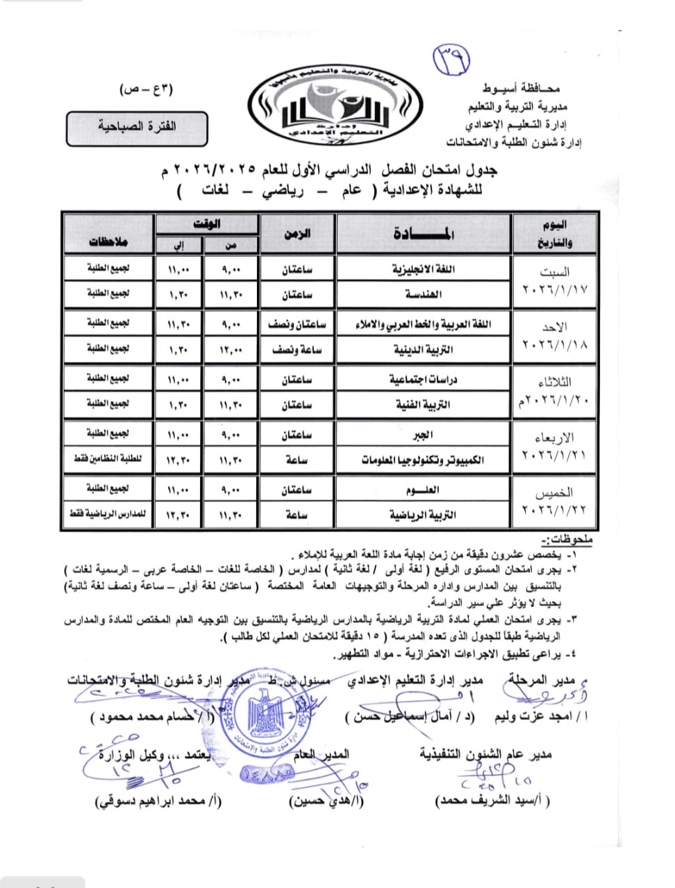 اعتمد محمد ابراهيم دسوقى وكيل وزارة التربية والتعليم بأسيوط اليوم "الأحد" جداول امتحانات الفصل الدراسى الأول للعام الدراسى ( 2025-2026) للصفوف الدراسية بمختلف مراحل التعليم ( الابتدائية - الإعدادية - الثانوية ) بالإضافة إلى التعليم الفنى بمختلف مراحله ومدارس التربية الخاصة والتعليم المهنى ومدارس المجتمع ونظام الجدارات.