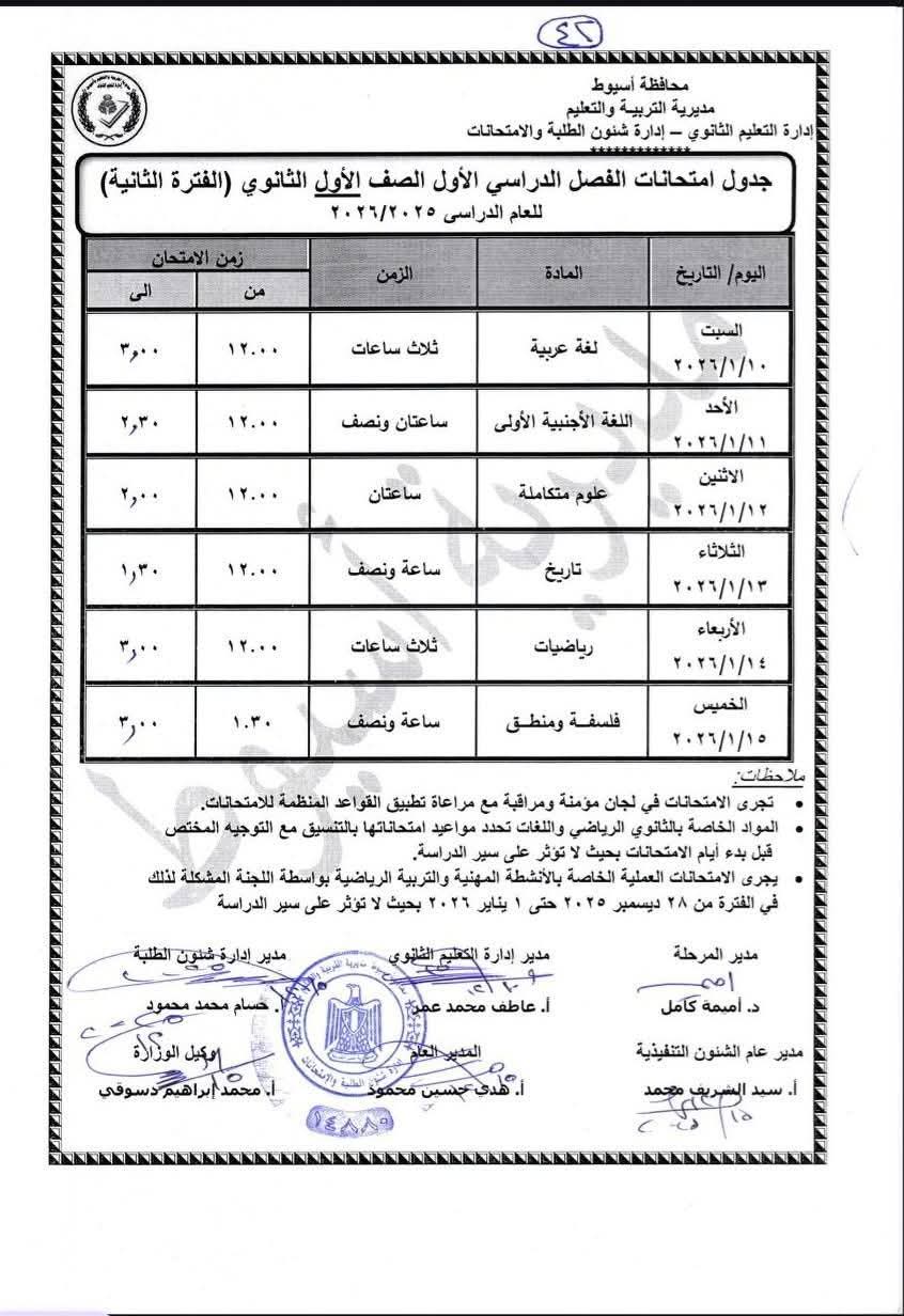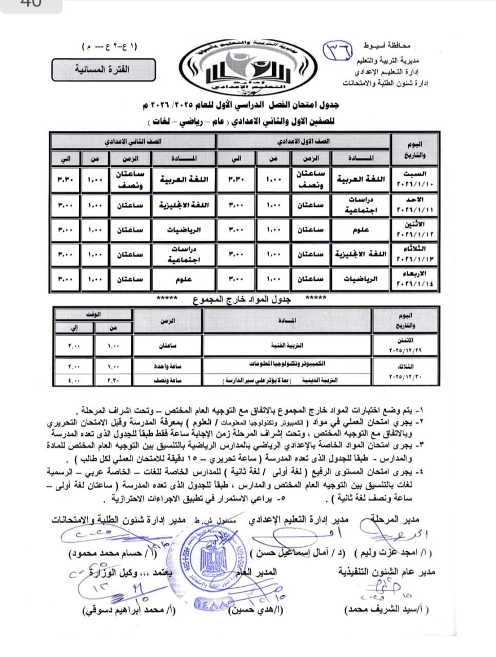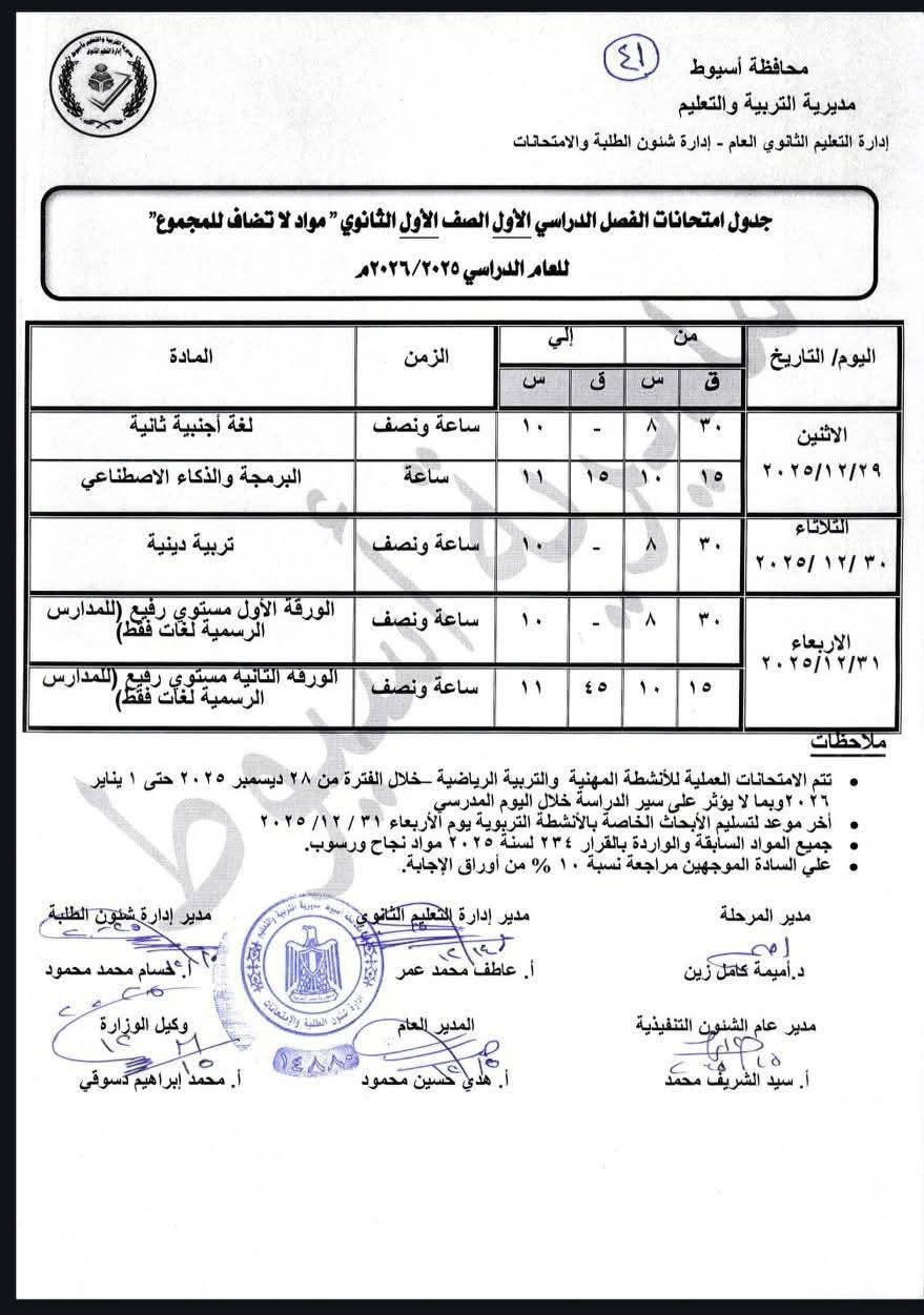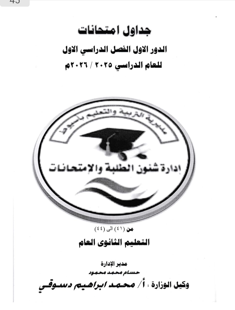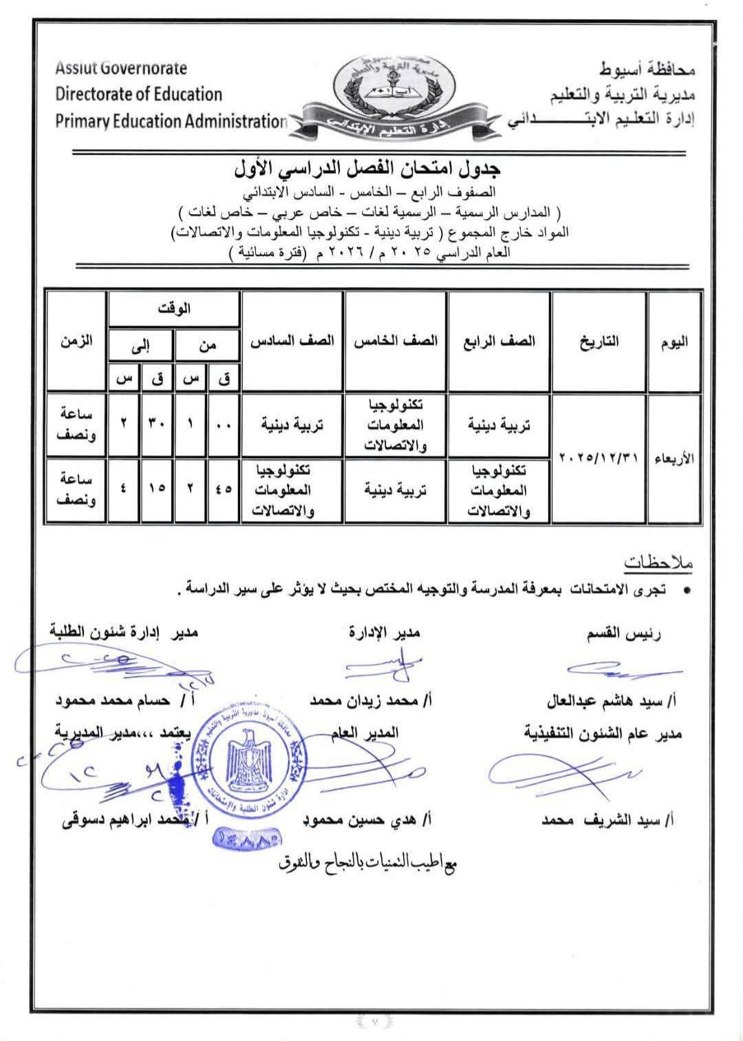 اعتمد محمد ابراهيم دسوقى وكيل وزارة التربية والتعليم بأسيوط اليوم "الأحد" جداول امتحانات الفصل الدراسى الأول للعام الدراسى ( 2025-2026) للصفوف الدراسية بمختلف مراحل التعليم ( الابتدائية - الإعدادية - الثانوية ) بالإضافة إلى التعليم الفنى بمختلف مراحله ومدارس التربية الخاصة والتعليم المهنى ومدارس المجتمع ونظام الجدارات.