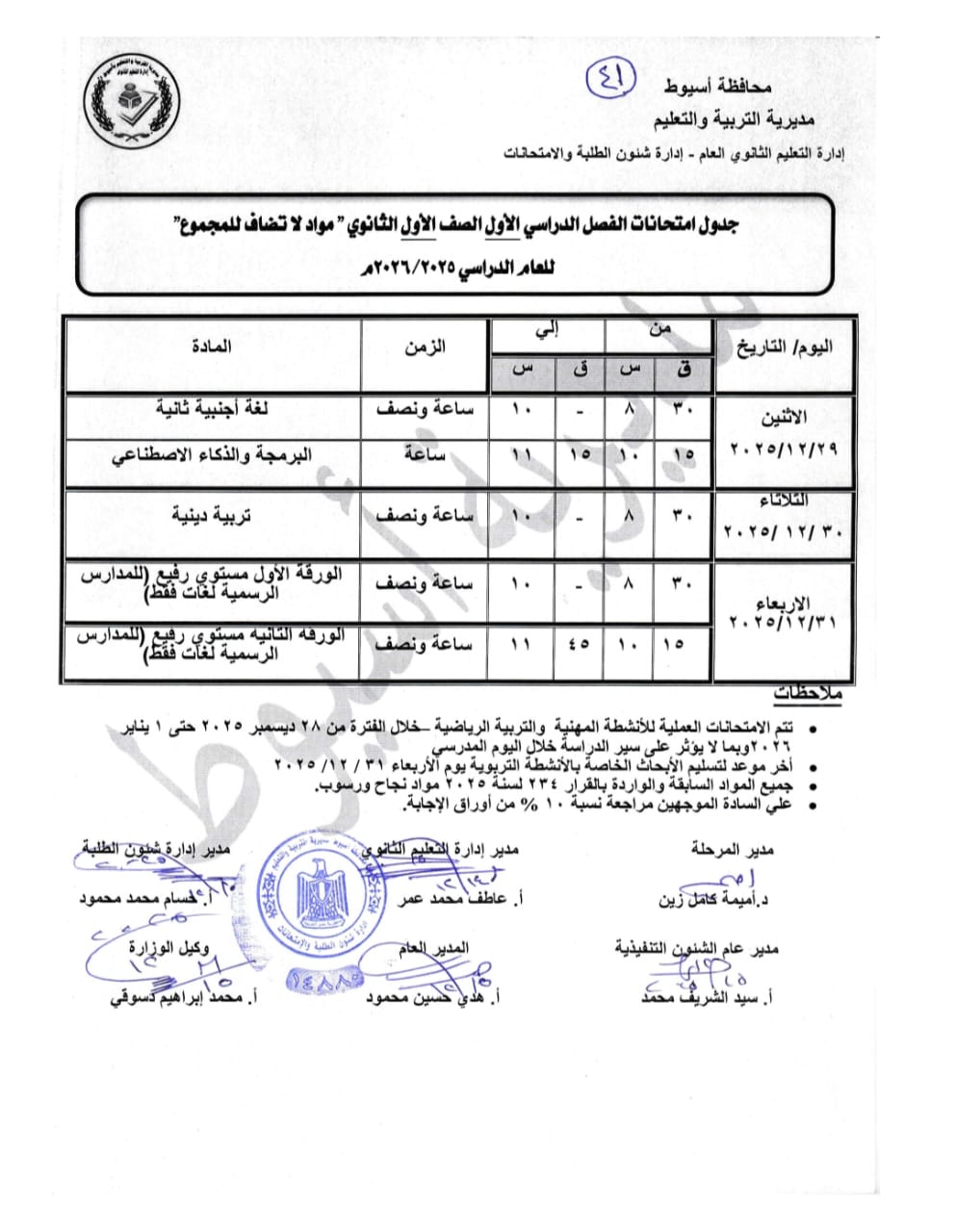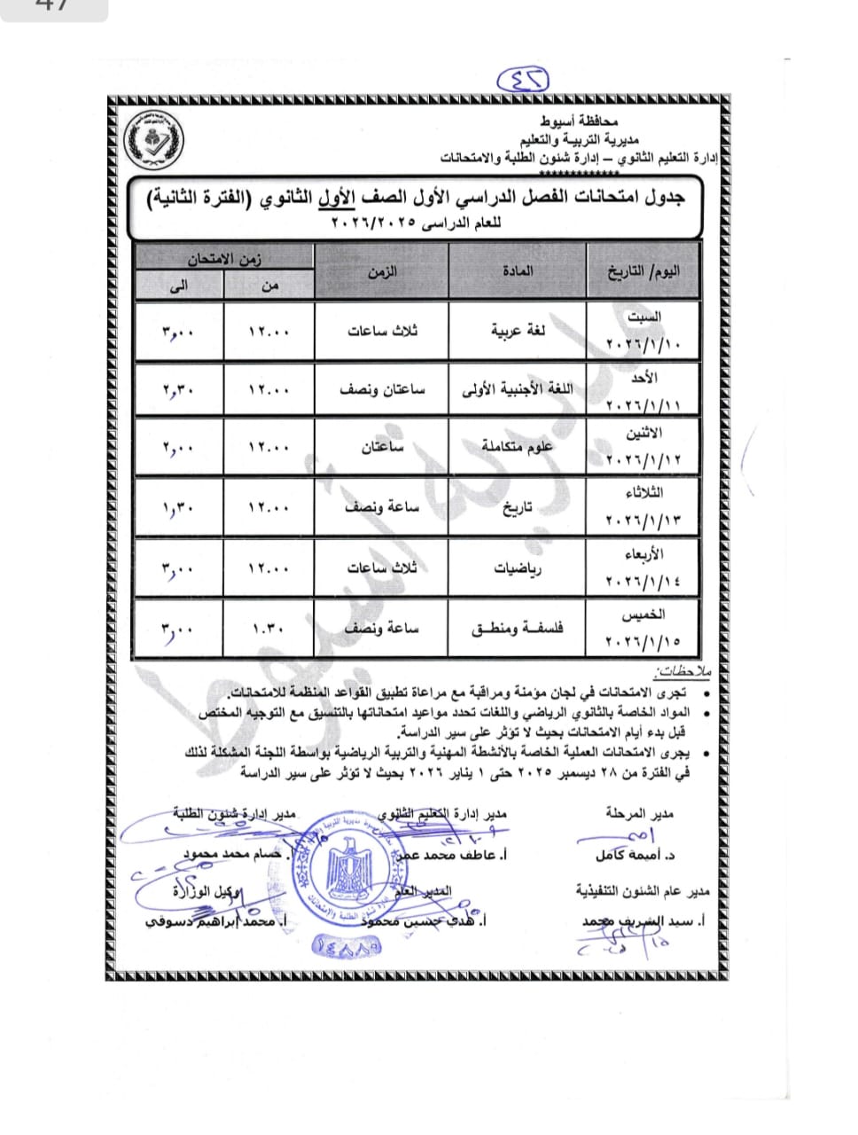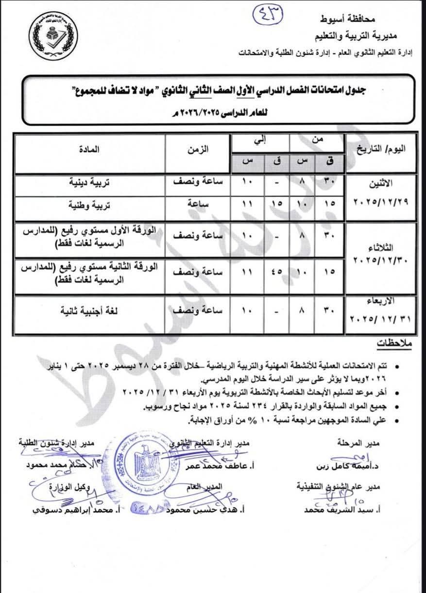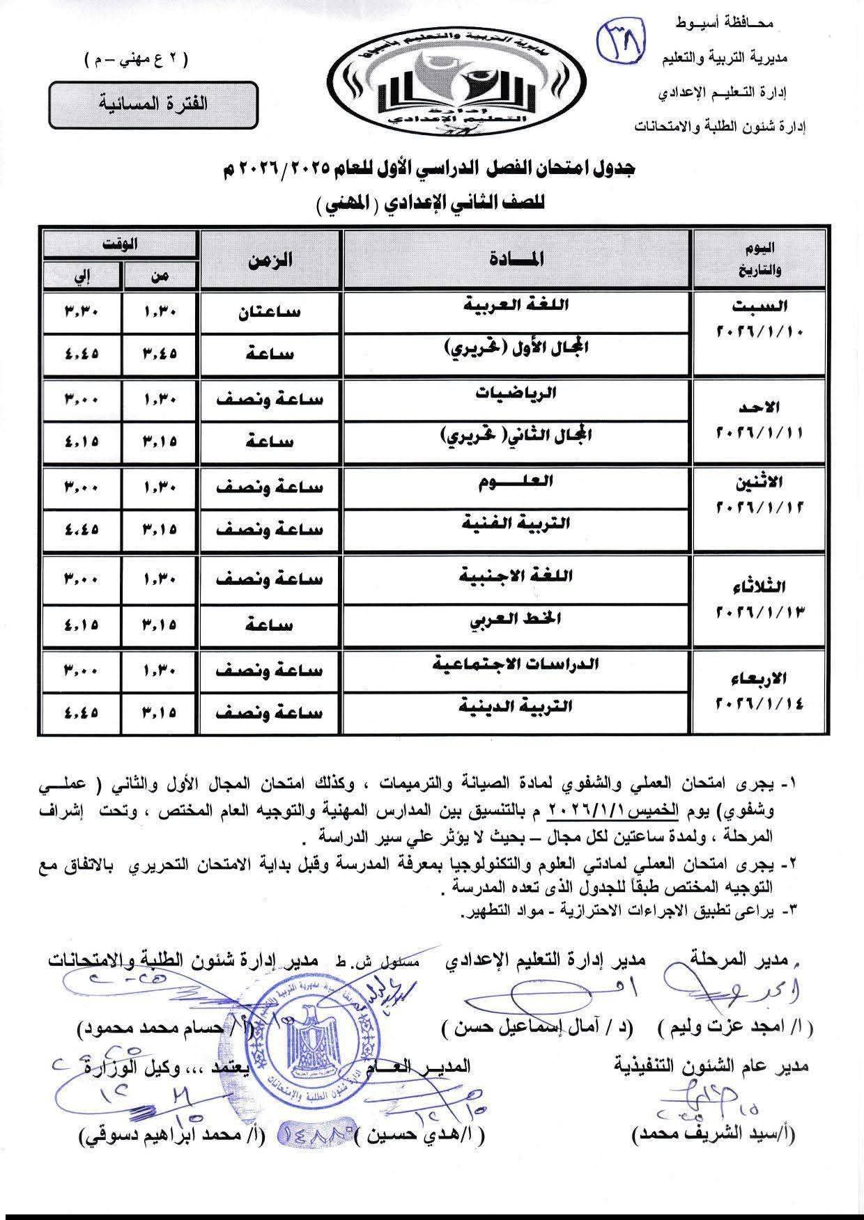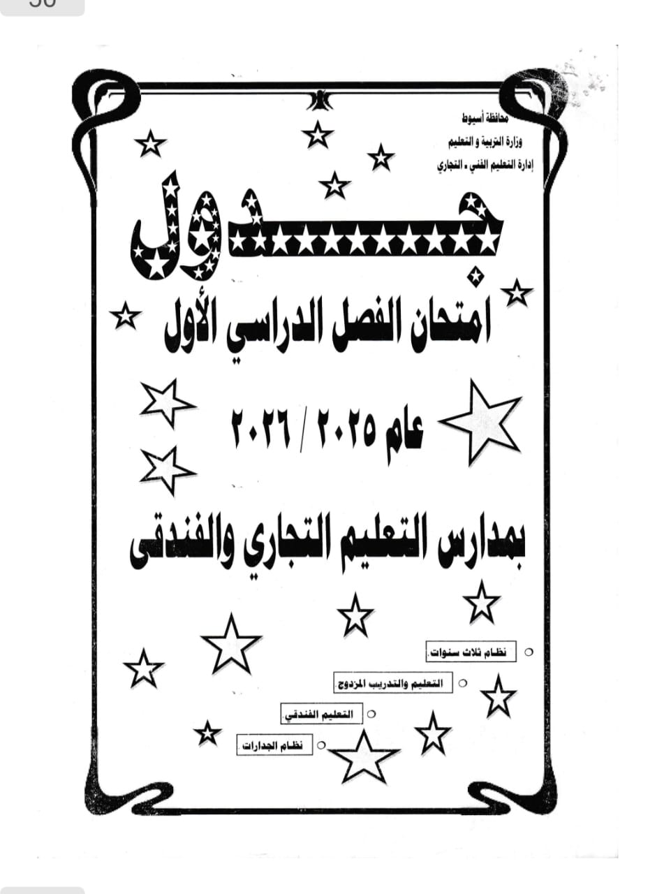 اعتمد محمد ابراهيم دسوقى وكيل وزارة التربية والتعليم بأسيوط اليوم "الأحد" جداول امتحانات الفصل الدراسى الأول للعام الدراسى ( 2025-2026) للصفوف الدراسية بمختلف مراحل التعليم ( الابتدائية - الإعدادية - الثانوية ) بالإضافة إلى التعليم الفنى بمختلف مراحله ومدارس التربية الخاصة والتعليم المهنى ومدارس المجتمع ونظام الجدارات.