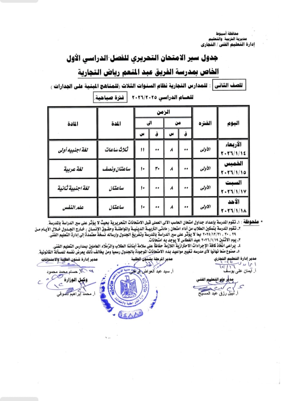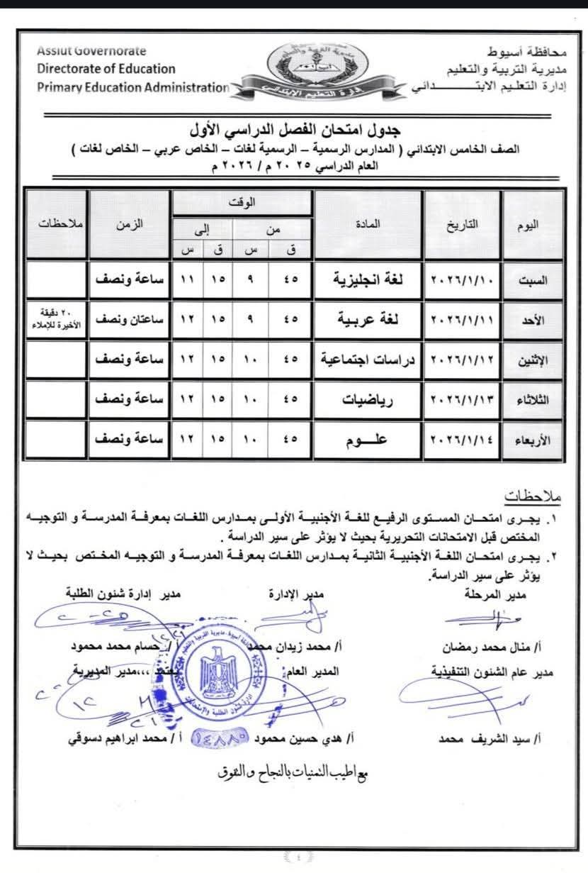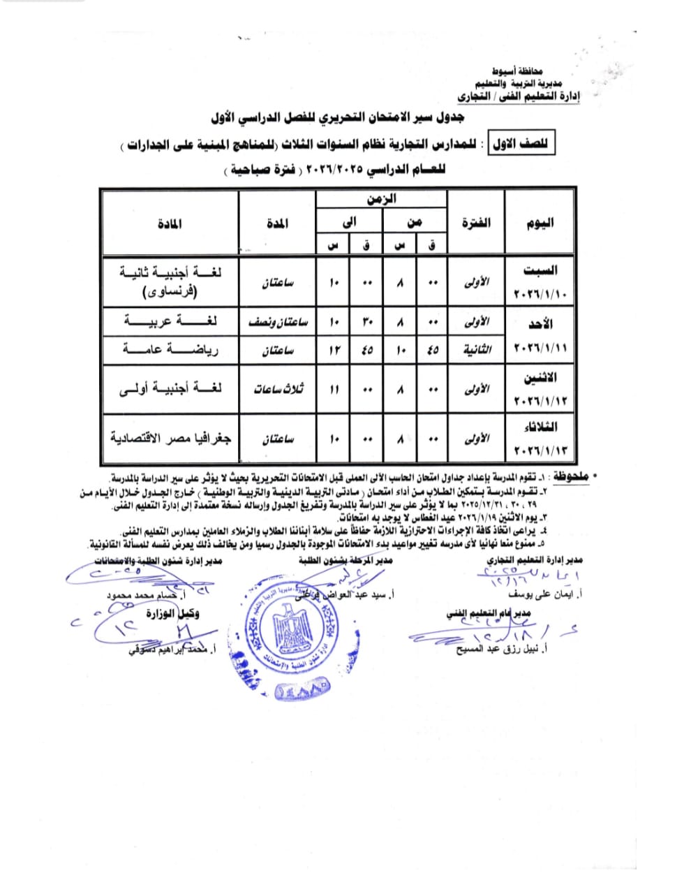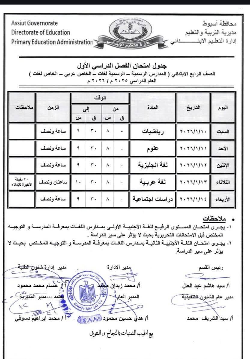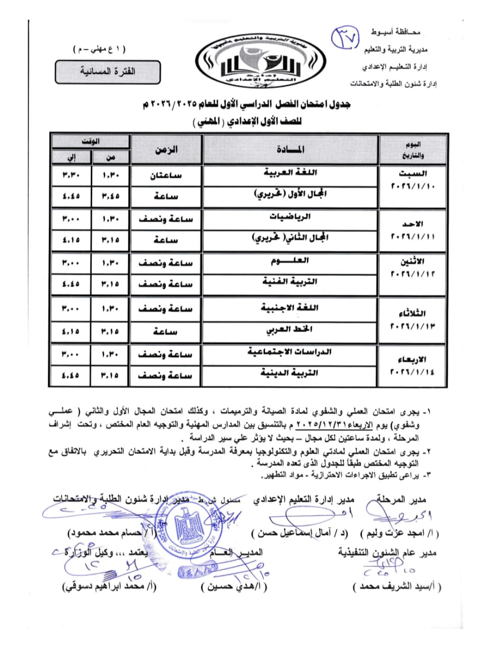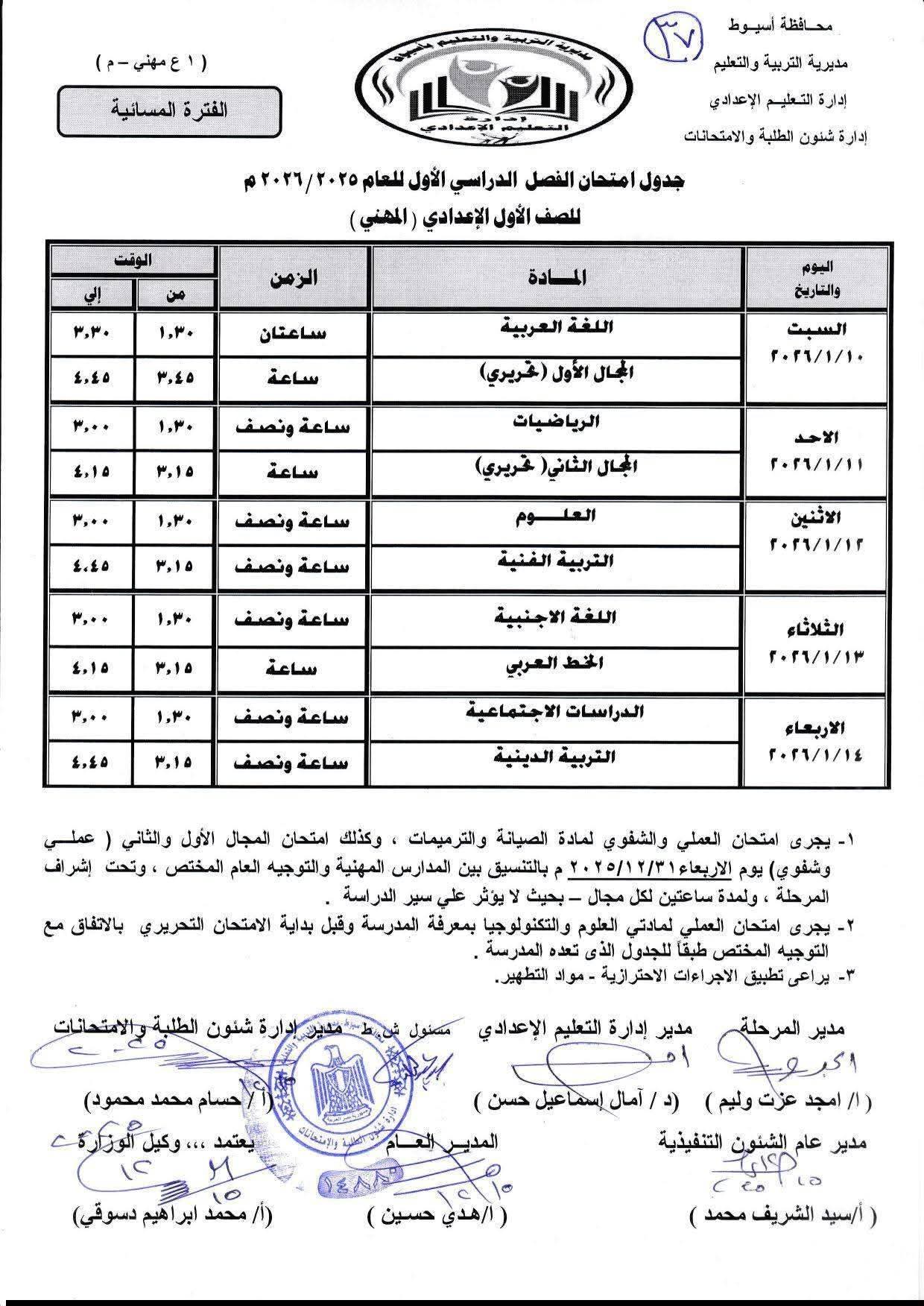 اعتمد محمد ابراهيم دسوقى وكيل وزارة التربية والتعليم بأسيوط اليوم "الأحد" جداول امتحانات الفصل الدراسى الأول للعام الدراسى ( 2025-2026) للصفوف الدراسية بمختلف مراحل التعليم ( الابتدائية - الإعدادية - الثانوية ) بالإضافة إلى التعليم الفنى بمختلف مراحله ومدارس التربية الخاصة والتعليم المهنى ومدارس المجتمع ونظام الجدارات.