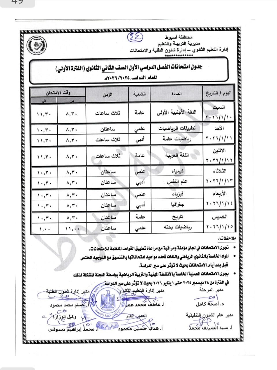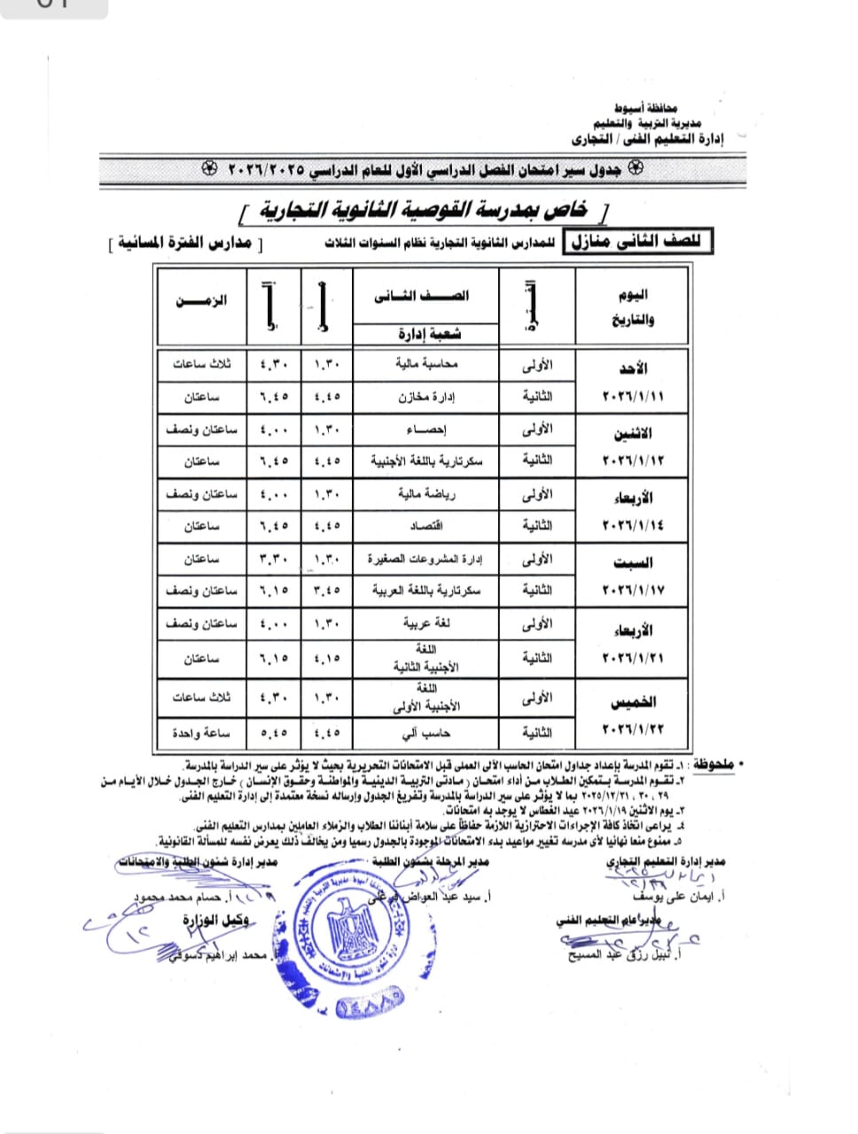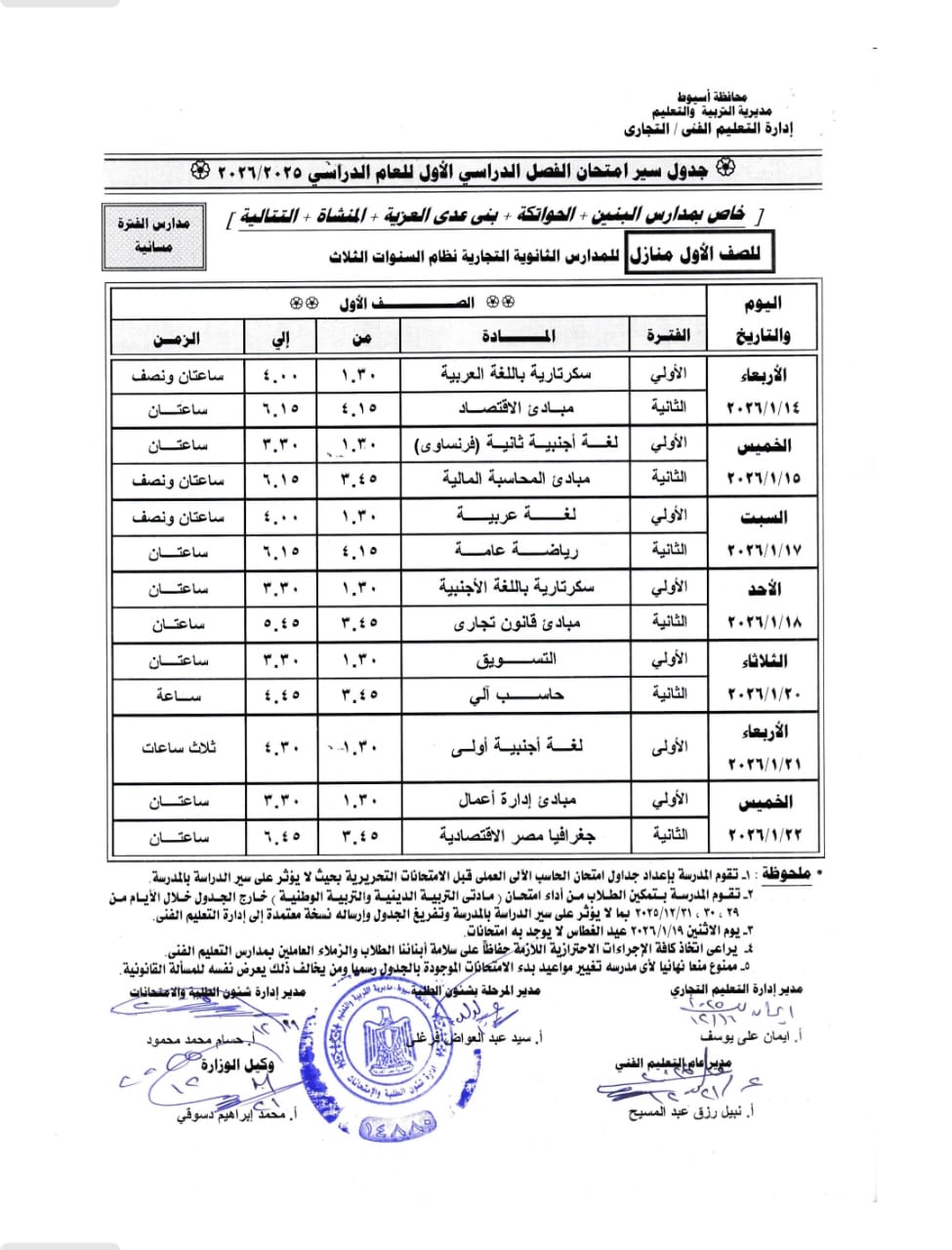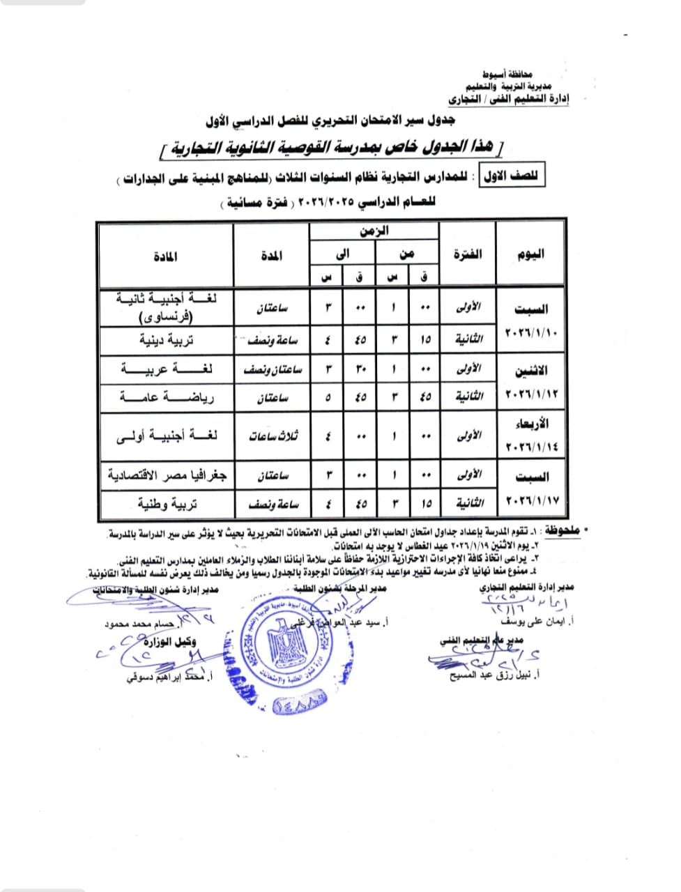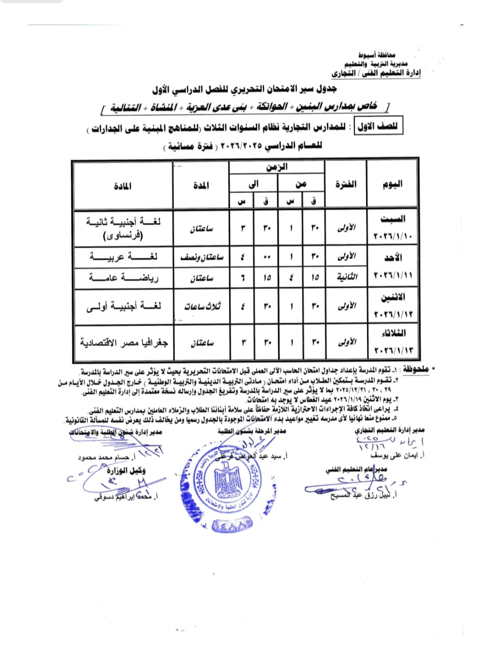 اعتمد محمد ابراهيم دسوقى وكيل وزارة التربية والتعليم بأسيوط اليوم "الأحد" جداول امتحانات الفصل الدراسى الأول للعام الدراسى ( 2025-2026) للصفوف الدراسية بمختلف مراحل التعليم ( الابتدائية - الإعدادية - الثانوية ) بالإضافة إلى التعليم الفنى بمختلف مراحله ومدارس التربية الخاصة والتعليم المهنى ومدارس المجتمع ونظام الجدارات.