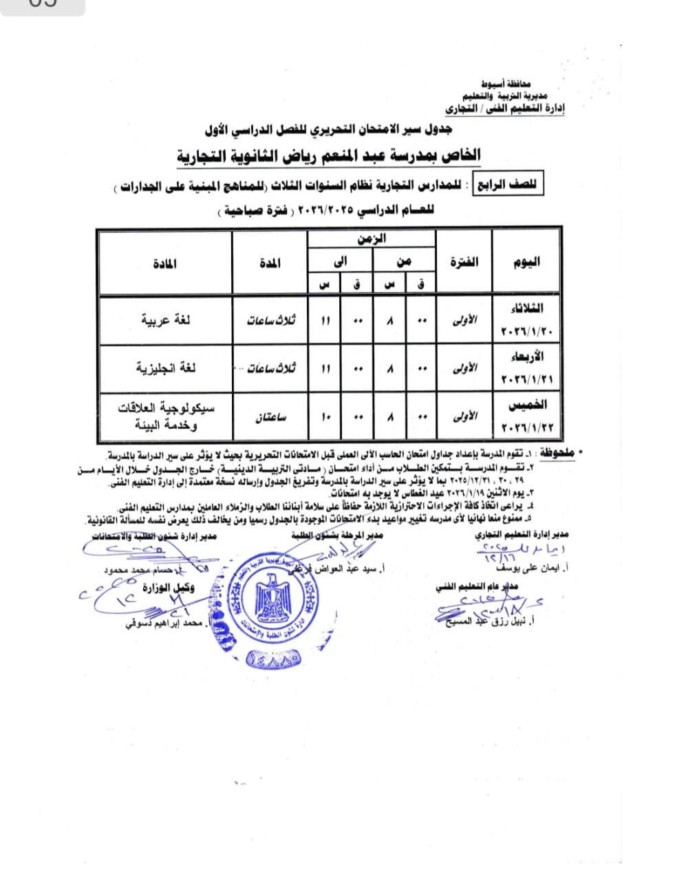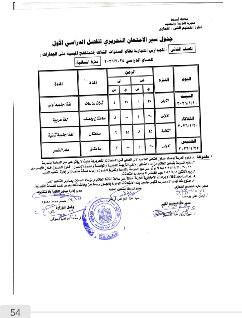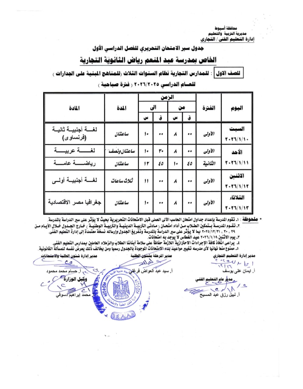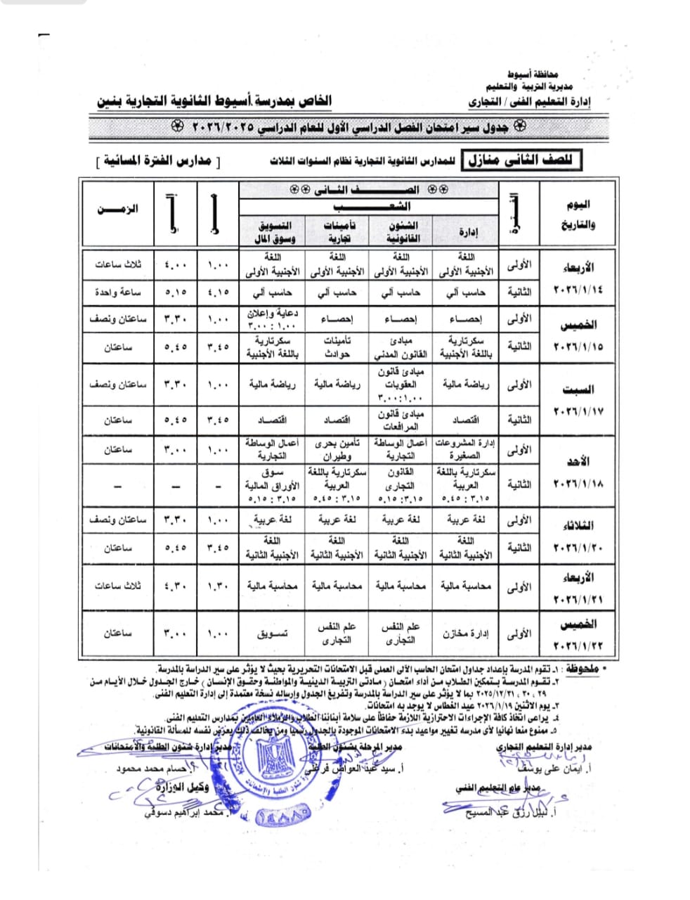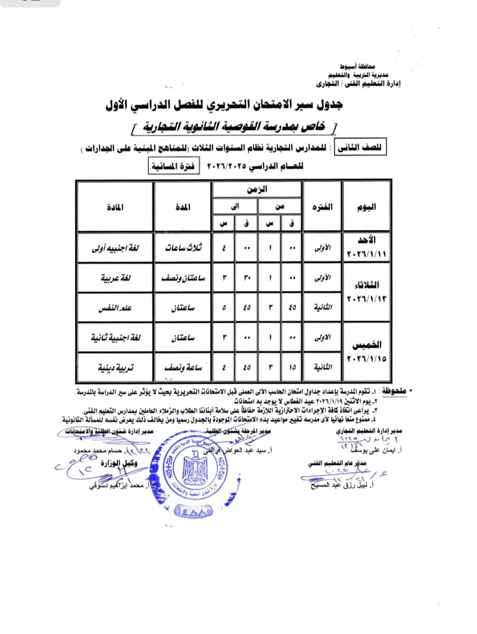 اعتمد محمد ابراهيم دسوقى وكيل وزارة التربية والتعليم بأسيوط اليوم "الأحد" جداول امتحانات الفصل الدراسى الأول للعام الدراسى ( 2025-2026) للصفوف الدراسية بمختلف مراحل التعليم ( الابتدائية - الإعدادية - الثانوية ) بالإضافة إلى التعليم الفنى بمختلف مراحله ومدارس التربية الخاصة والتعليم المهنى ومدارس المجتمع ونظام الجدارات.