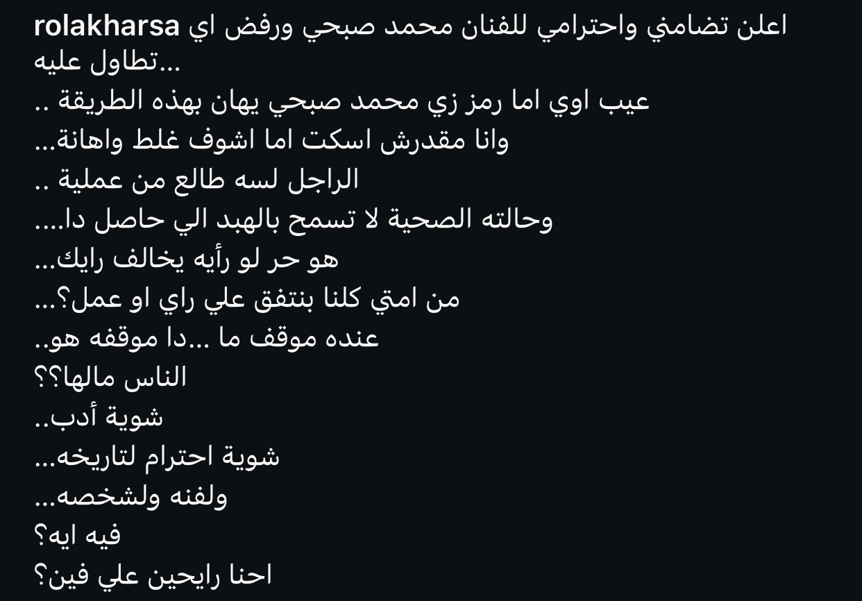 وكتبت خرسا عبر حسابها الشخصي بموقع التواصل الاجتماعي إنستجرام: "أعلن تضامني واحترامي للفنان محمد صبحي ورفض اي تطاول عليه، عيب اوي اما رمز زي محمد صبحي يهان بهذه الطريقة، وانا مقدرش اسكت اما اشوف غلط واهانة".