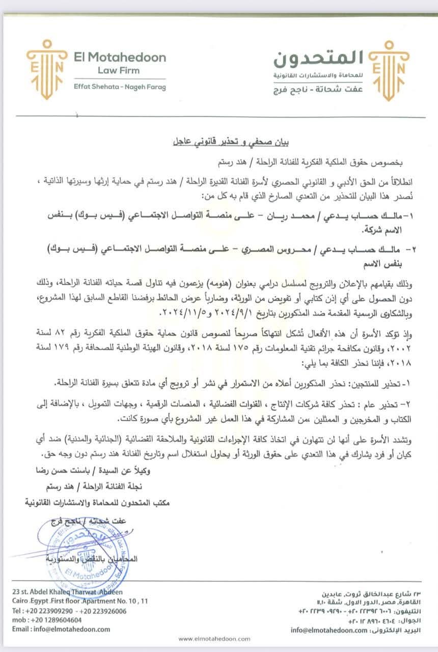 أصدر ورثة الفنانة هند رستم بيان صحفي بخصوص قيام بعض الأشخاص بالإتفاق علي إنتاج عمل درامي يتناول سيرتها الشخصية دون الرجوع إليهم وبدون علمهم، وجاء في البيان، بخصوص حقوق الملكية الفكرية للفنانة الراحلة هند رستم انطلاقاً من الحق الأدبي و القانوني الحصري لأسرة الفنانة القديرة تصدر هذا البيان للتحذير من التعدي الصارخ الذي قام به كل من م ر - م ا - على منصة التواصل الاجتماعي (فيس بوك) وذلك بقيامهم بالإعلان والترويج لمسلسل درامي بعنوان (هنومه) يزعمون فيه تناول قصة حياة الفنانة الراحلة، وذلك دون الحصول على أي إذن كتابي أو تفويض من الورثة، وضارباً عرض الحائط برفضنا القاطع السابق لهذا المشروع وبالشكاوى الرسمية المقدمة ضد المذكورين بتاريخ ٢٠٢٤/٩/١ و ٥ / ٢٠٢٤/١١.