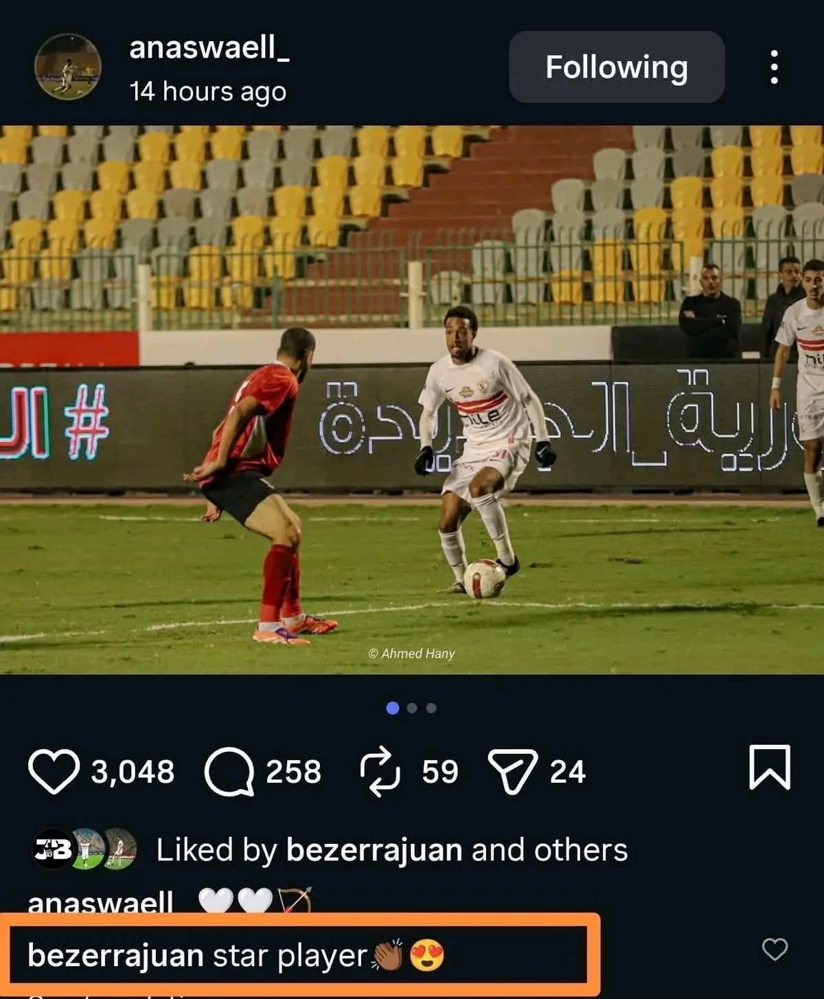 وعلق خوان بيزيرا علي المنشور الخاص بـ أمس وائل عبر موقع التواصل الاجتماعي "إنستجرام" ، وكتب:" لاعب نجم".