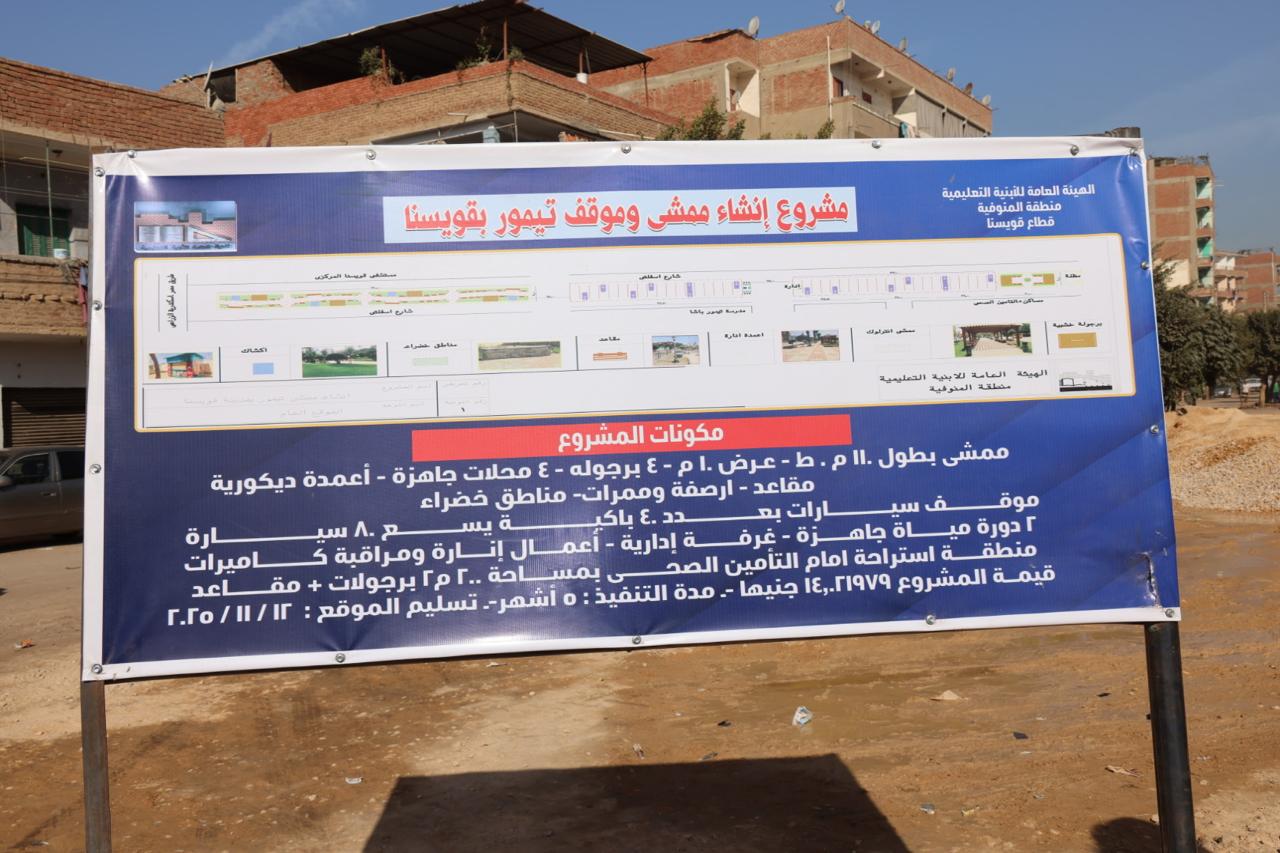 فيما تفقد محافظ المنوفية أعمال التطوير بممشى تيمور بقويسنا علي مساحة 2450م2 ، تنفيذ الهيئة العامة للأبنية التعليمية ، وإستمع لشرح تفصيلي عن أعمال التطوير والتي تضم برجولات خشبية ، أعمدة ديكورية ،مناطق خضراء ، بلاط إنترلوك ، مقاعد للمواطنين ، أحواض زهور ونباتات ، دورات مياه ، واكد المحافظ علي ضرورة المتابعة الميدانية المستمرة لضمان تنفيذ الأعمال وفق التوقيتات الزمنية المحددة وبمعايير الجودة المطلوبة تحقيقاً للصالح العام .