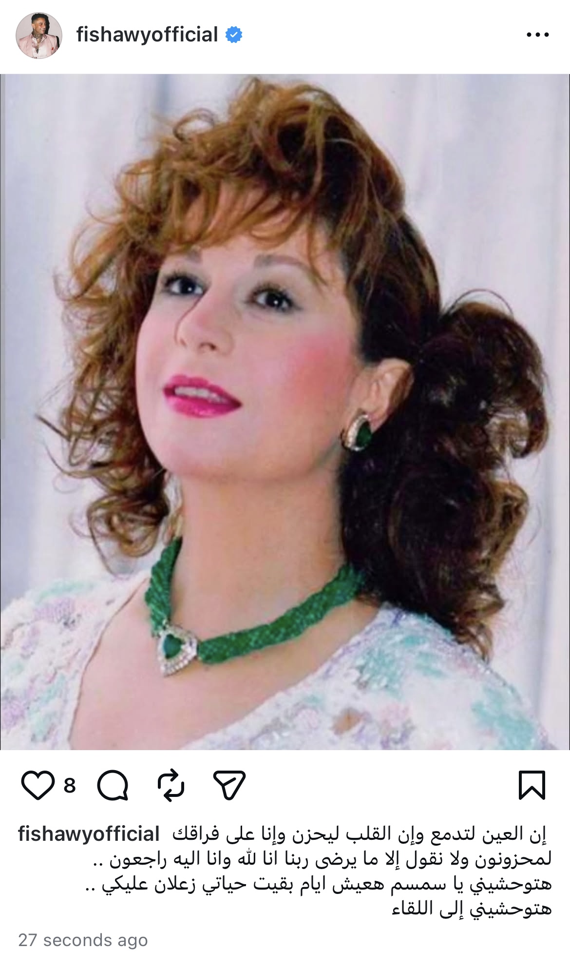 وكتب الفيشاوي: “إن العين لتدمع وإن القلب ليحزن وإنا على فراقك لمحزونون ولا نقول الإ ما يرضى ربنا إنا لله وإنا إليه راجعون”.