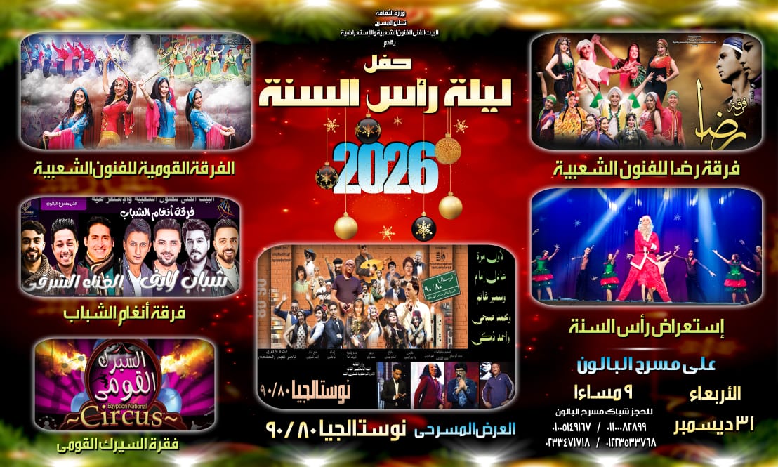 يقدم البيت الفني للفنون الشعبية والاستعراضية برئاسة الفنان تامر عبدالمنعم احتفالية رأس السنة على مسرح البالون وذلك يوم الأربعاء الموافق 31 ديسمبر.