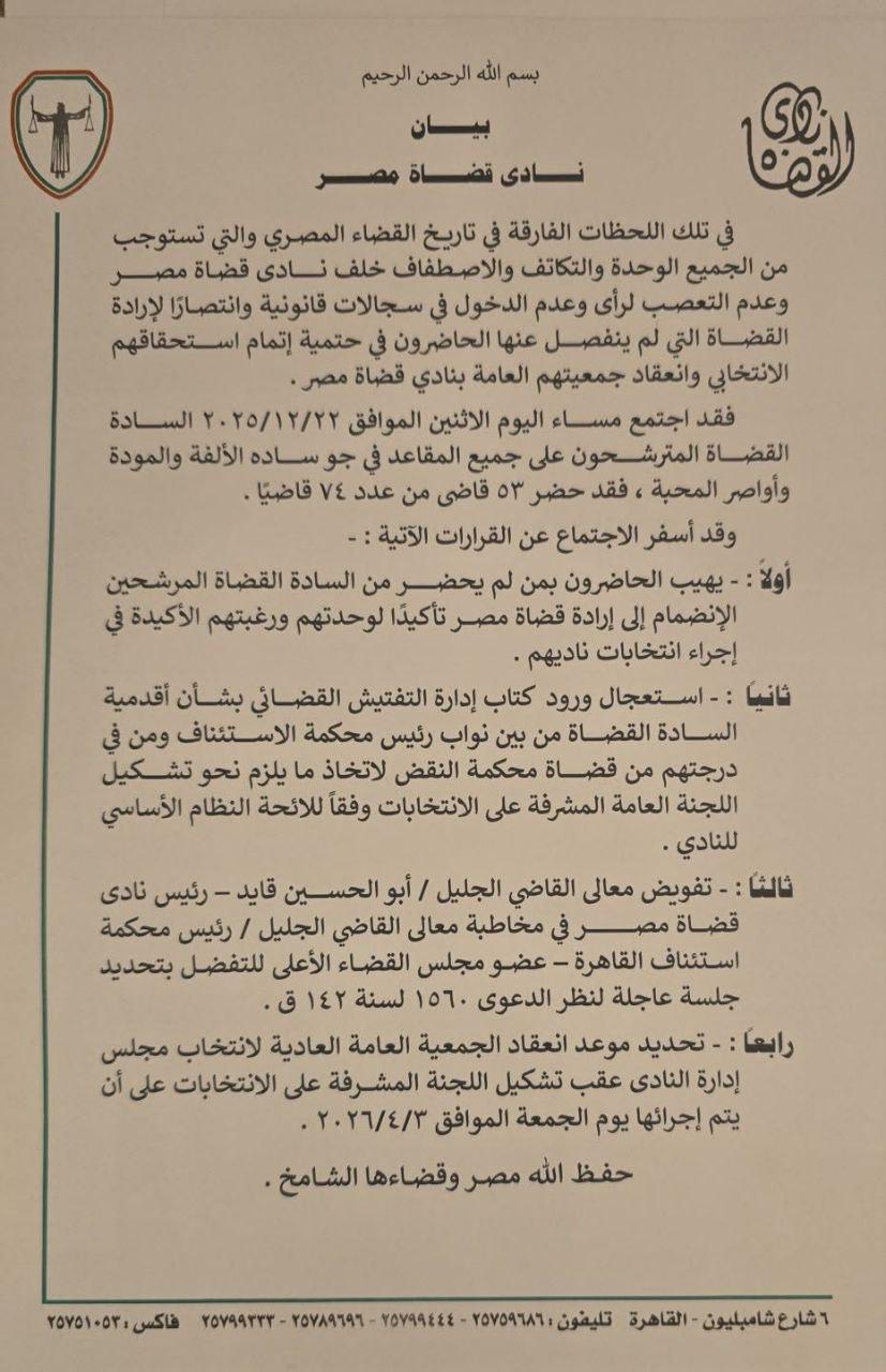 الإنضمام إلى إرادة قضاة مصر تأكيدًا لوحدتهم ورغبتهم الأكيدة في إجراء انتخابات ناديهم .
