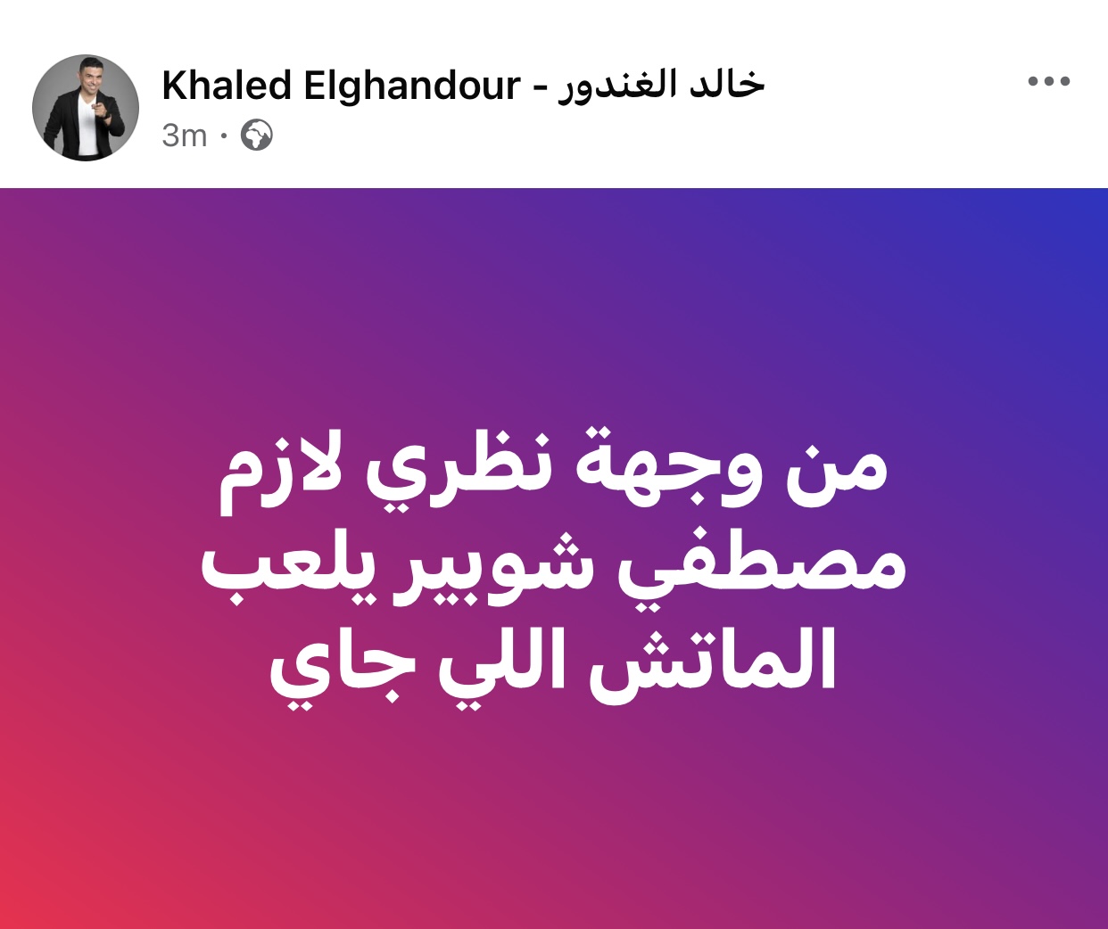 وكتب الغندور على حسابه الشخصي بموقع فيسبوك: "من وجهة نظري لازم مصطفى شوبير يلعب الماتش الجاي".