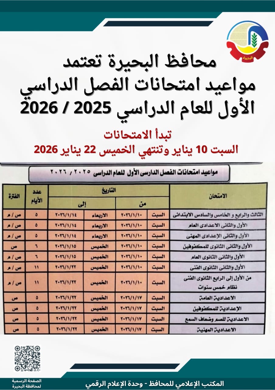 اعتمدت الدكتورة جاكلين عازر، محافظ البحيرة، مواعيد امتحانات الفصل الدراسي الأول للعام الدراسي 2025 / 2026، للمراحل التعليمية المختلفة بجميع الإدارات التعليمية بنطاق المحافظة.