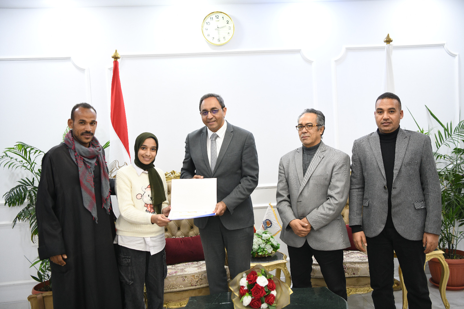 وفي ختام الاحتفالية، سلم محافظ قنا شهادة تقدير ومبلغا ماليا للدارسه دعما لطموحها وتشجيعا لها على مواصلة مسيرتها التعليمية.