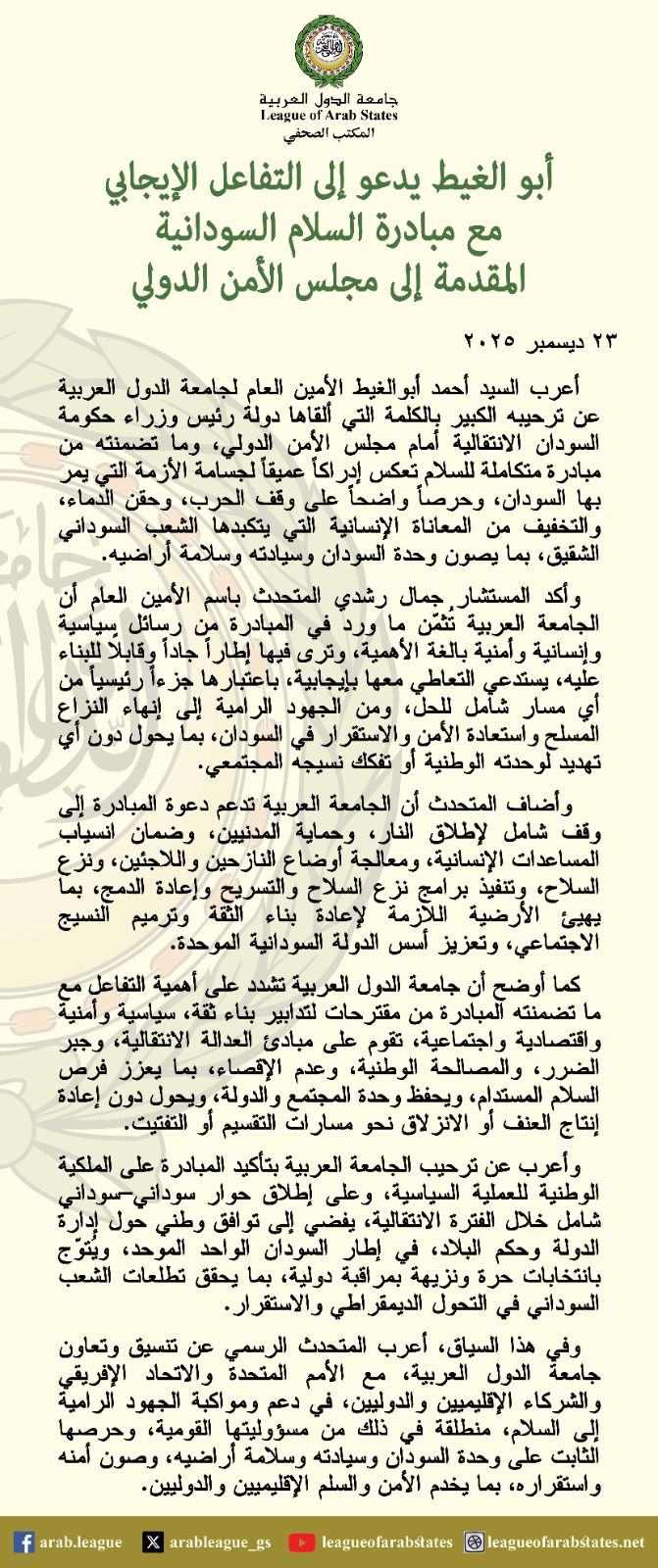 كما أوضح أن جامعة الدول العربية تشدد على أهمية التفاعل مع ما تضمنته المبادرة من مقترحات لتدابير بناء ثقة، سياسية وأمنية واقتصادية واجتماعية، تقوم على مبادئ العدالة الانتقالية، وجبر الضرر، والمصالحة الوطنية، وعدم الإقصاء، بما يعزز فرص السلام المستدام، ويحفظ وحدة المجتمع والدولة، ويحول دون إعادة إنتاج العنف أو الانزلاق نحو مسارات التقسيم أو التفتيت.