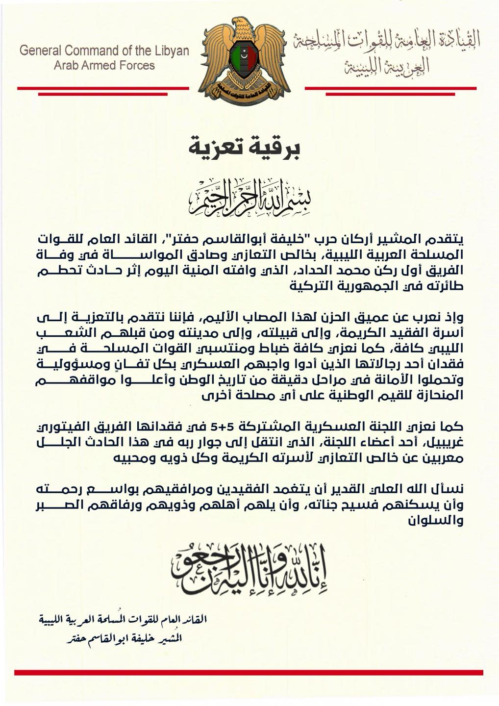 ونشرت القيادة العامة للقوات المسلحة العربية الليبية برقية تعزية من المشير خليفة حفتر، جاء فيها "بسم الله الرحمن الرحيم، يتقدم المشير أركان حرب "خليفة أبوالقاسم "حفتر"، القائد العام للقوات المسلحة العربية الليبية بخالص التعازي وصادق المواس اة في وفاة الفريق أول ركن محمد الحداد، الذي وافته المنية اليوم إثر حادث تحطم طائرته في الجمهورية التركية".