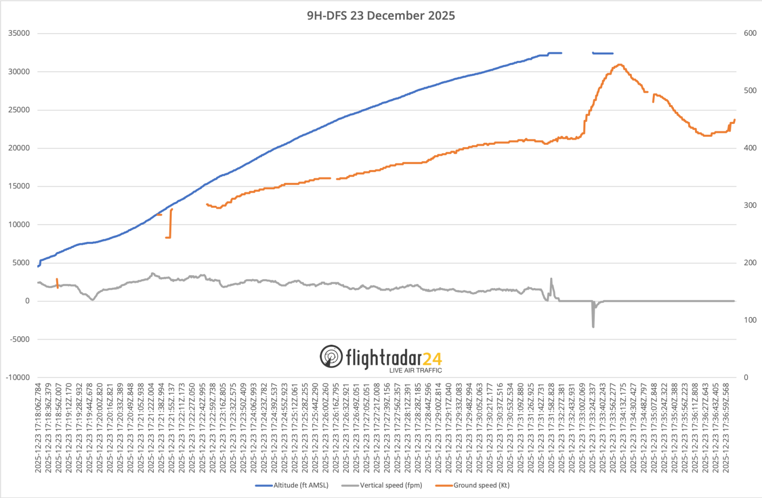 وبعد دقيقة واحدة تقريبًا، وتحديدًا عند 17:33:25، أظهرت بيانات التتبع أن الطائرة تعرضت لـ هبوط مفاجئ وحاد في الارتفاع (Negative Vertical Speed) استمر لثوانٍ معدودة، وهو مؤشر غير طبيعي أثناء مرحلة التحليق.