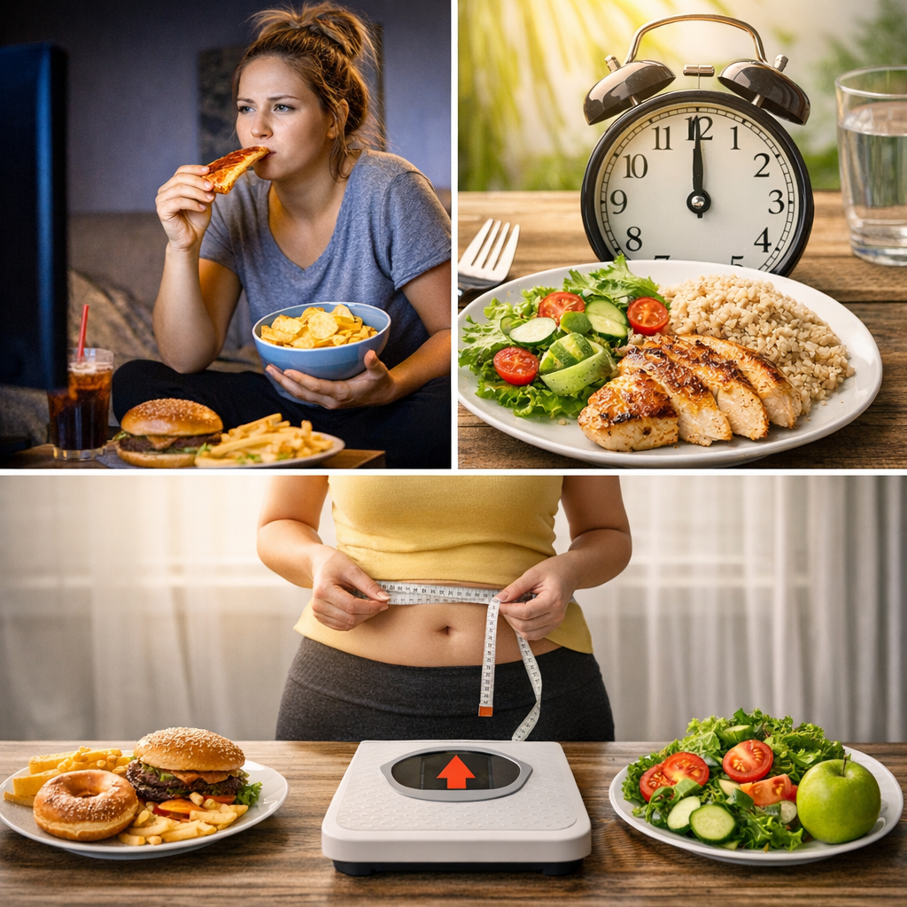 دراسات متعددة، بما فيها دراسة كبيرة في كوريا الجنوبية تضم بيانات آلاف الأشخاص، وجدت أن تناول الوجبات بعد الساعة 9 مساءً يرتبط بزيادة خطر السمنة بنسبة تصل إلى 20-34% مقارنة بتناول الوجبات خلال النهار، وتظهر تأثيرات سلبية على الصحة الأيضية.