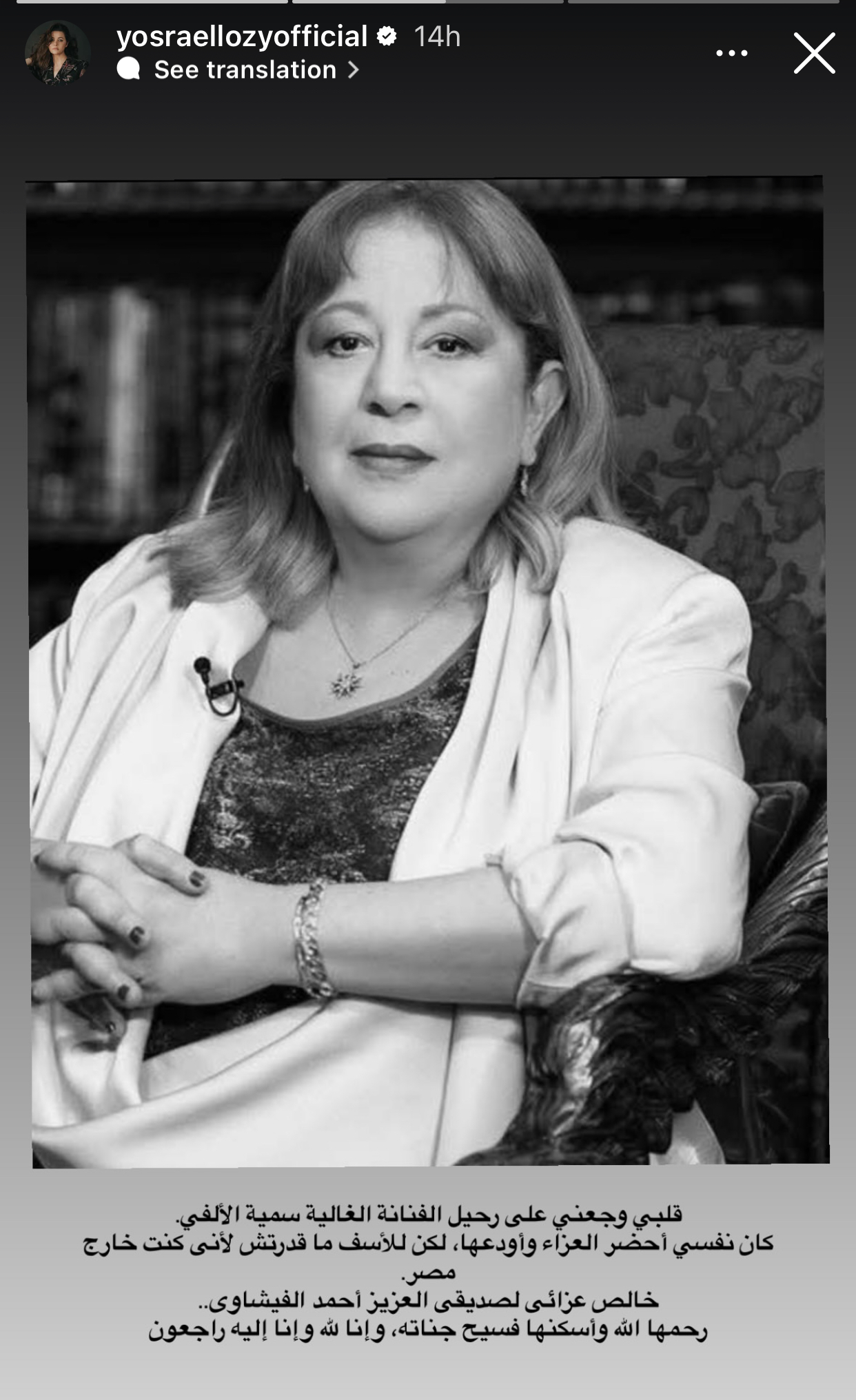 وكتبت يسرا اللوزي عبر حسابها الشخصي بموقع إنستجرام: "كان نفسي أحضر العزاء واودعها، لكن لاسف ما قدرتش لاننى كنت خارج مصر، خالص عزائى لصديقى العزيز أحمد الفيشاوى..رحمها اللّٰه وأسكنها فسيح جناته، وإنا لله وإنا إليه راجعون".