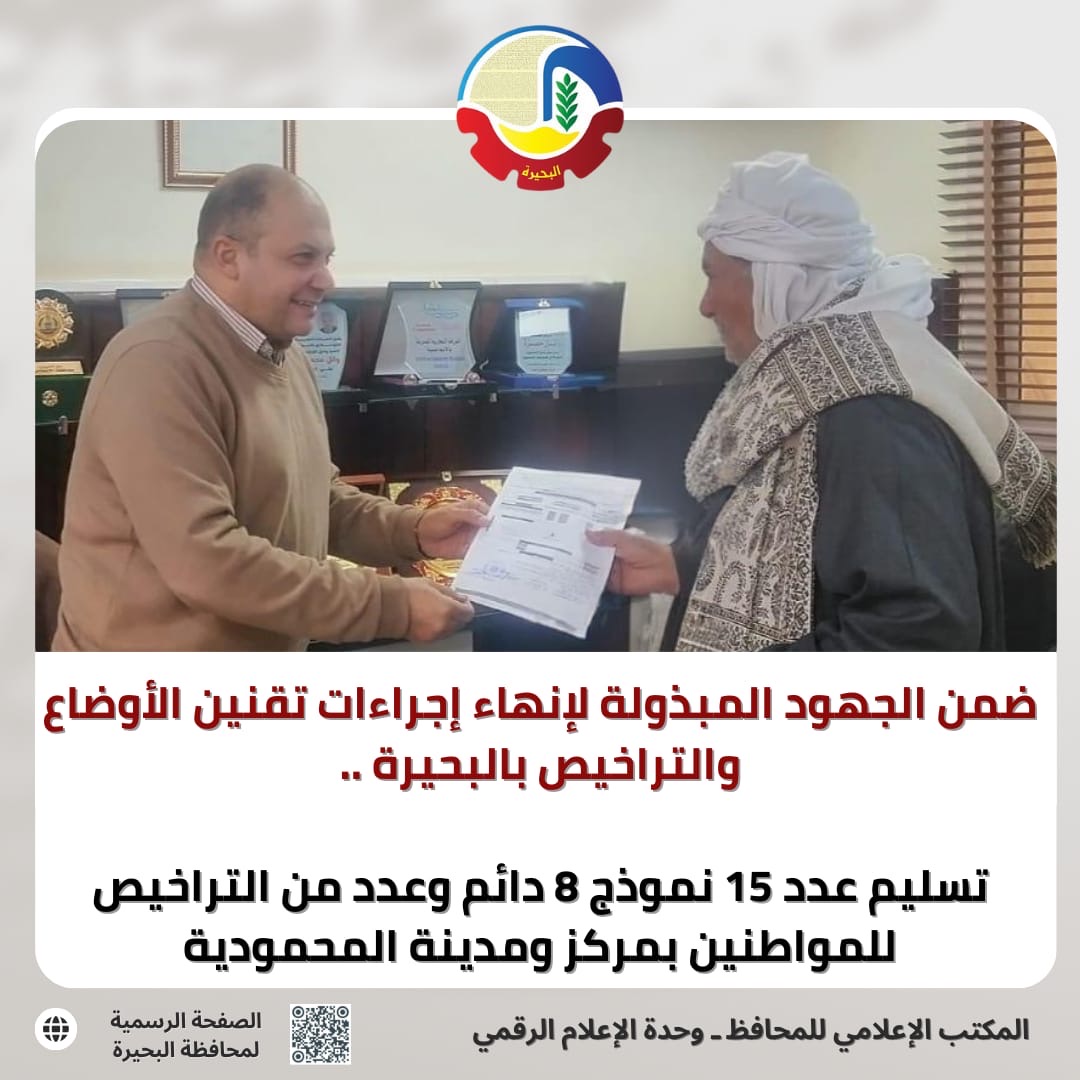 هذا وقد قامت الوحدة المحلية لمركز ومدينة المحمودية برئاسة اللواء وائل حمزة بتسليم 15 نموذج 8 دائم بالإضافة إلى تسليم عدد من تراخيص البناء للمواطنين وذلك بعد انتهاء الاجراءات واستكمال الأوراق المطلوبة.