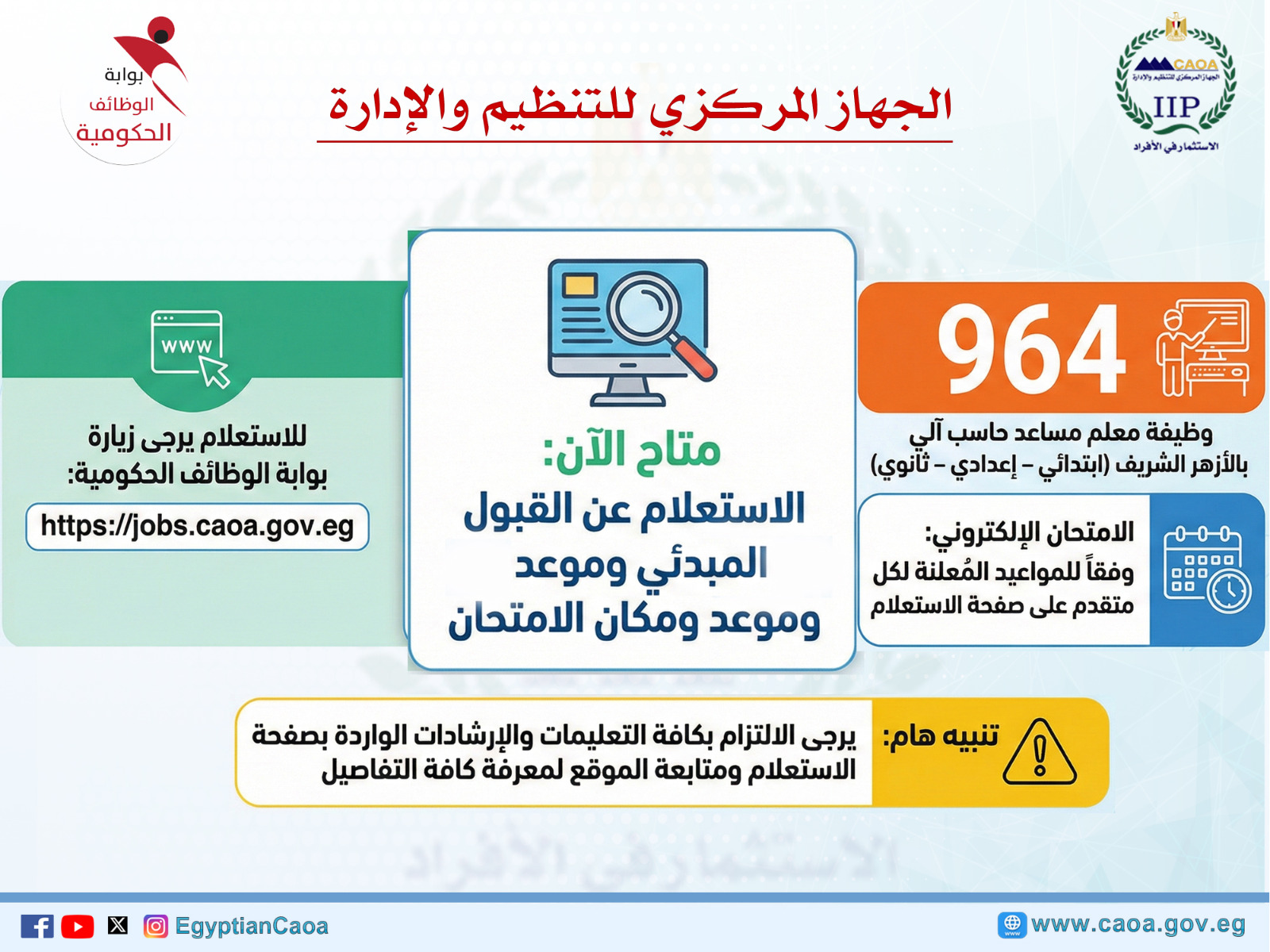 ويهيب الجهاز المركزي للتنظيم والإدارة بالمتقدمين الالتزام بكافة التعليمات والإرشادات الواردة بصفحة الاستعلام على موقع بوابة الوظائف الحكومية، ومتابعة الموقع لمعرفة كافة التفاصيل المتعلقة بالامتحانات.