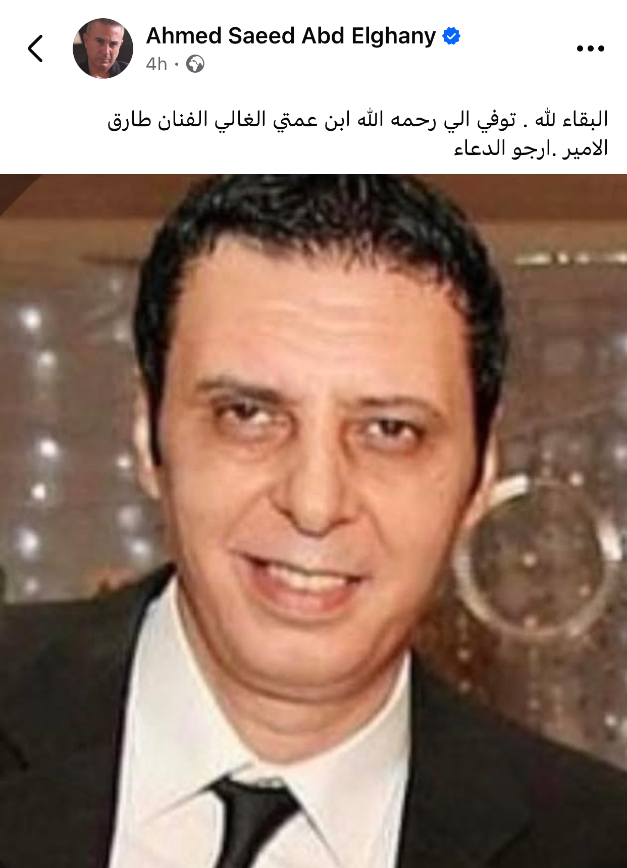 وكتب أحمد سعيد عبر حسابه الشخصي بموقع فيسبوك: "البقاء لله توفي إلى رحمة الله ابن عمتي الغالي الفنان طارق الأمير، أرجو الدعاء".
