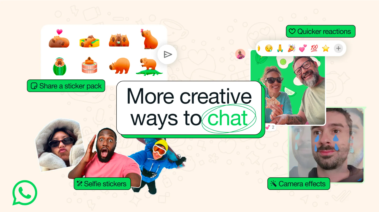 في 14 يناير 2025، استهل واتساب بداية العام بإطلاق تحسينات مميزة شملت تأثيرات الكاميرا داخل الدردشة، وملصقات السيلفي، ومشاركة حزم الملصقات، وتسريع التفاعل مع الرسائل، حيث تهدف هذه التحديثات إلى جعل التواصل أكثر سلاسة ومتعة مع الحفاظ على الخصوصية.