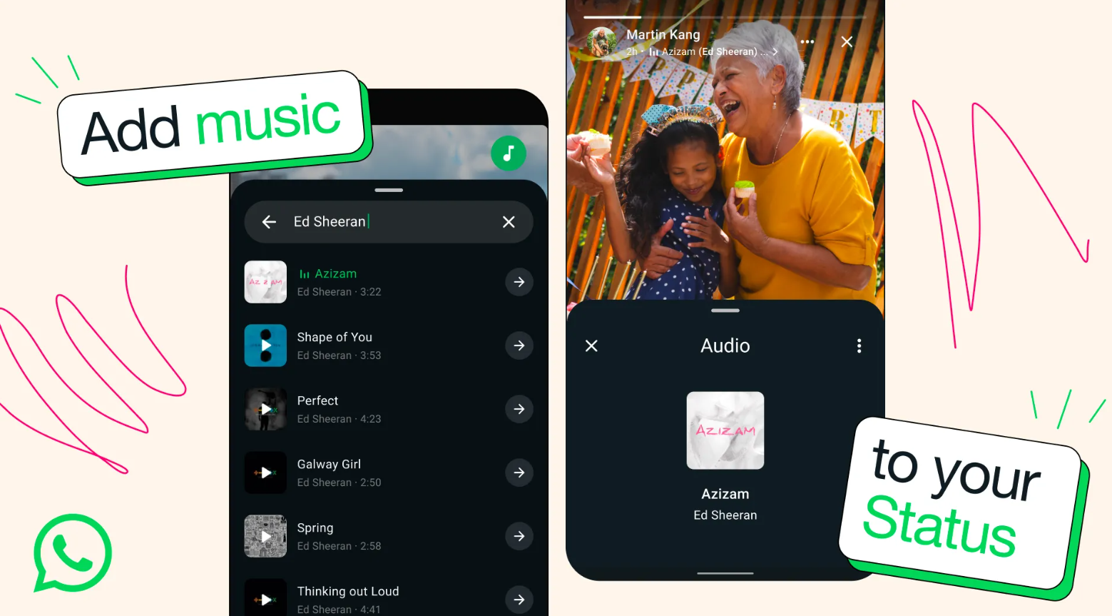 في 28 مارس 2025، أتاح واتساب للمستخدمين إضافة مقاطع موسيقية إلى تحديثات الحالة، مع مكتبة تضم ملايين الأغاني، حيث يمكن اختيار جزء محدد من الأغنية ليتناسب مع الصور أو الفيديوهات، مع الحفاظ على تشفير الحالة وعدم تتبع المحتوى الموسيقي.