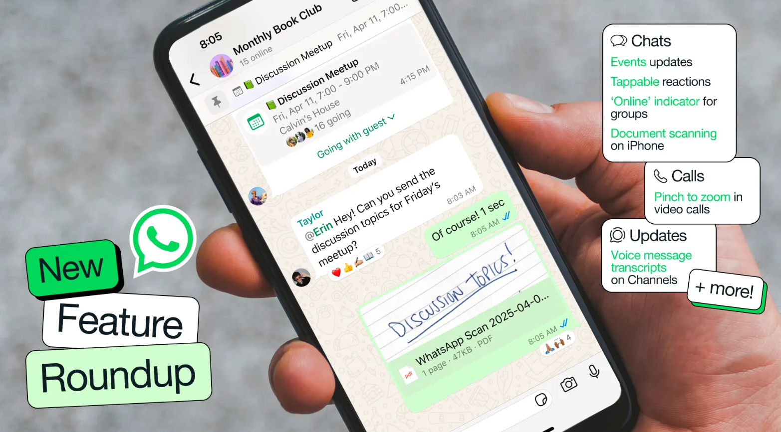 في 9 أبريل 2025، أطلق واتساب تحديثات متعددة شملت إظهار عدد المتصلين حاليا في المجموعات، وتحسين الإشعارات، وتطوير ميزة الأحداث، إضافة إلى تحسين جودة مكالمات الفيديو، كما حصلت القنوات على دعم الملاحظات المرئية، والنصوص المكتوبة للرسائل الصوتية، ورموز QR.