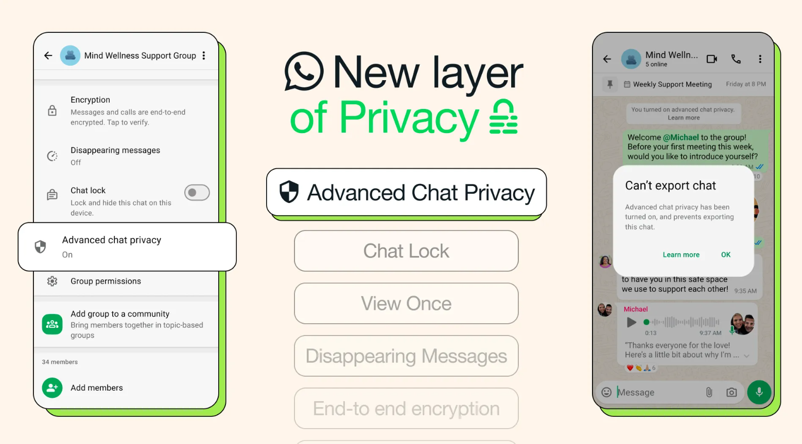 في 23 أبريل 2025، كشف واتساب عن ميزة “الخصوصية المتقدمة للمحادثات” لتعزيز حماية المحادثات الحساسة، تمنع هذه الميزة تصدير الدردشات، أو التحميل التلقائي للوسائط، أو استخدام الرسائل في ميزات الذكاء الاصطناعي، ما يمنح المستخدمين مزيدا من التحكم والثقة.