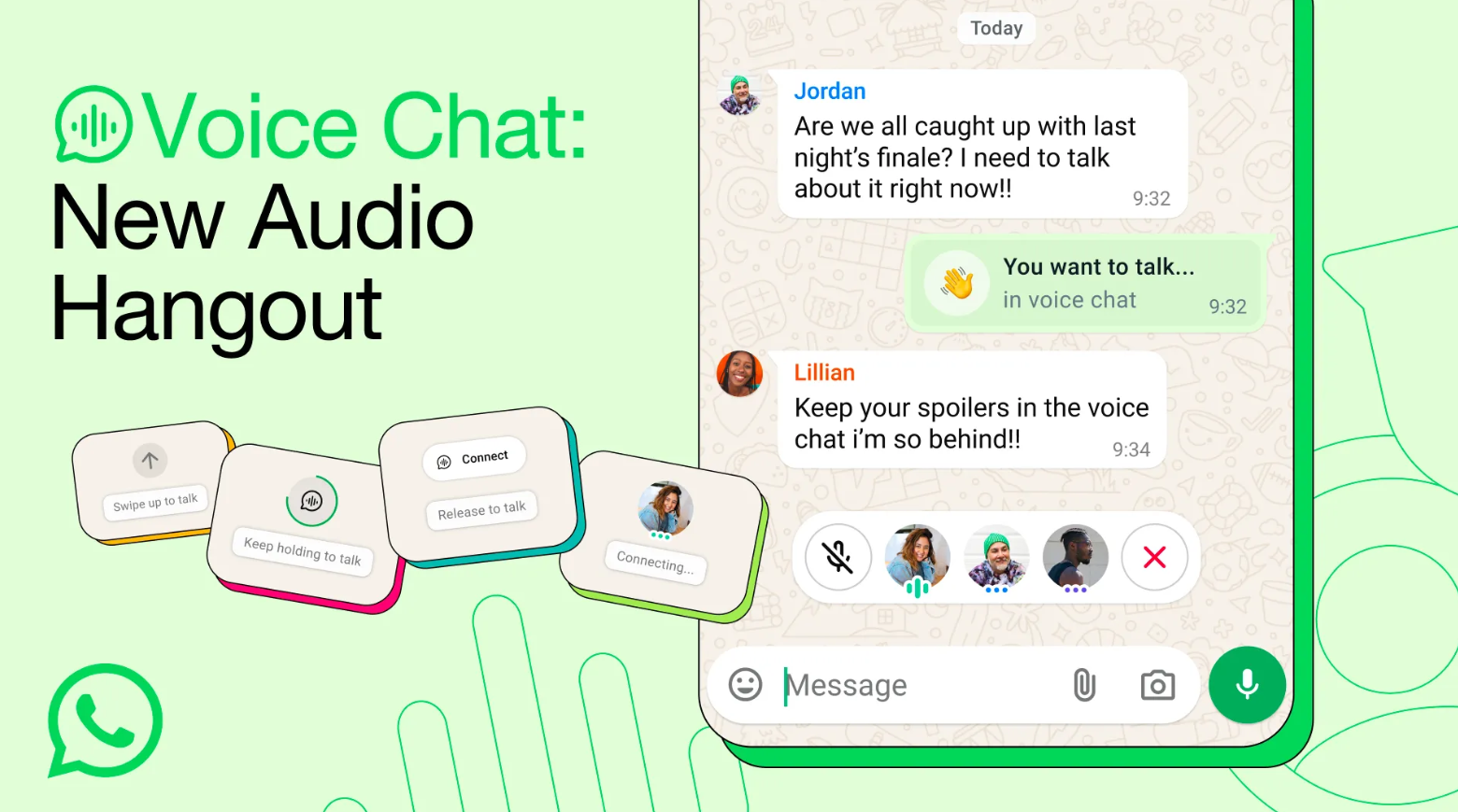 في 22 مايو 2025، أطلق واتساب ميزة الدردشة الصوتية المباشرة لجميع المجموعات، دون الحاجة لبدء مكالمة تقليدية، حيث تتيح هذه الميزة الانضمام والمغادرة بحرية، وتبقى مثبتة داخل الدردشة، مع تشفير شامل يضمن الخصوصية الكاملة للمشاركين.