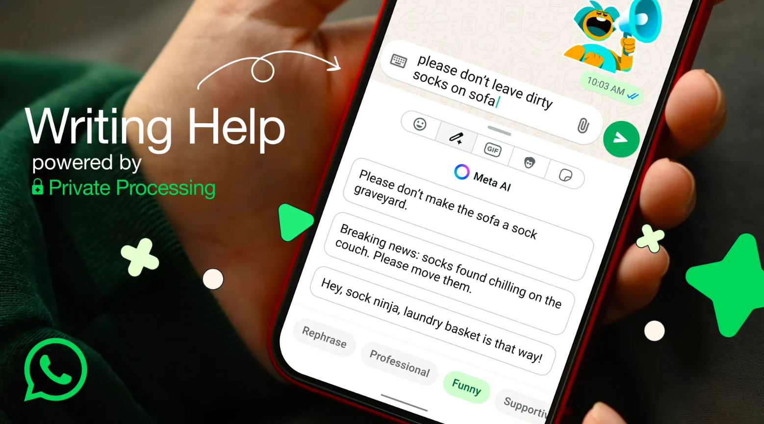 في 27 أغسطس 2025، قدم واتساب ميزة “مساعدة الكتابة” المدعومة بالذكاء الاصطناعي، لمساعدة المستخدمين على تحسين صياغة رسائلهم بأساليب مختلفة مثل الرسمية أو الودية، تعتمد الميزة على المعالجة الخاصة، ما يضمن بقاء الرسائل خاصة وغير قابلة للاطلاع من واتساب أو ميتا.