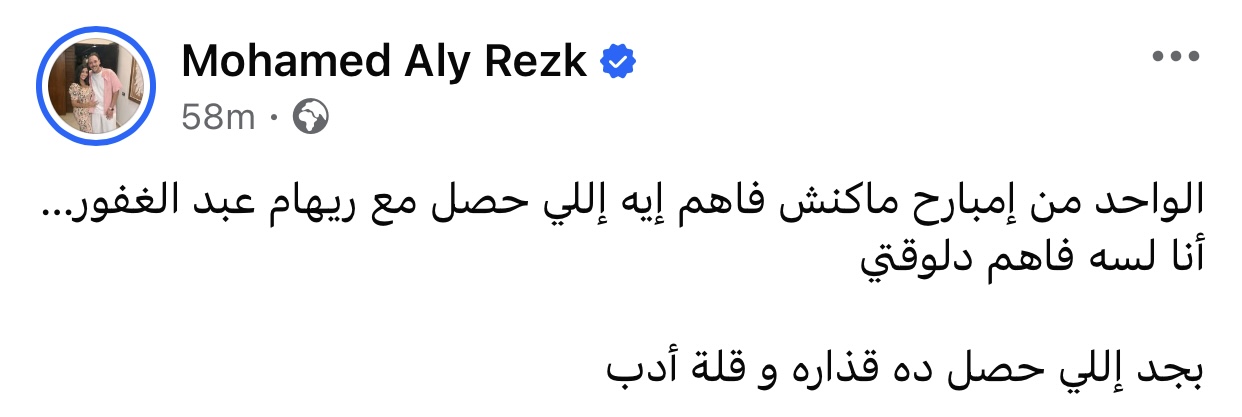 وكتب محمد رزق عبر حسابه الشخصي بموقع فيسبوك: "الواحد من إمبارح ماكنش فاهم إيه اللي حصل مع ريهام عبدالغفور، أنا لسة فاهم دلوقتي، بجد اللي حصل دة قذارة وقلة أدب".