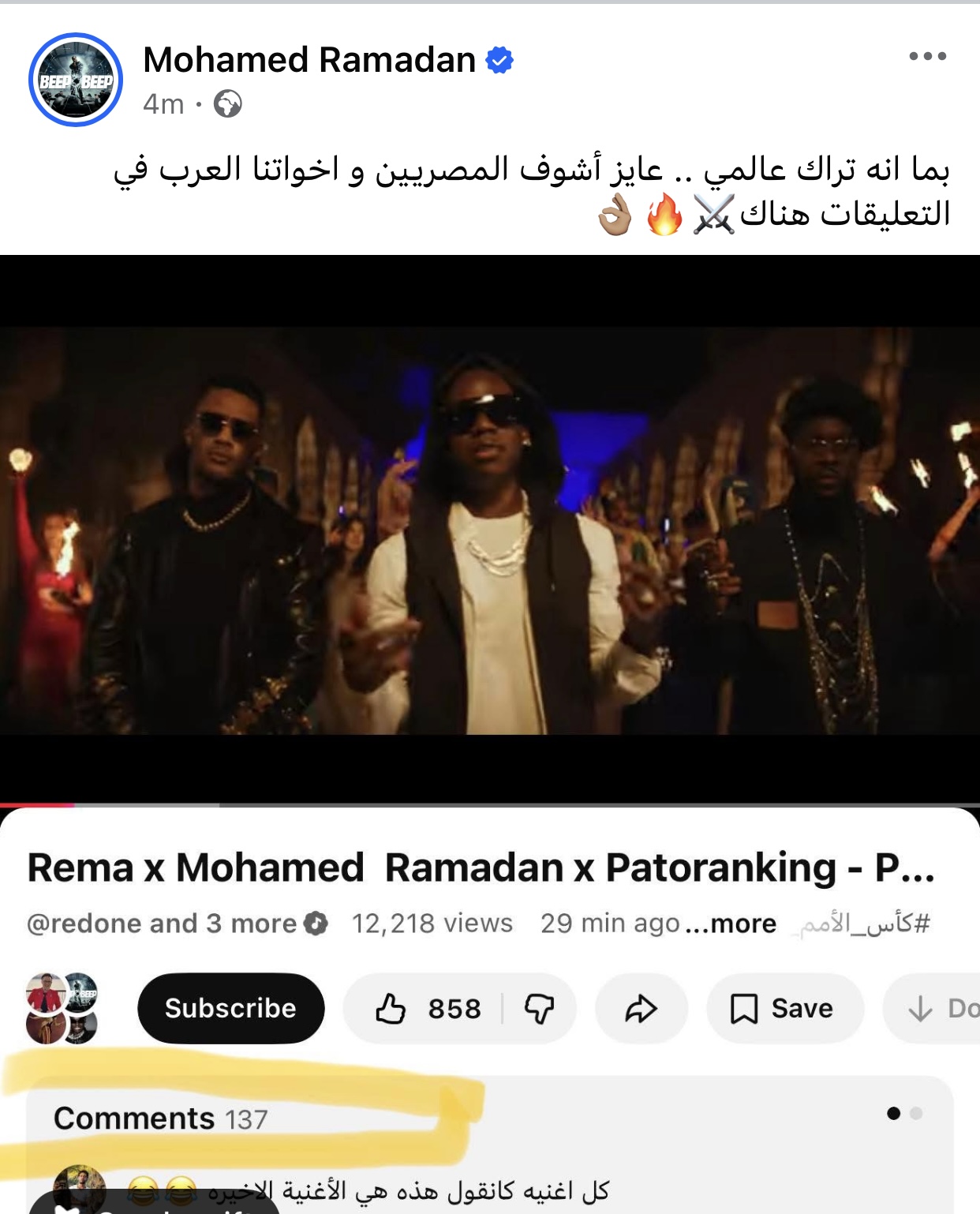 طلب الفنان محمد رمضان من متابعيه عبر حسابه الشخصي بموقع فيسبوك بالتعليق على الفيديو كليب أغنيته الجديدة لكأس الأمم الأفريقية.