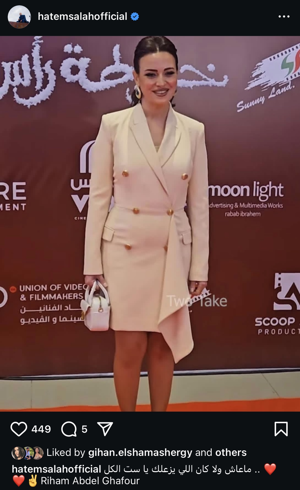 حرص الفنان حاتم صلاح على دعم الفنانة ريهام عبدالغفور بعد واقعة تصوير أحد الأشخاص لها دون علمها، في العرض الخاص لفيلمها الجديد"خريطة رأس السنه".